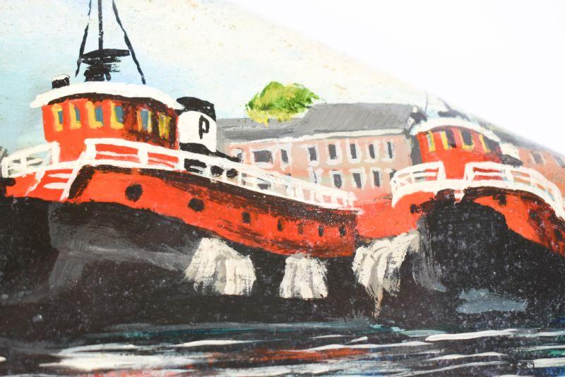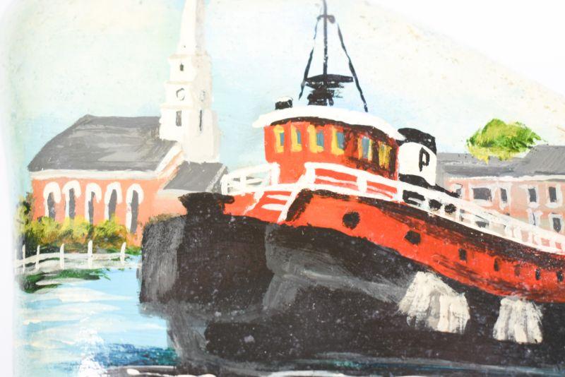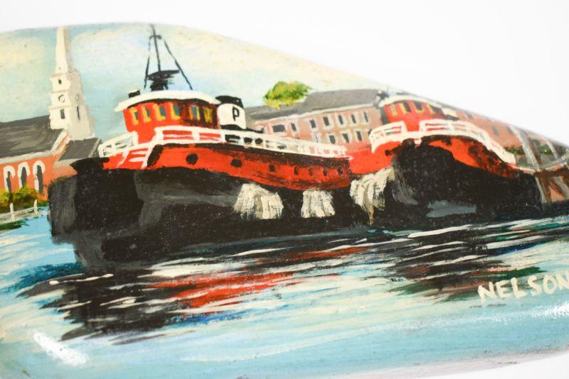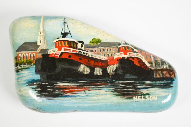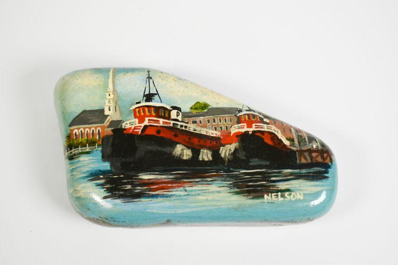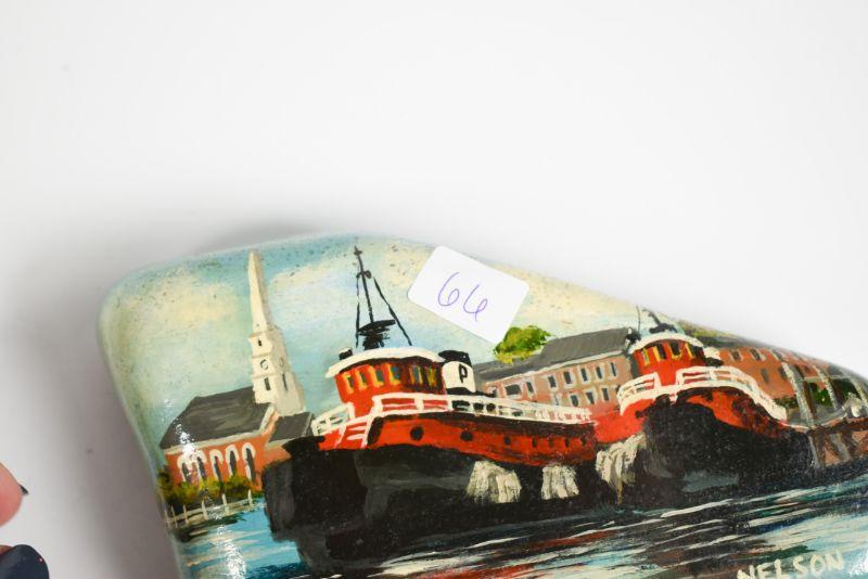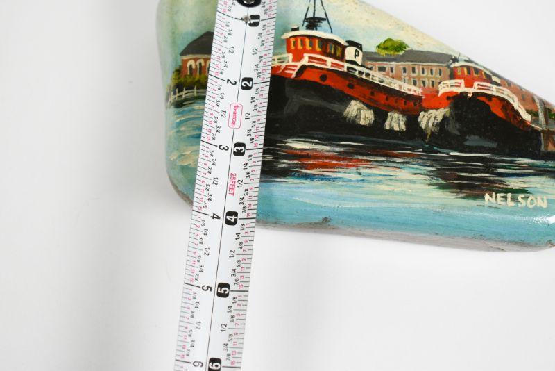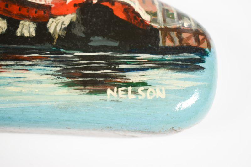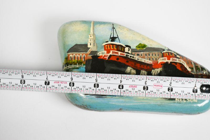 Rock is painted with boats and village scene, signed Nelson. 6.5x4 **Please read Terms and Conditions before placing a bid. Pick up is Sunday, December 22 from 11am to 3pm or Monday, December 23 from 4pm-7pm in Mantua, NJ. All sales are final. All sales are as is, where is. Please review all photos. Props are not included. Measurements are approximate.