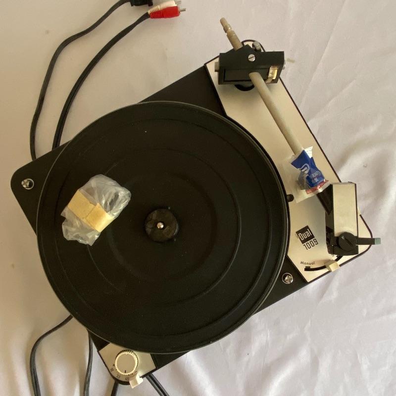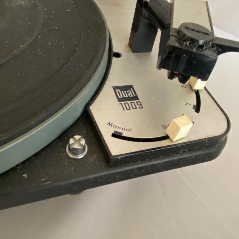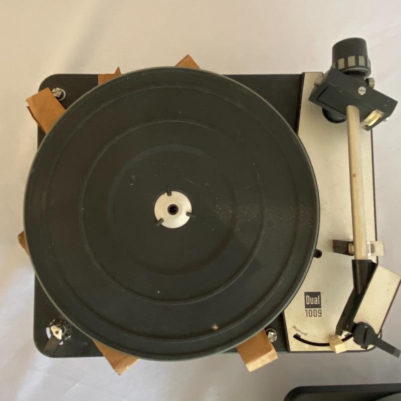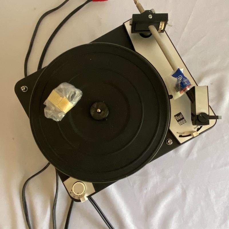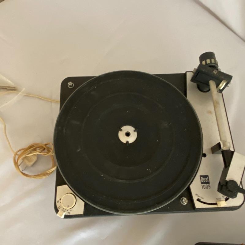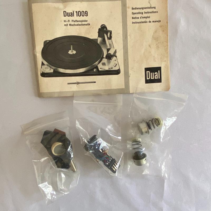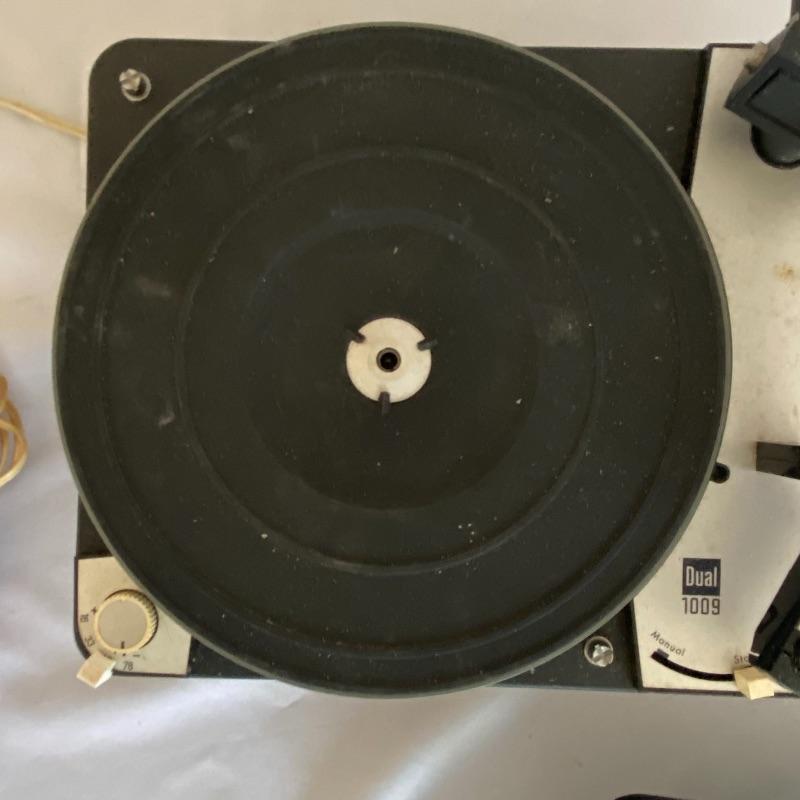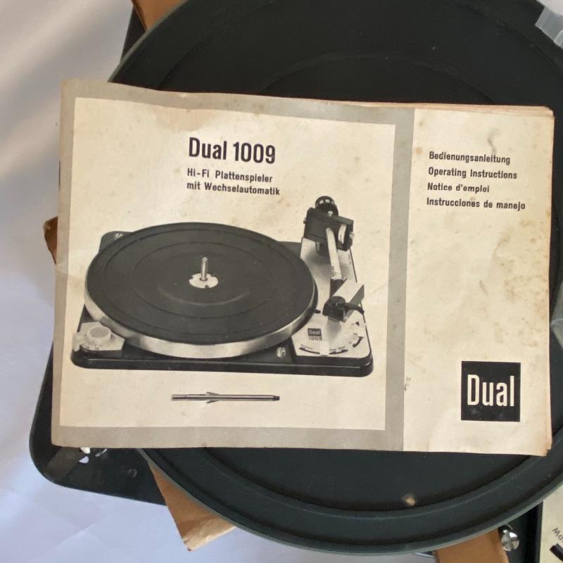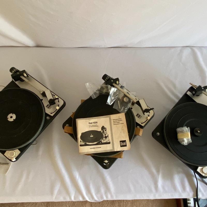 Lot includes three separate stand-alone Dual turntables model number 1008 and 1009. Two turntables include cords and hum when plugged in. One does not include original cords. Lot includes Dual owner manual and parts for replacements and repairs. See photos.