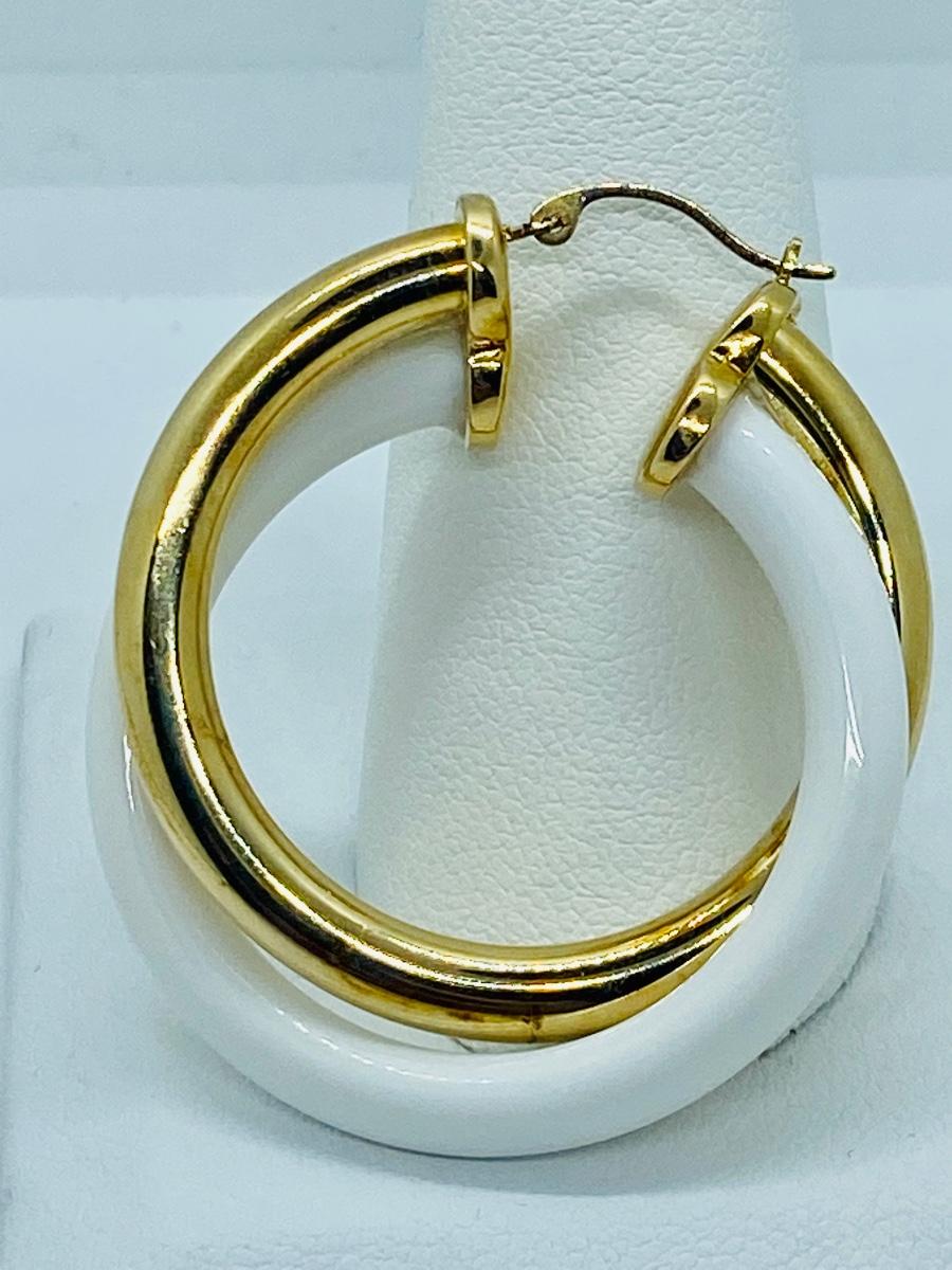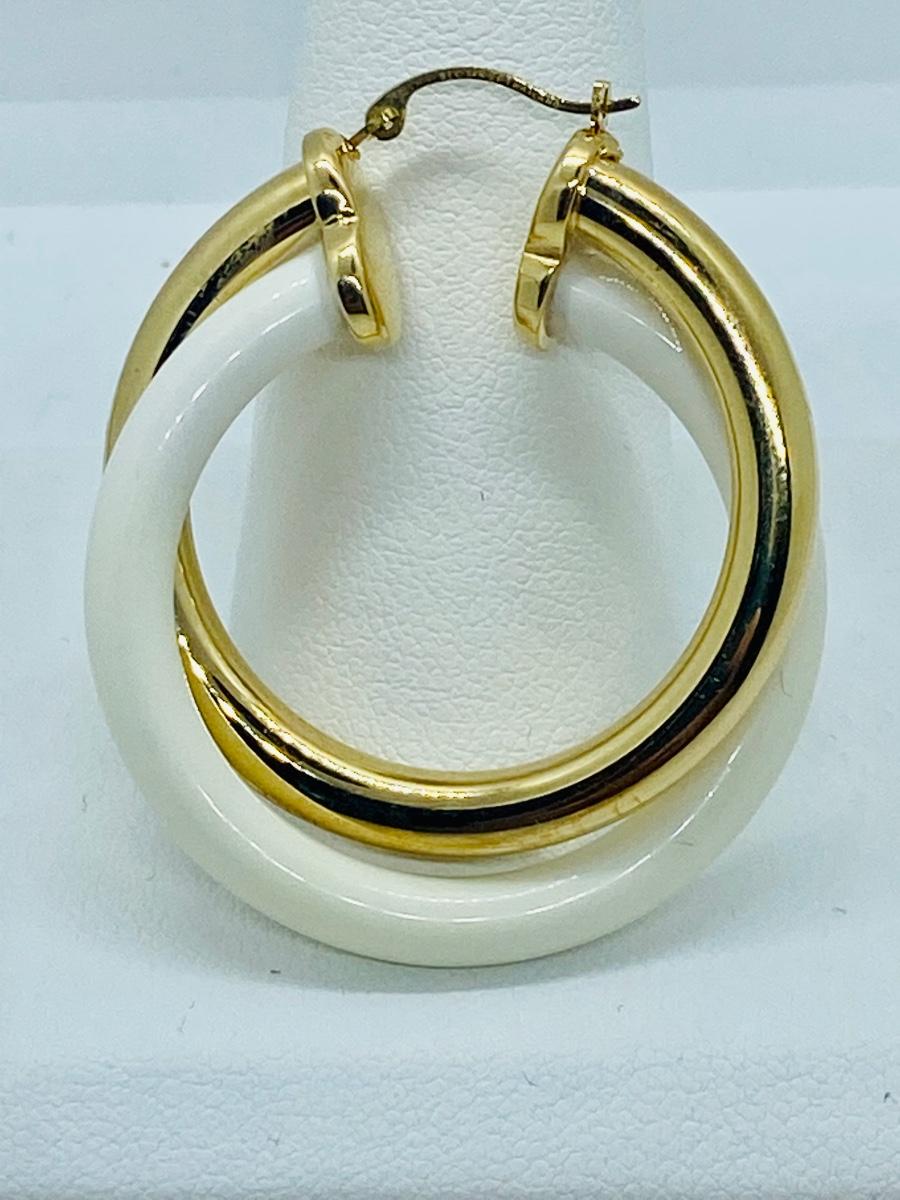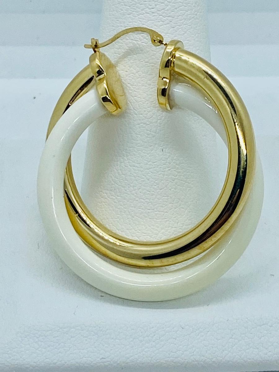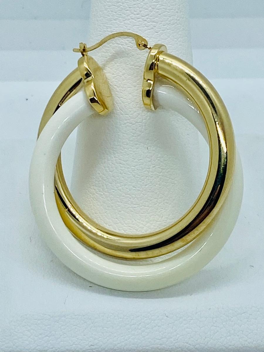 Lovely pair of 14k yellow electroform gold and white agate gemstone double hoop, "twisted" pierced earrings. 8.2 grams in weight. Please see all pictures as they are the best representation of the items. The pictures show condition, measurements if taken, and what is included in the lot. Due to the large amount that we photograph and the time frame, we are not always able to take measurements. All items unless noted, are pre-owned and have been used.