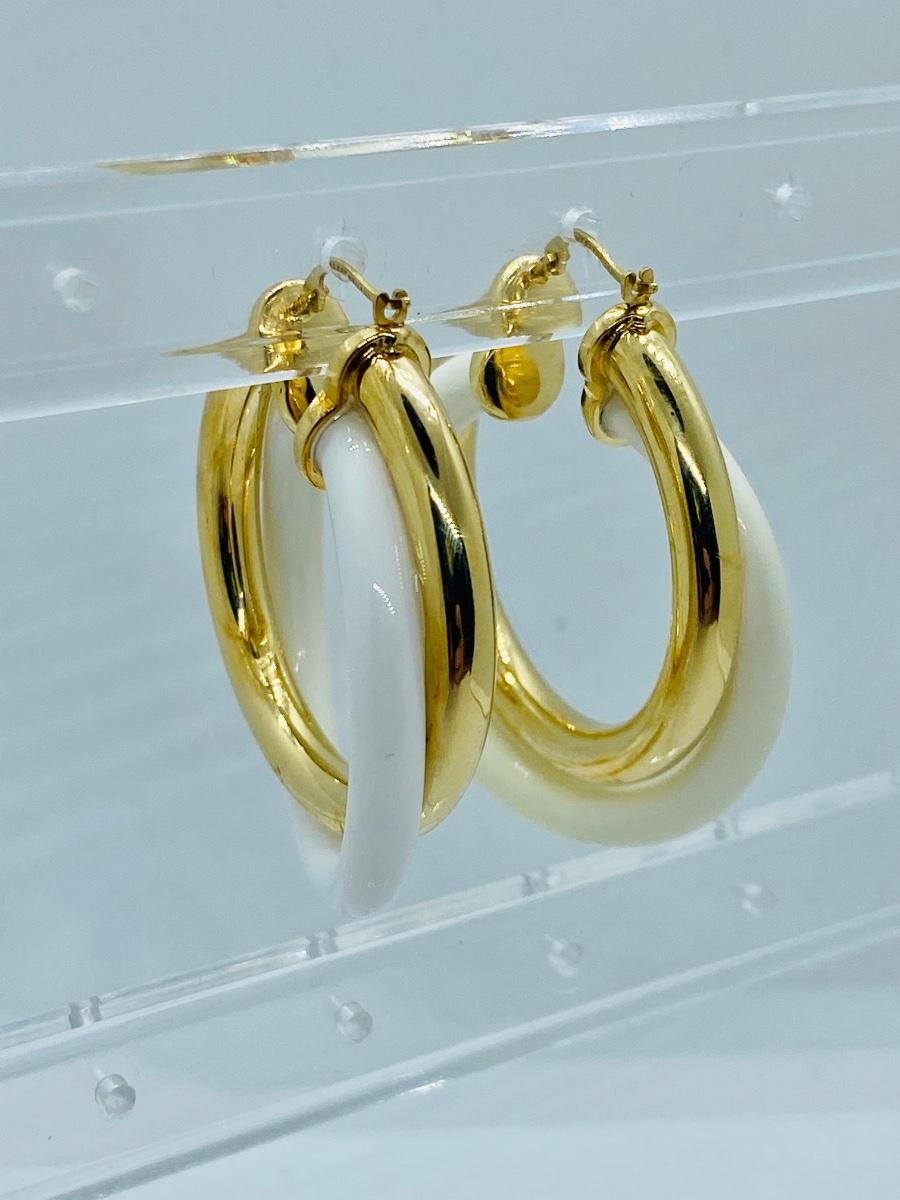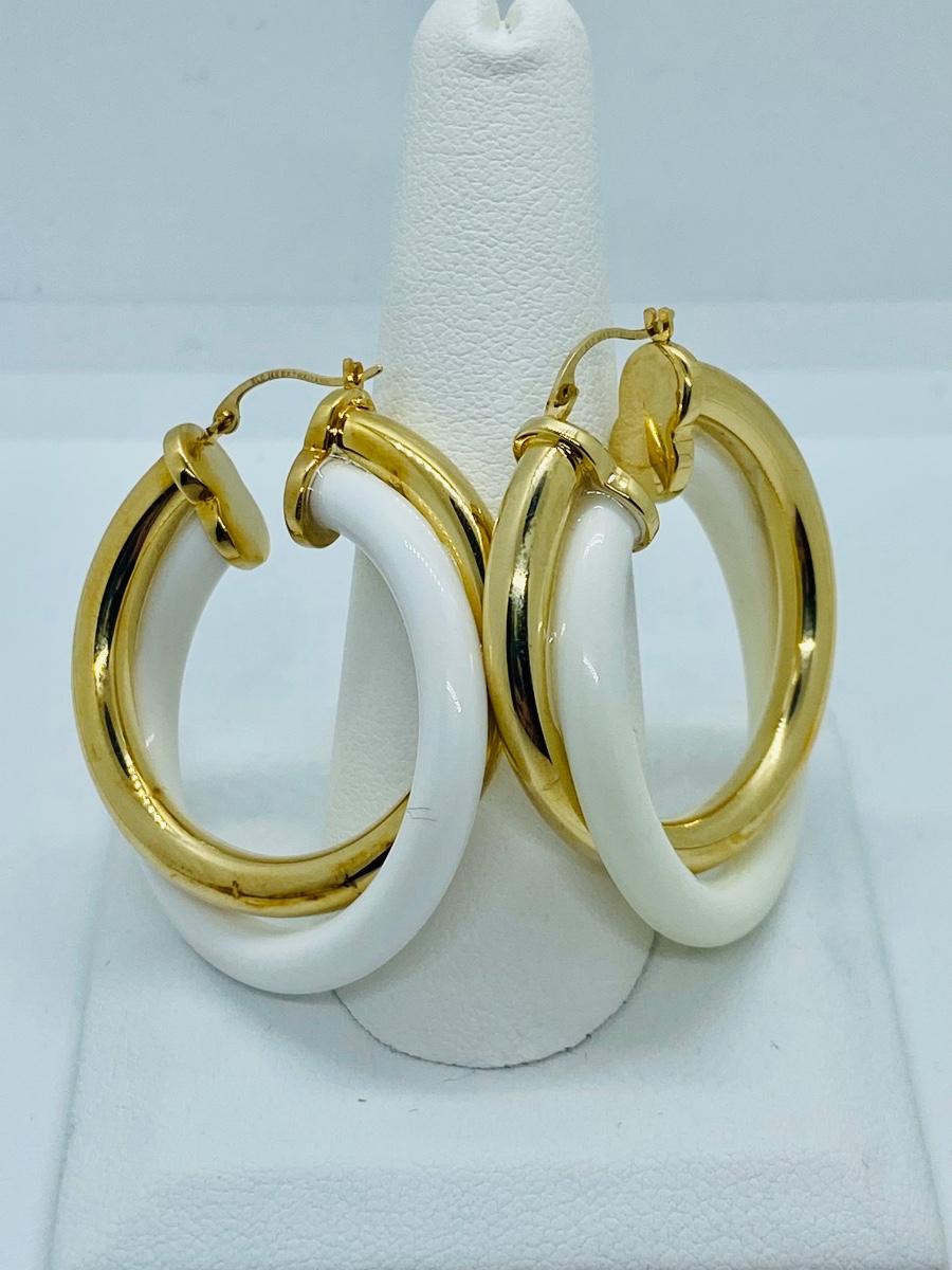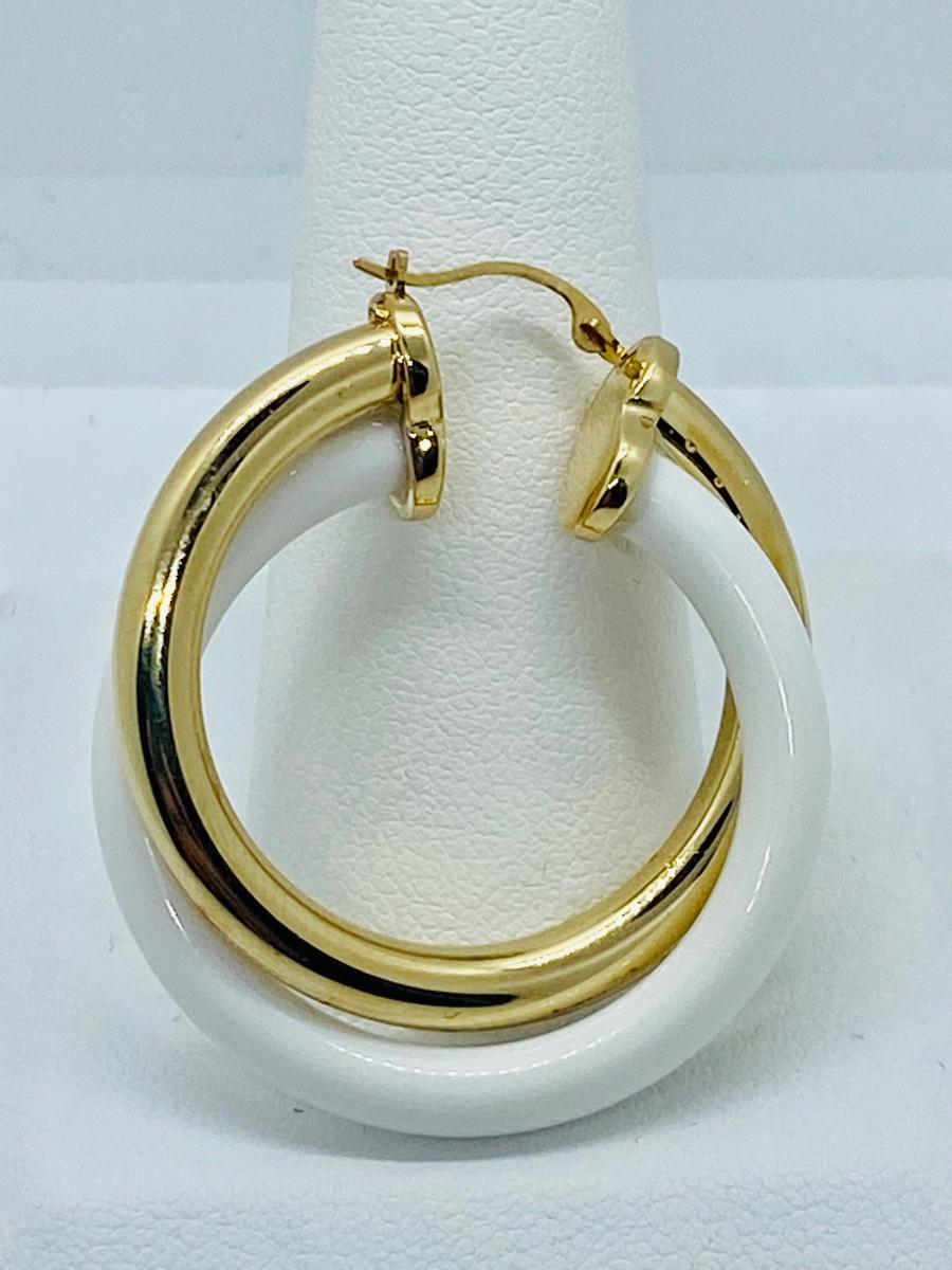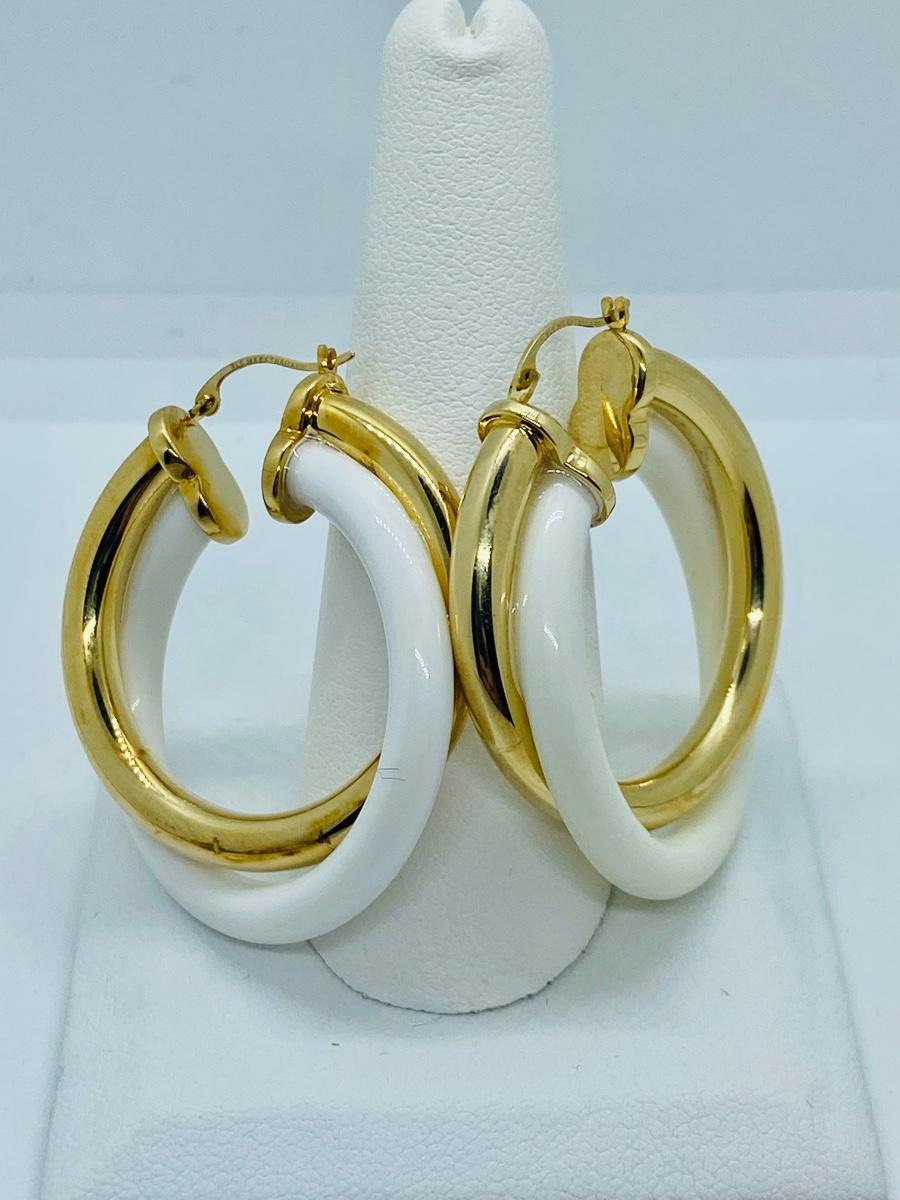 Lovely pair of 14k yellow electroform gold and white agate gemstone double hoop, "twisted" pierced earrings. 8.2 grams in weight. Please see all pictures as they are the best representation of the items. The pictures show condition, measurements if taken, and what is included in the lot. Due to the large amount that we photograph and the time frame, we are not always able to take measurements. All items unless noted, are pre-owned and have been used.