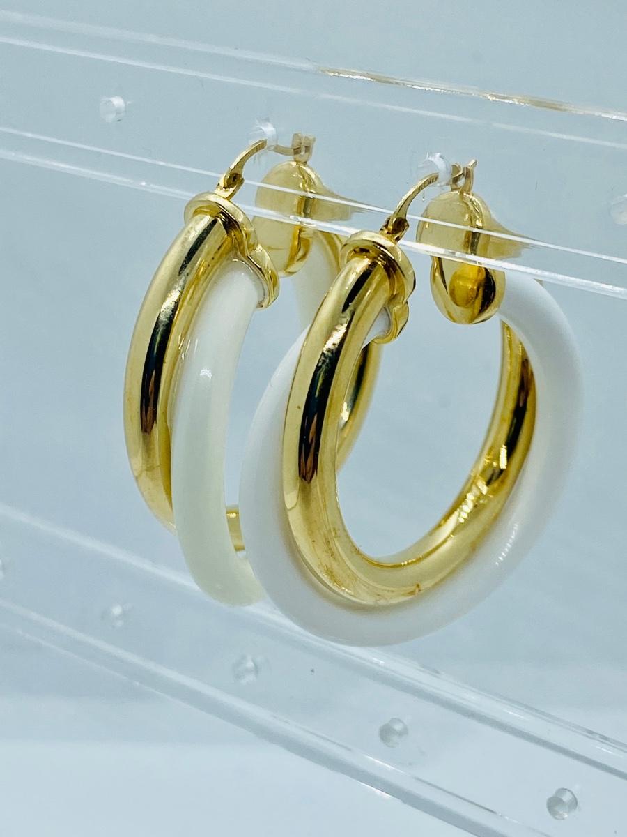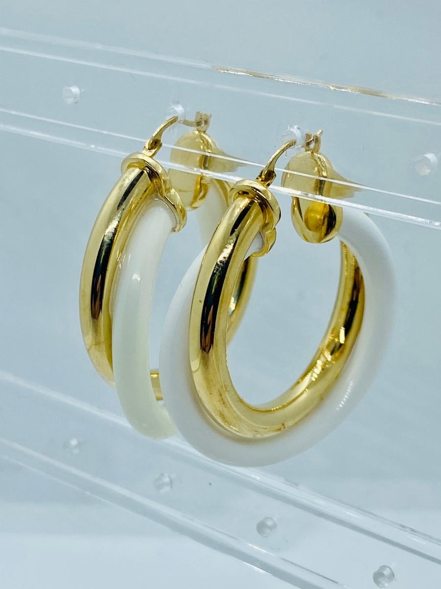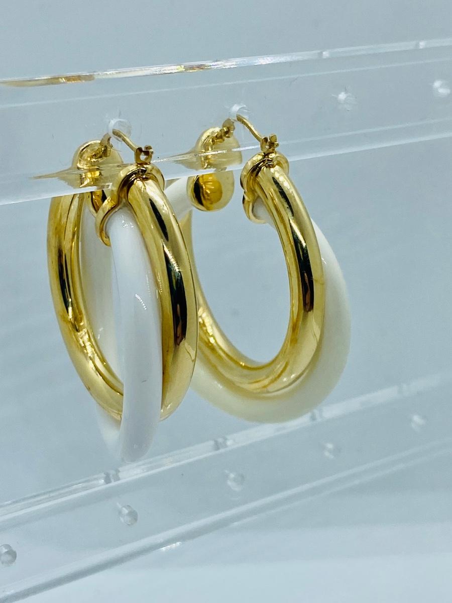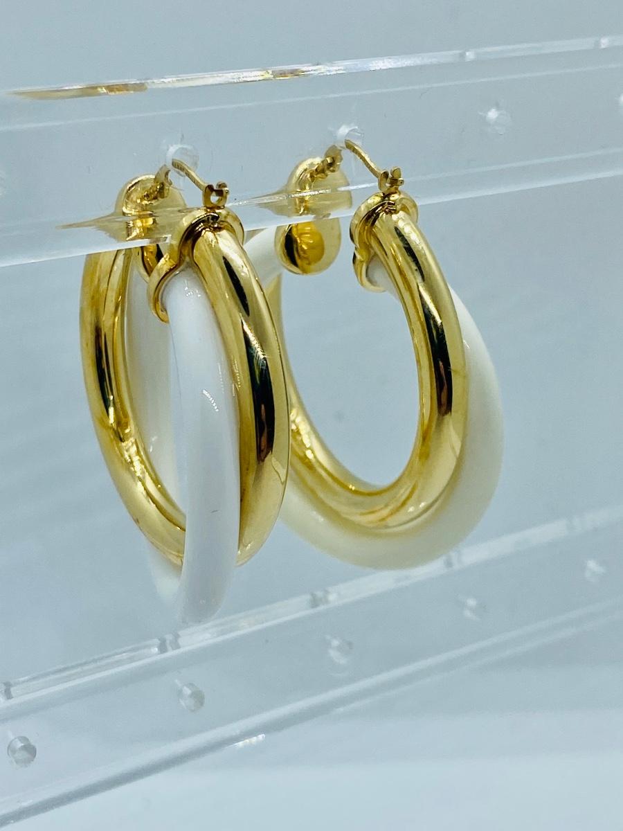 Lovely pair of 14k yellow electroform gold and white agate gemstone double hoop, "twisted" pierced earrings. 8.2 grams in weight. Please see all pictures as they are the best representation of the items. The pictures show condition, measurements if taken, and what is included in the lot. Due to the large amount that we photograph and the time frame, we are not always able to take measurements. All items unless noted, are pre-owned and have been used.