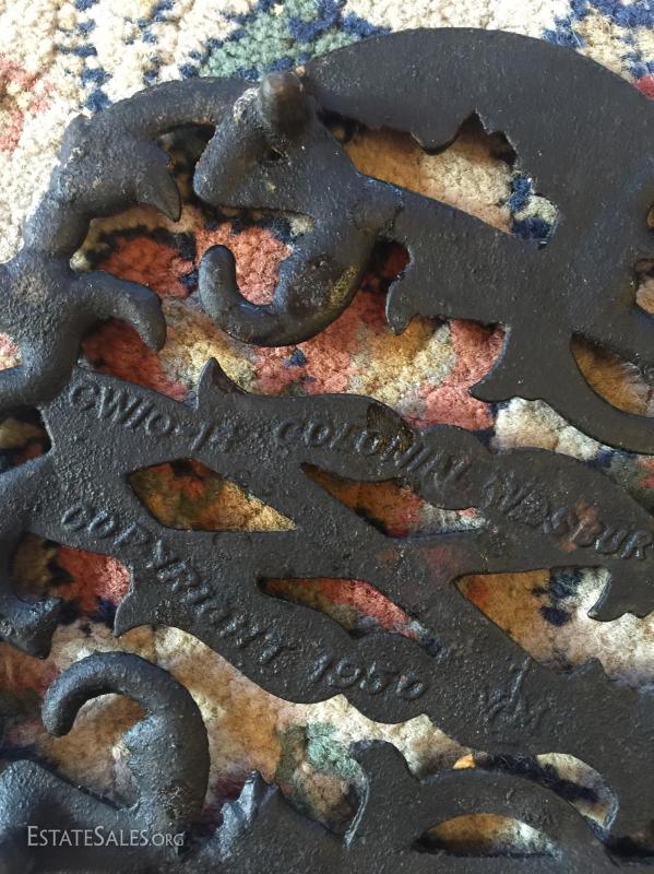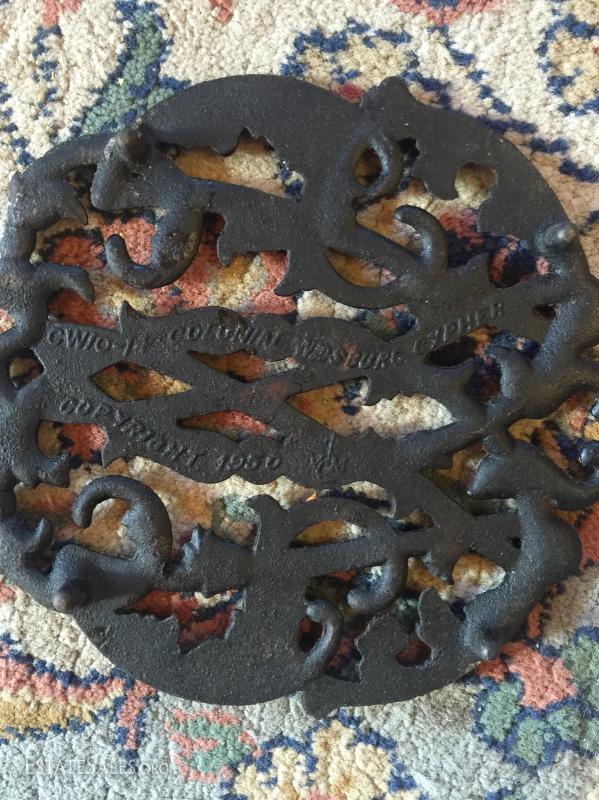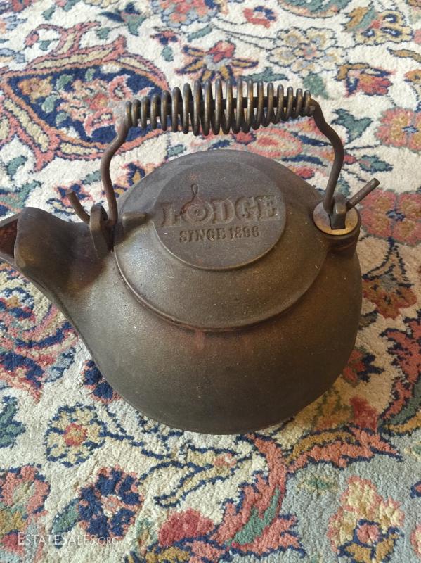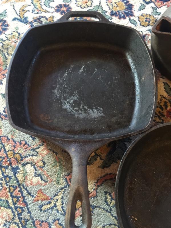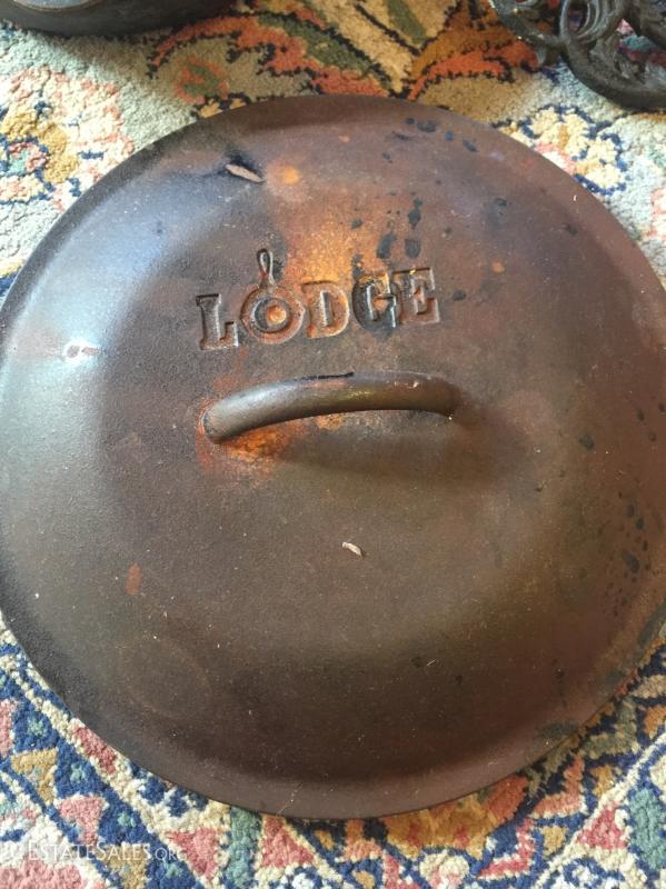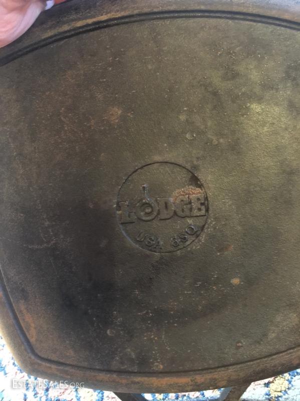 7 Wrought iron pieces, : 1 Lodge Kettle, square skillet by Lodge, 6sk skillet Lodge, misc Lodge lid, 1 trivet and 2 misc flat skillets