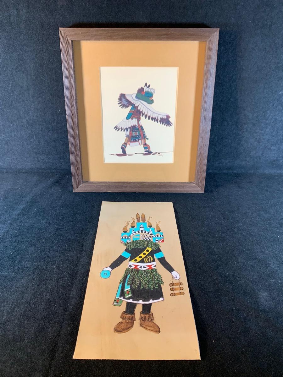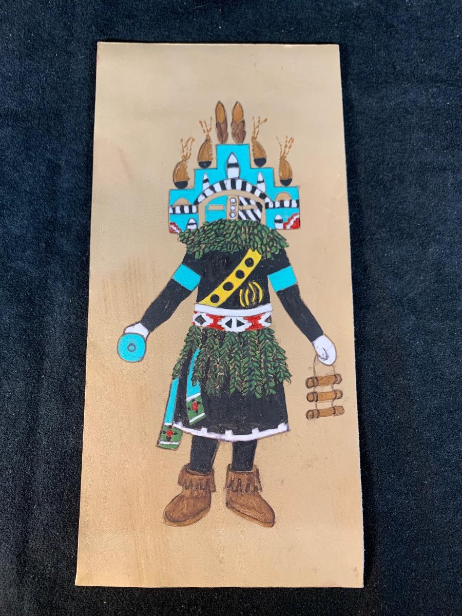 American Indian framed picture measures 10 7/8" x 12". Hand painted American Indian on a piece of leather measures 5 3/4" x 12".