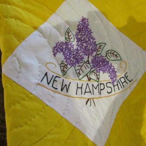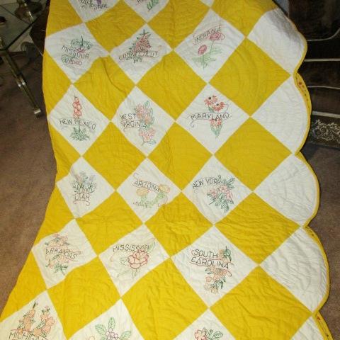 THIS DOUBLE SIZE HAND STITCHED QUILT HAS THE US STATES EMBROIDERED IN EACH BLOCK
