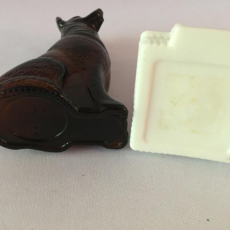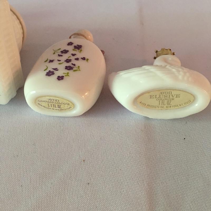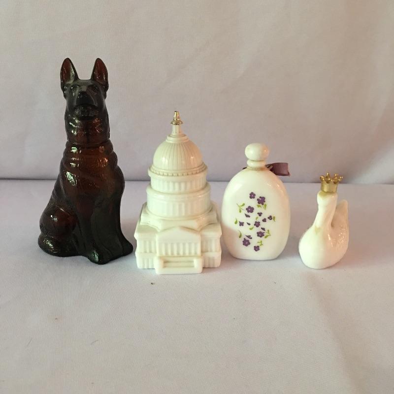 Avon collectibles. Lot includes German Shepherd dog, dome city building, swan and small bottle. Some have a small bit of liquid in them but we can not verify contents.