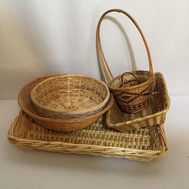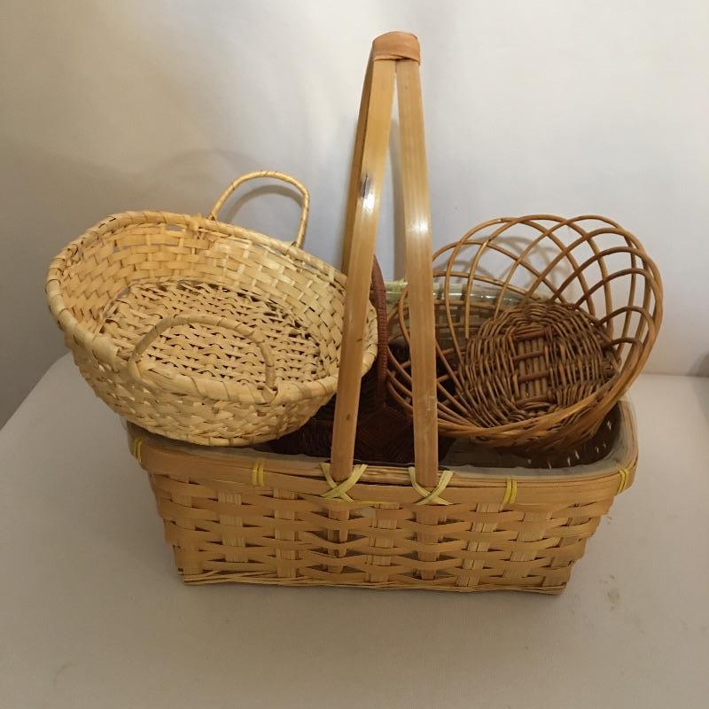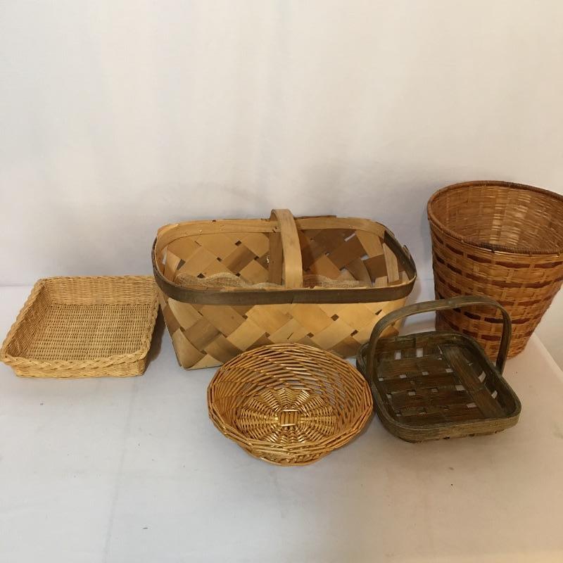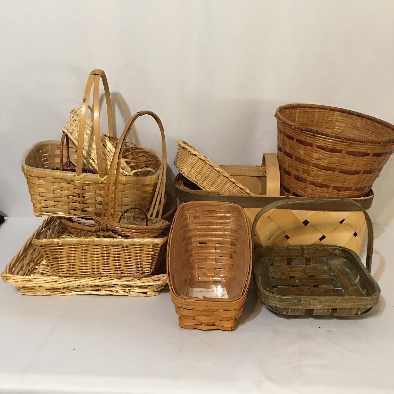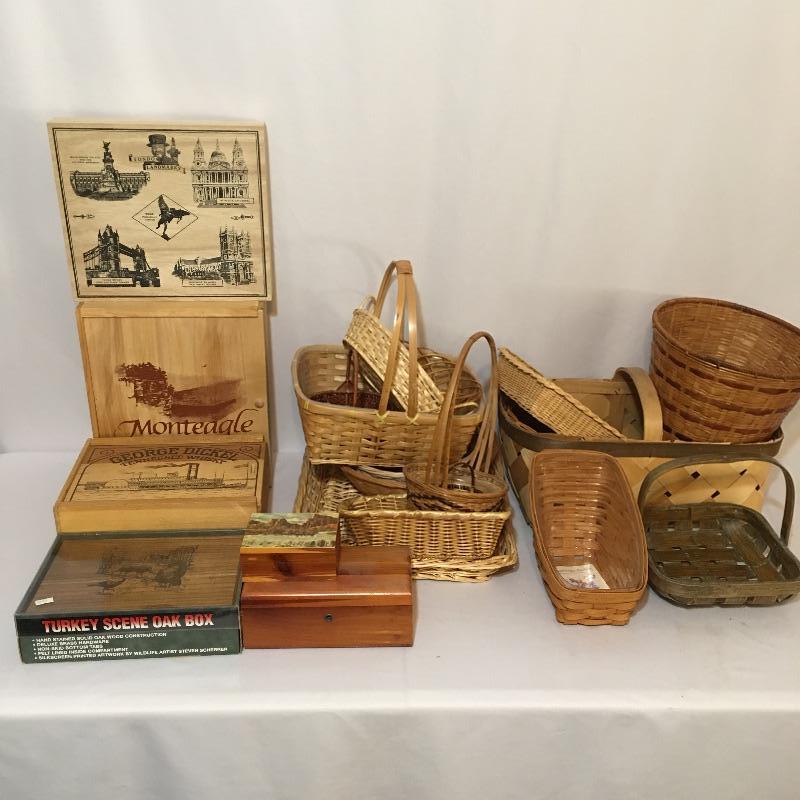 Baskets and boxes. Lot includes boxes with logos of Monteagle, George Dickel, London Landmarks and more boxes. Also includes a sloping Longaberger Basket and a large variety of baskets in a multitude of sizes and shapes. A great lot for all you basket lovers out there. Largest box measures 11.5” x 13.75” x 4.25”.