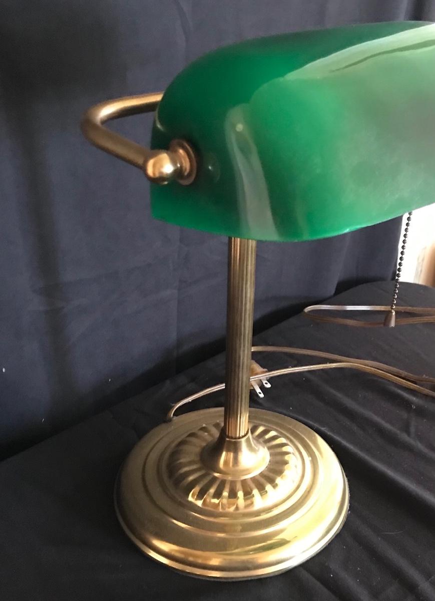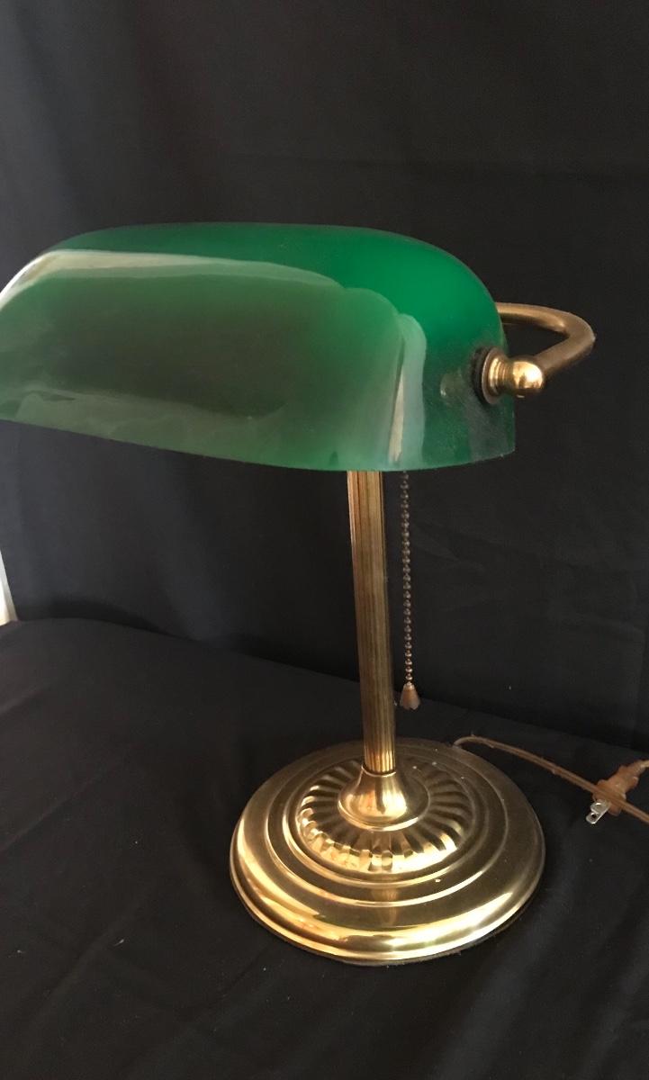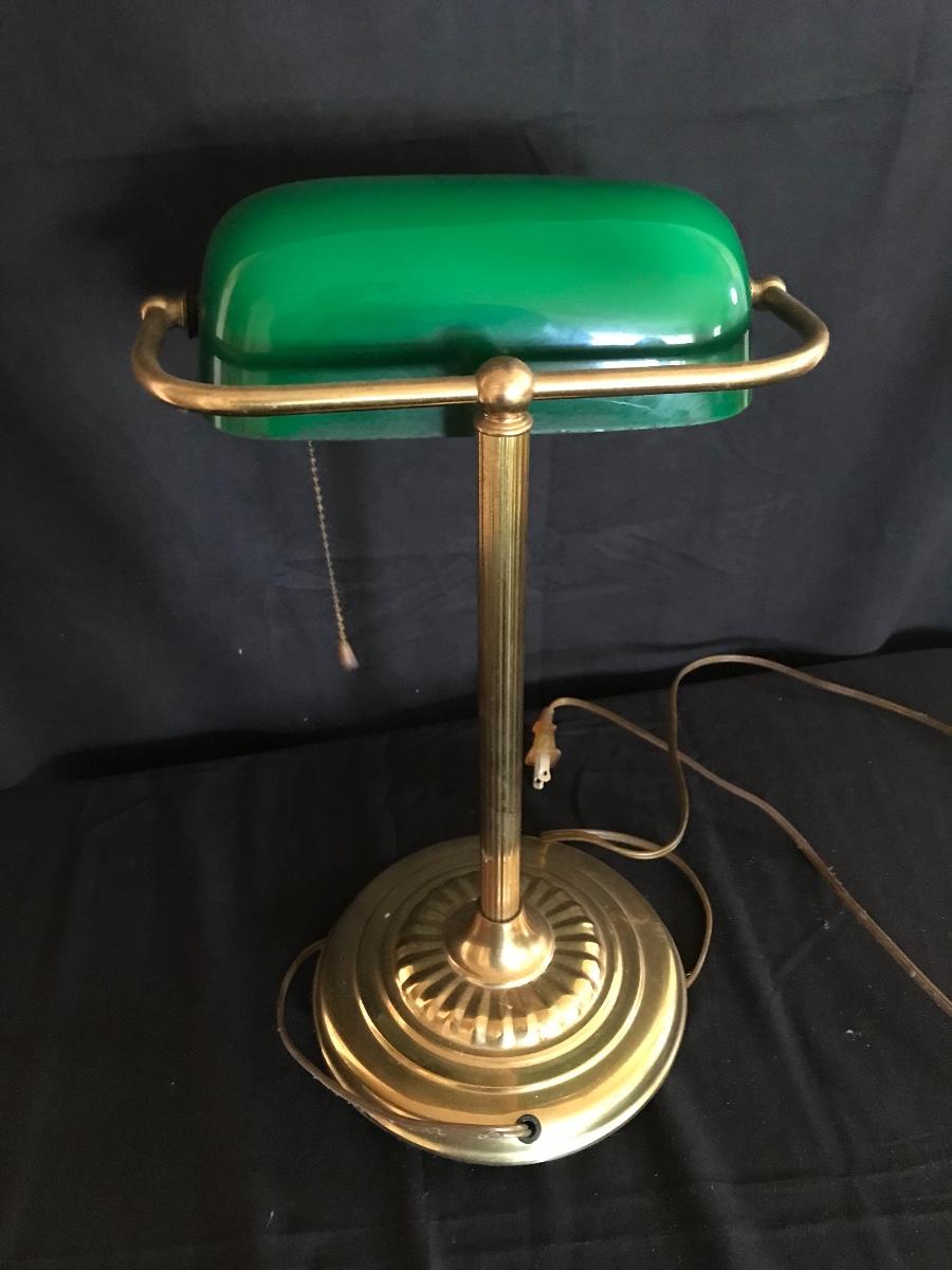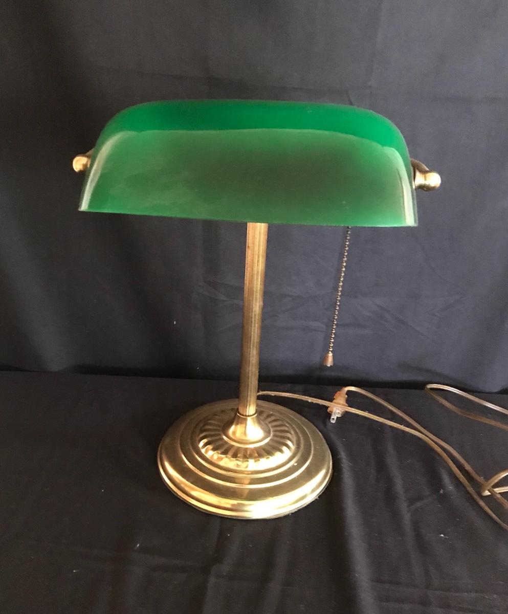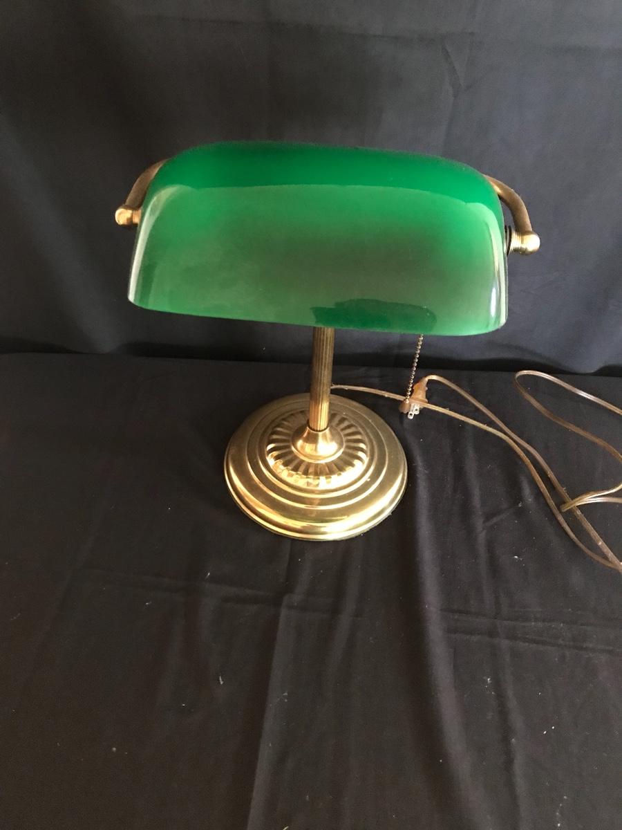 Brass Vintage Bankers Desk Lamp - green glass shade is 13 inches wide and base is approximately eight inches in diameter. Stand 16 inches tall. Working condition. The pictures show condition, measurements if taken, and what is included in the lot. Due to the large amount that we photograph and the time frame, we are not always able to take measurements. All items unless noted, are pre-owned and have been used. If you purchased furniture, you must bring help. We do not allow one person to carry large furniture out on their own. Bring help, tools and a truck for the safety of our client’s homes, and your personal safety. Company policy. Thank you.