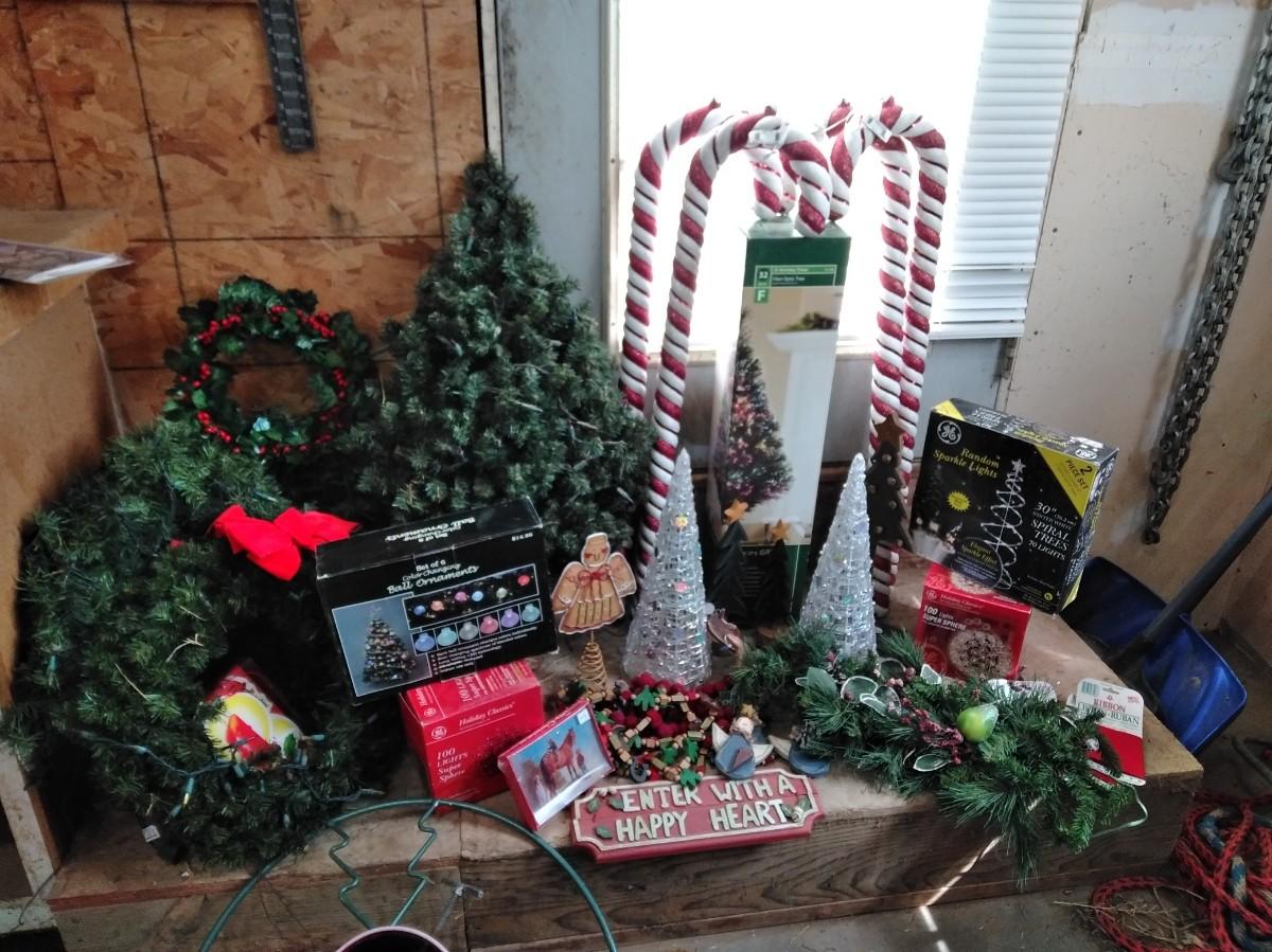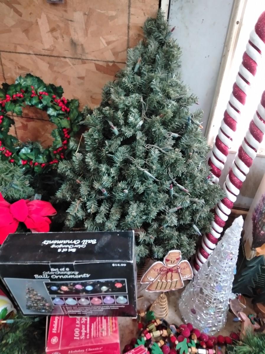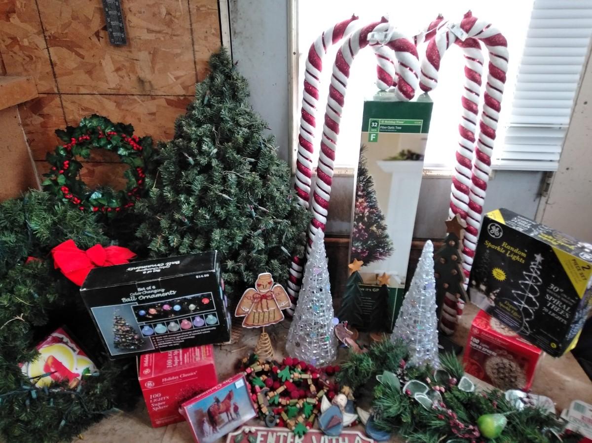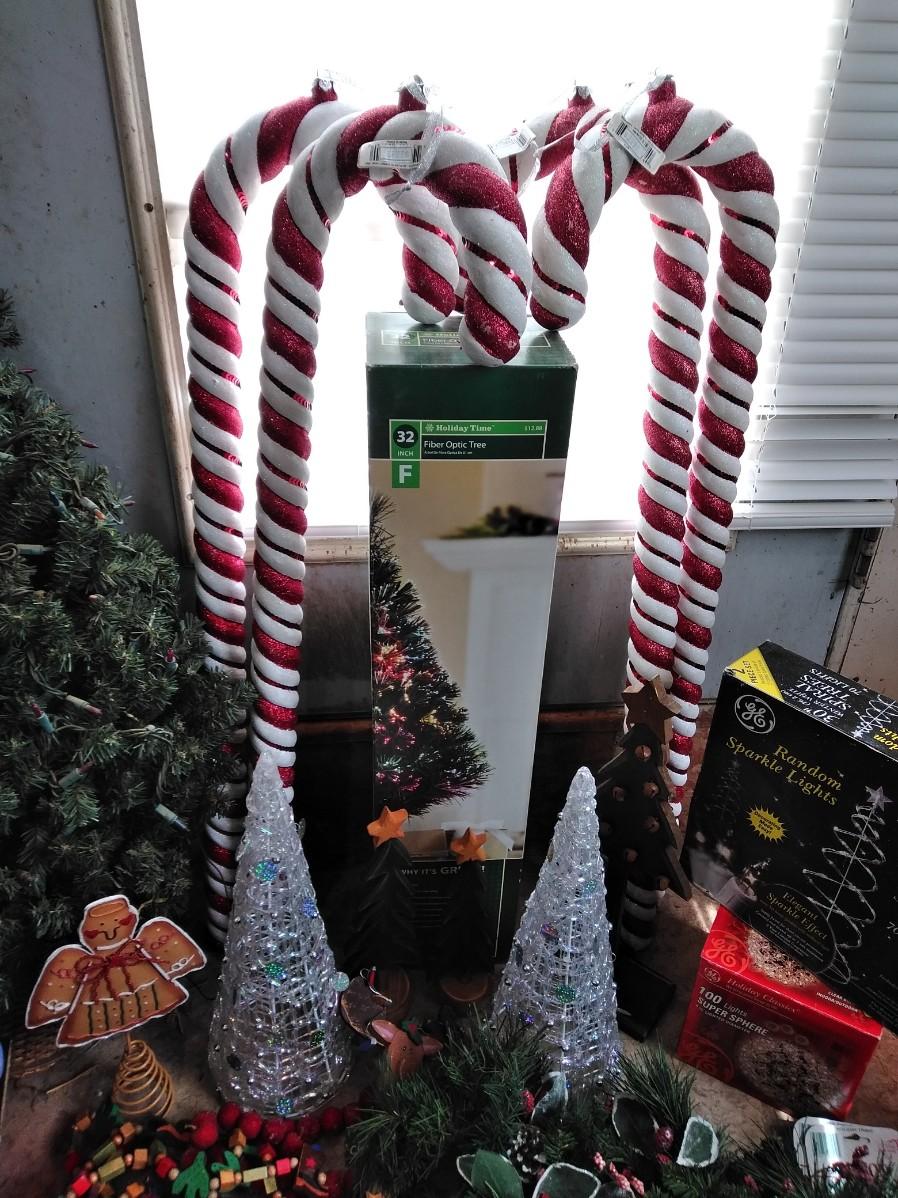 FAUX FIBER OPTIC CHRISTMAS TREE, CHRISTMAS TREE STAND, ORNAMENTS, HOME DECOR, LIGHT UP SPHERE, FOUR LARGE CANDY CANES, AND MORE