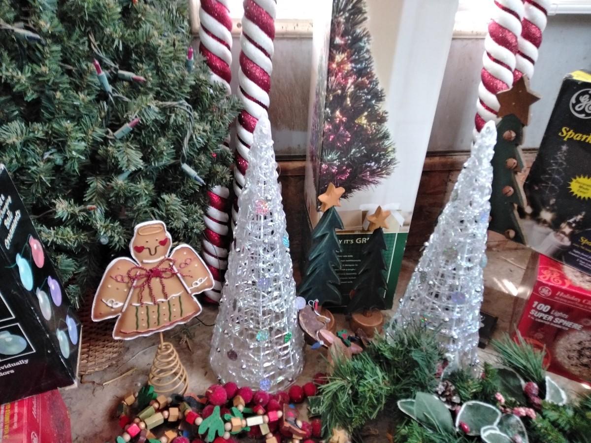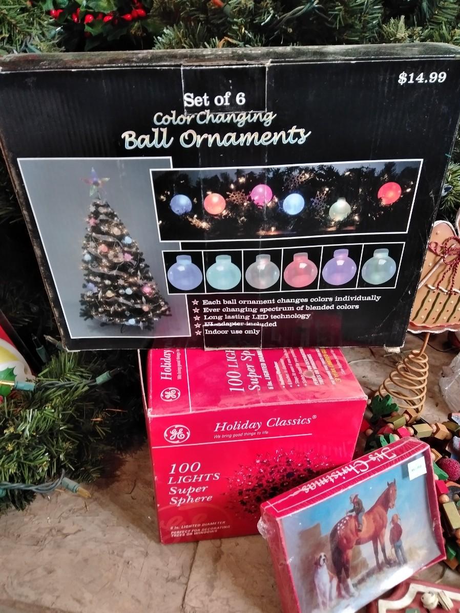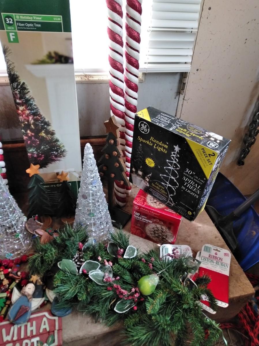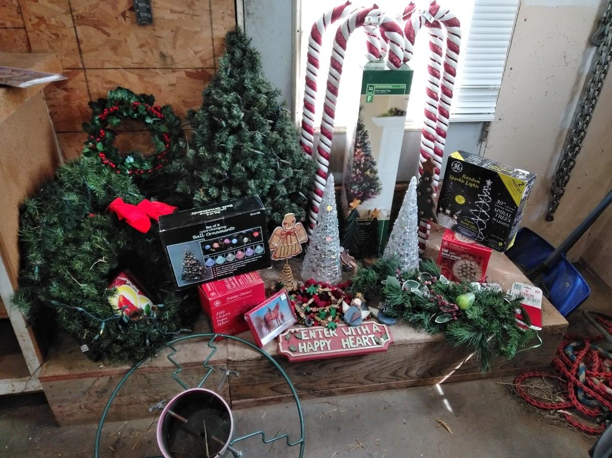 FAUX FIBER OPTIC CHRISTMAS TREE, CHRISTMAS TREE STAND, ORNAMENTS, HOME DECOR, LIGHT UP SPHERE, FOUR LARGE CANDY CANES, AND MORE