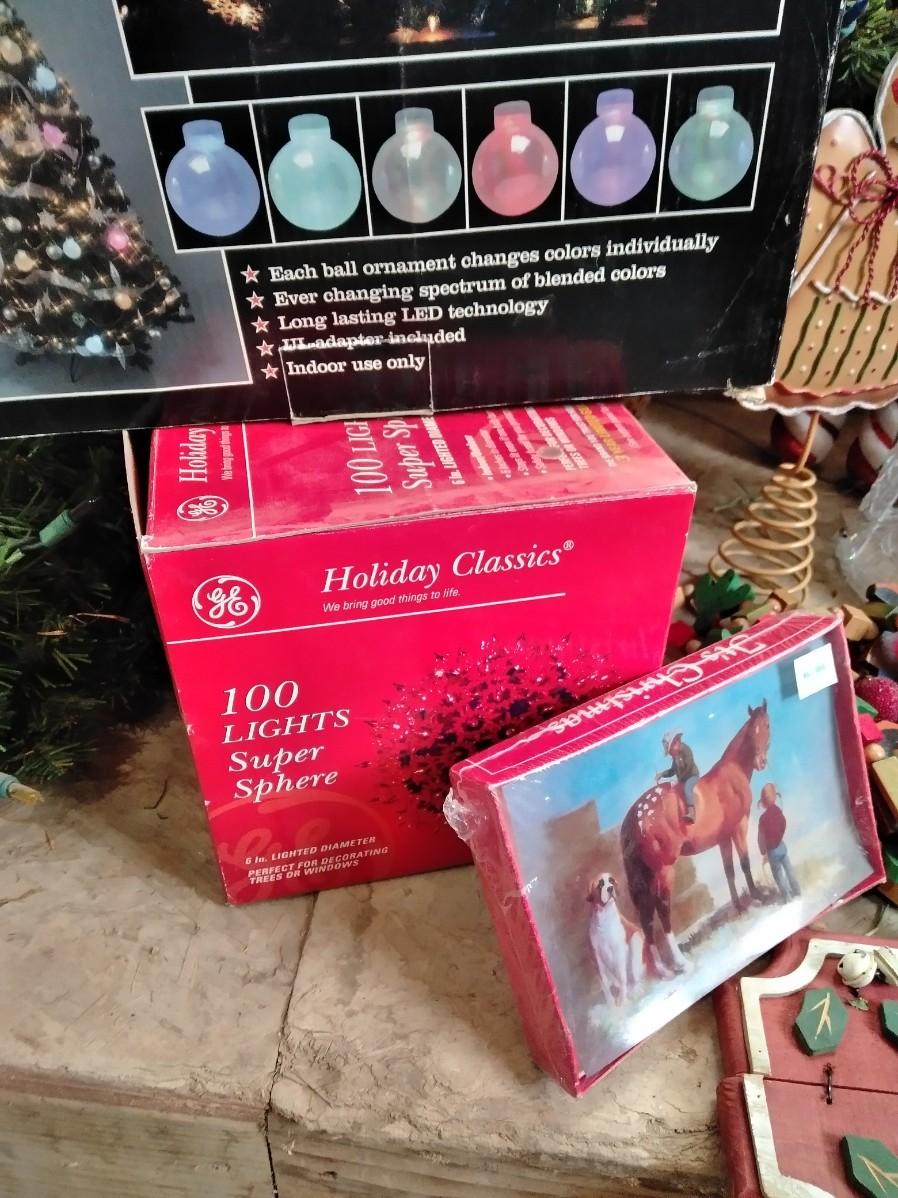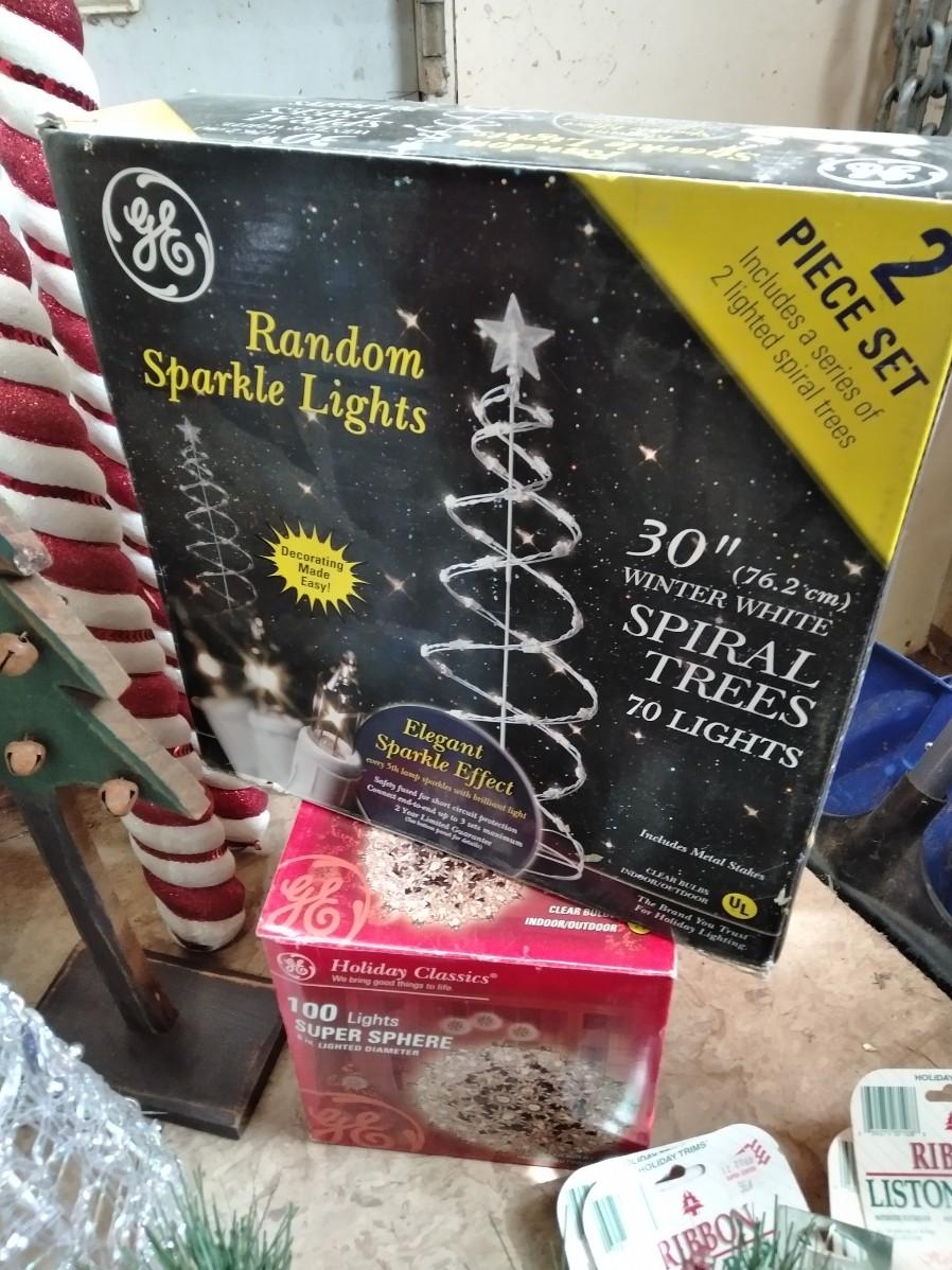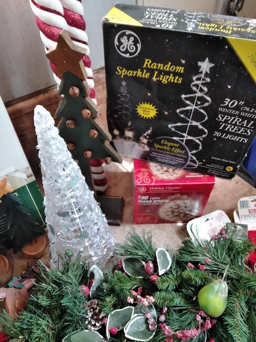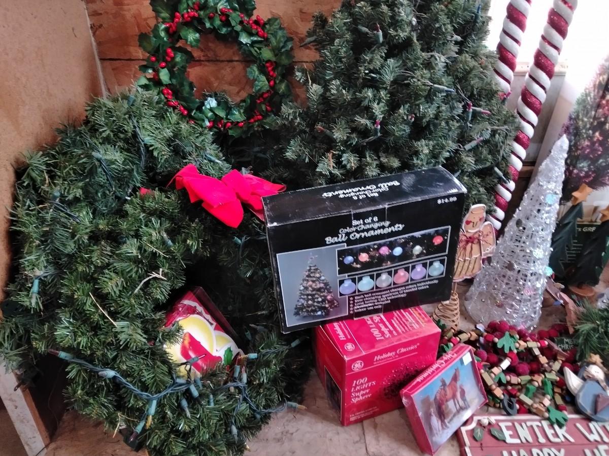 FAUX FIBER OPTIC CHRISTMAS TREE, CHRISTMAS TREE STAND, ORNAMENTS, HOME DECOR, LIGHT UP SPHERE, FOUR LARGE CANDY CANES, AND MORE