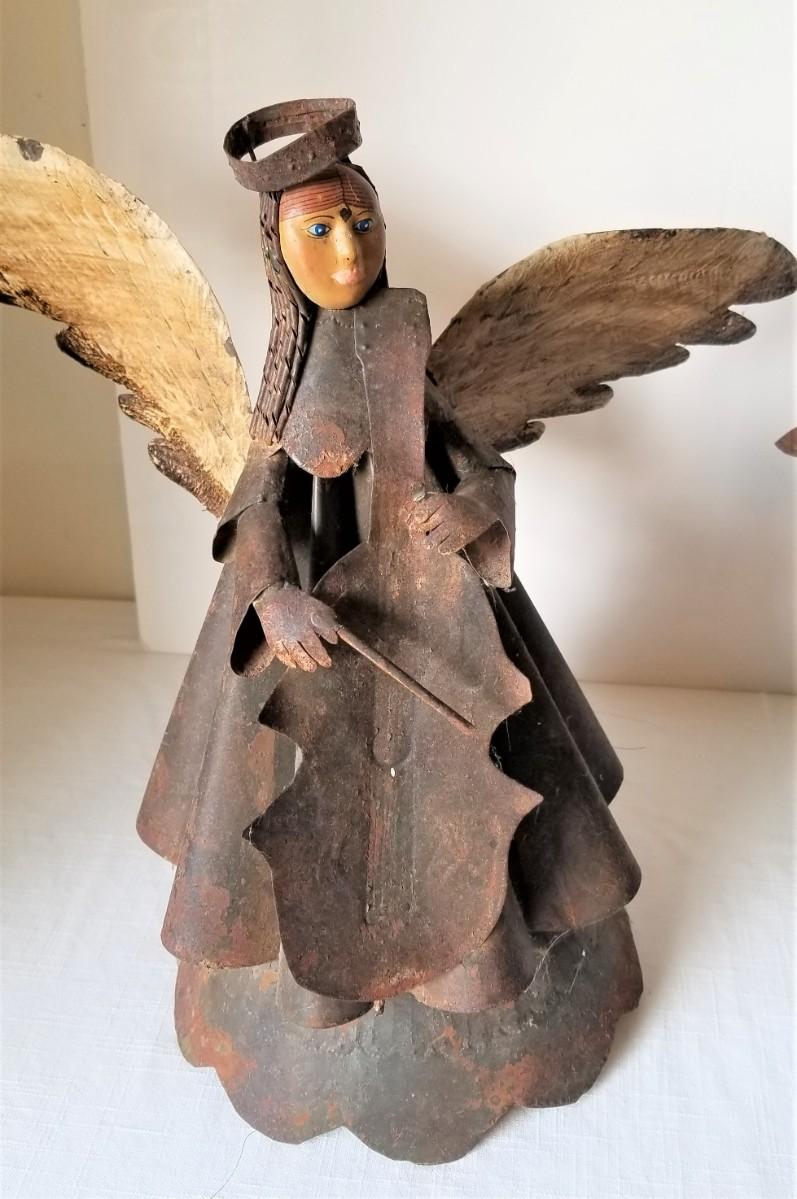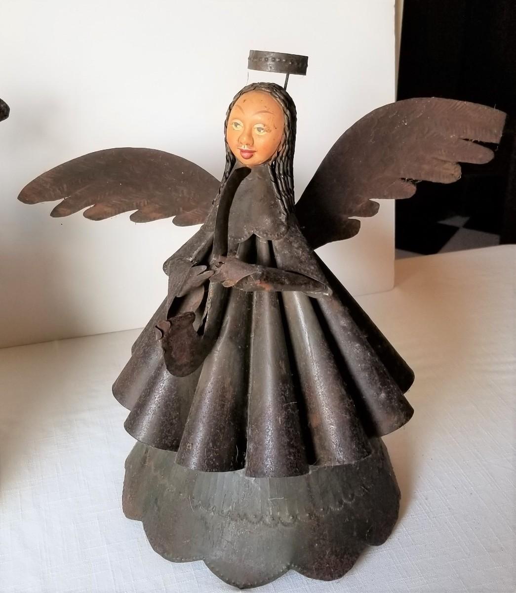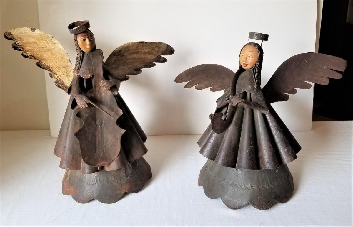 For Christmas or anytime - nice set of two metal angels with instruments (cello/horn). Wings will lift off the back. Each 15" tall. Gently used.