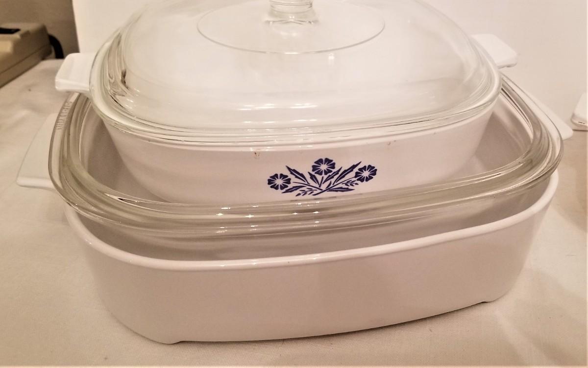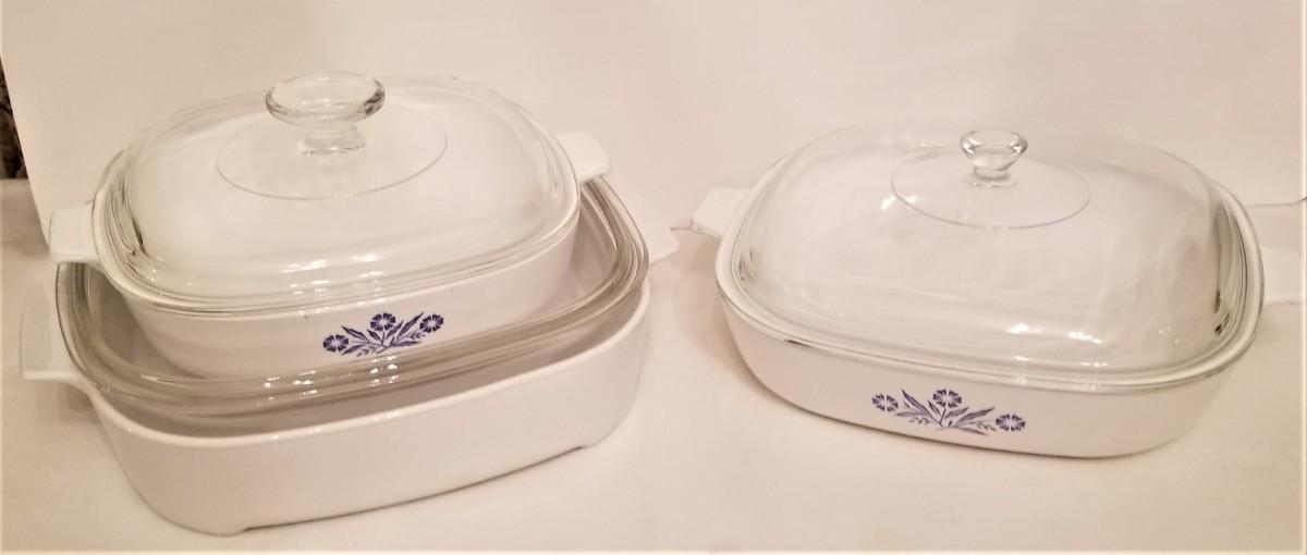 You get all you see here - two Cornflower Corning Ware Casseroles with lids, one 9", one 10", and a plain white microwave browning casserole with lid, No. A-10. All in good condition.
