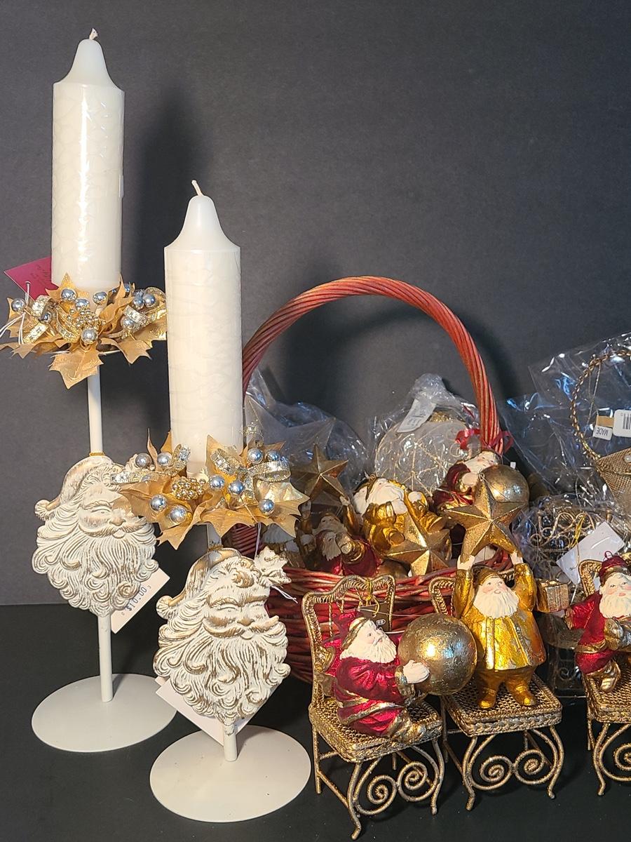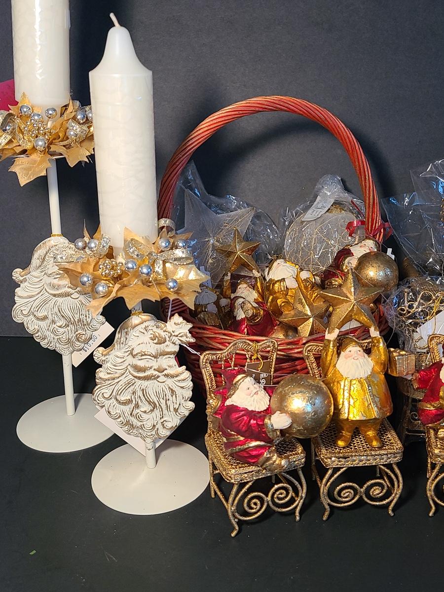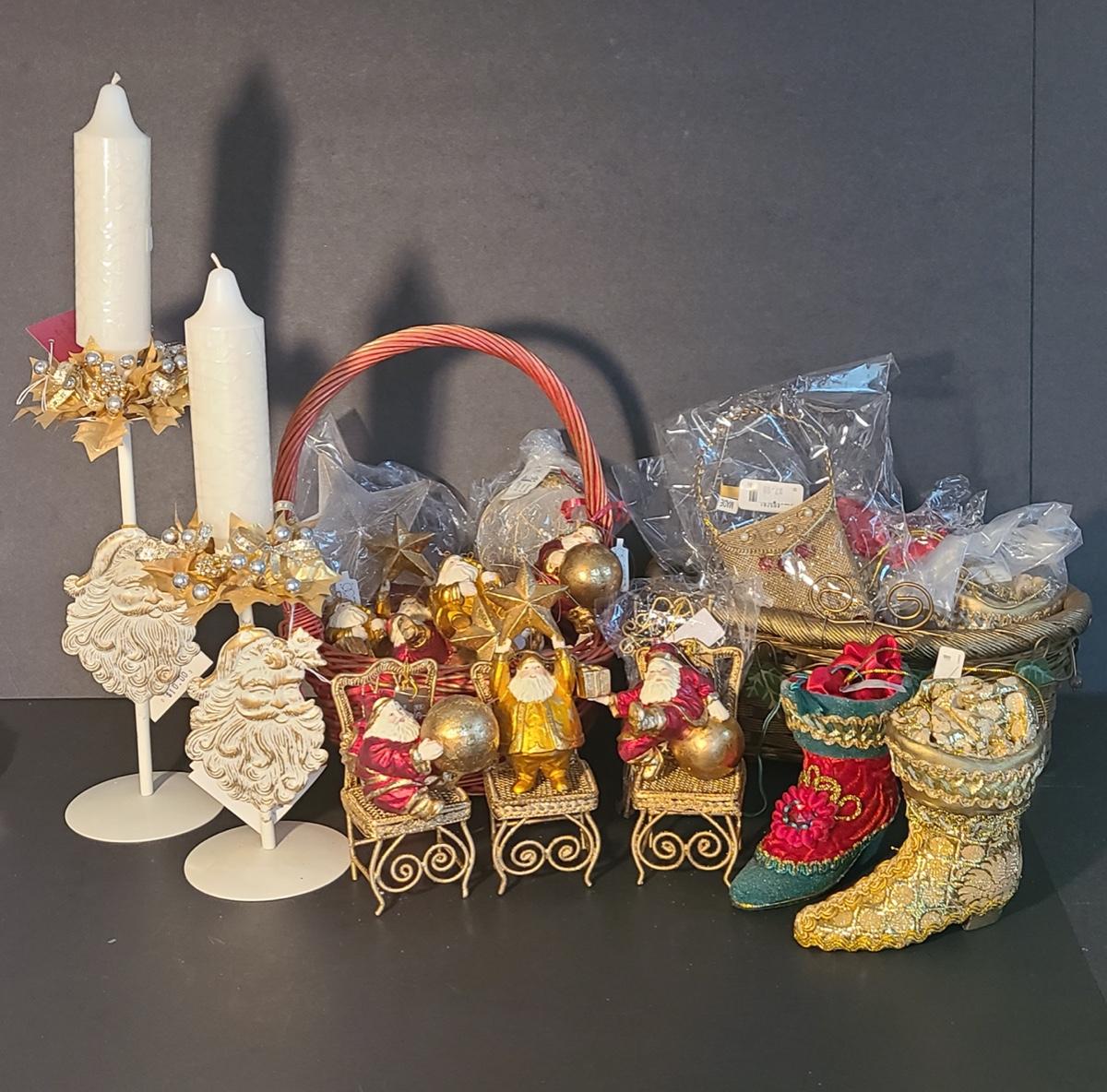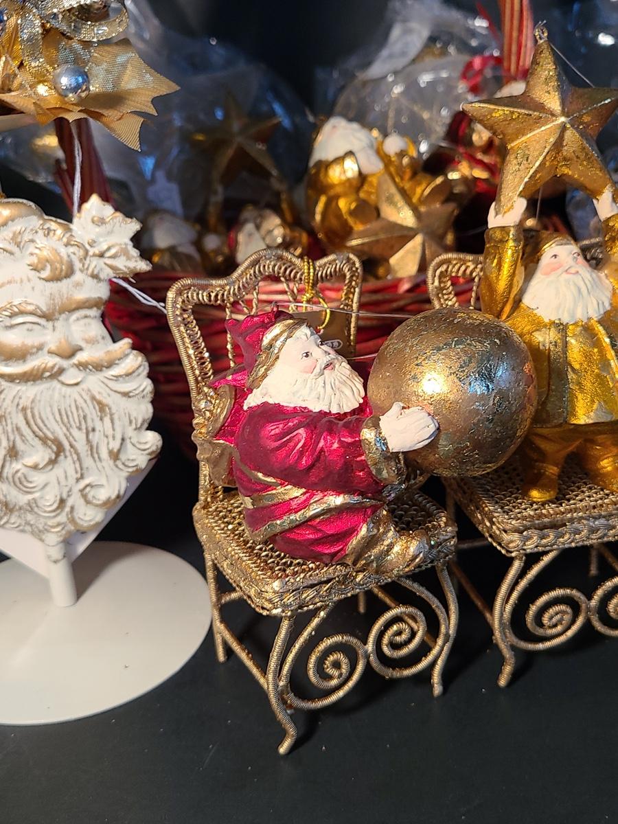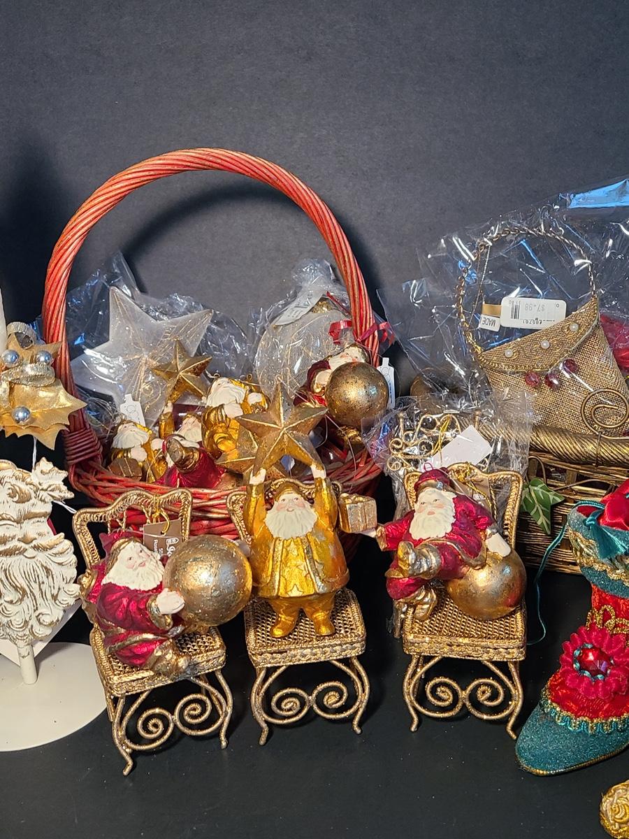 This lot if for Dept 56 cute fat wood-like Santa's that can be used on the tree or table for decor, also included are Roman Inc. shoe ornaments that can be filled with gifts or cash, Santa candle sticks, Filagree metal gold tiny chairs, and more! Please see all pictures as they are the best representation of the items and the condition of the items in the lot. If measurements were taken they will be in the description or in the pictures. To find details on individual items, please Google the item for specifics. We like to keep the integrity of new in unopened box as much as possible. Due to storage of this inventory over the years, please see pictures to determine condition of the box if there is one. All items are listed as new, or were used only as display. These come from a smoke free property.
