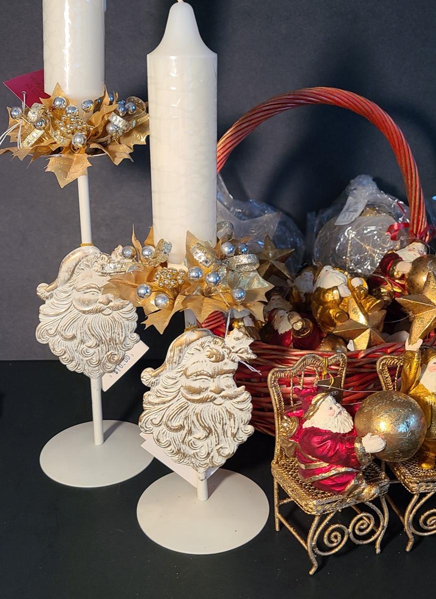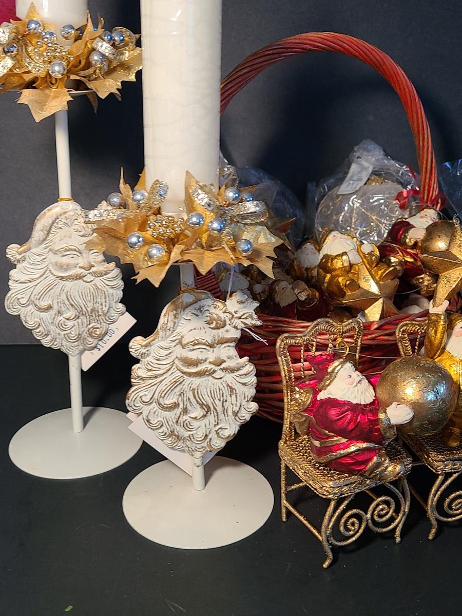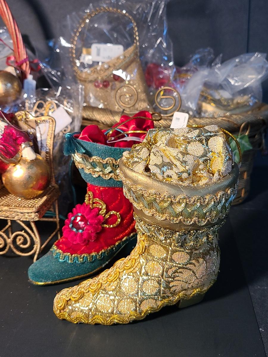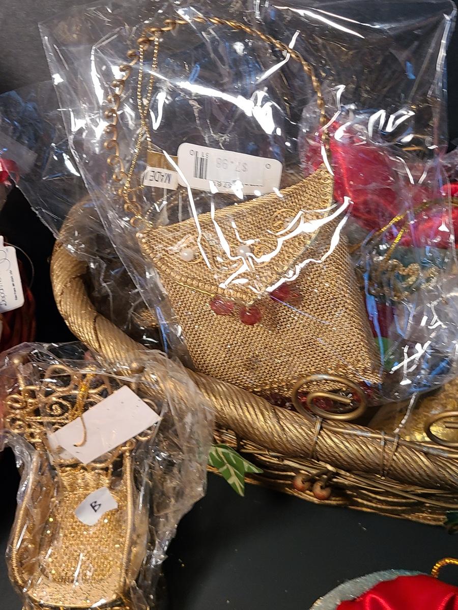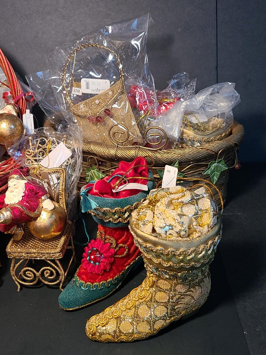This lot if for Dept 56 cute fat wood-like Santa's that can be used on the tree or table for decor, also included are Roman Inc. shoe ornaments that can be filled with gifts or cash, Santa candle sticks, Filagree metal gold tiny chairs, and more! Please see all pictures as they are the best representation of the items and the condition of the items in the lot. If measurements were taken they will be in the description or in the pictures. To find details on individual items, please Google the item for specifics. We like to keep the integrity of new in unopened box as much as possible. Due to storage of this inventory over the years, please see pictures to determine condition of the box if there is one. All items are listed as new, or were used only as display. These come from a smoke free property.