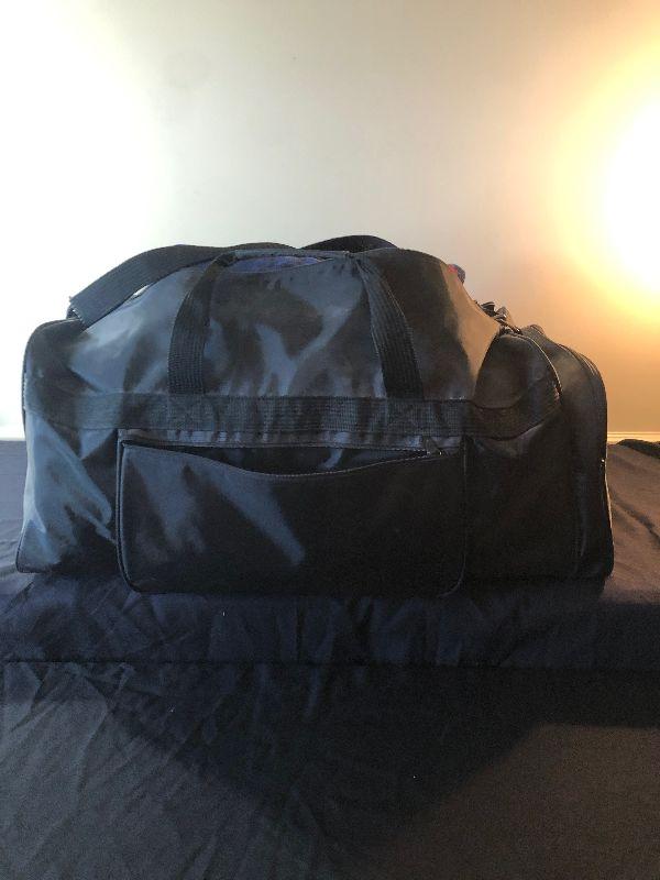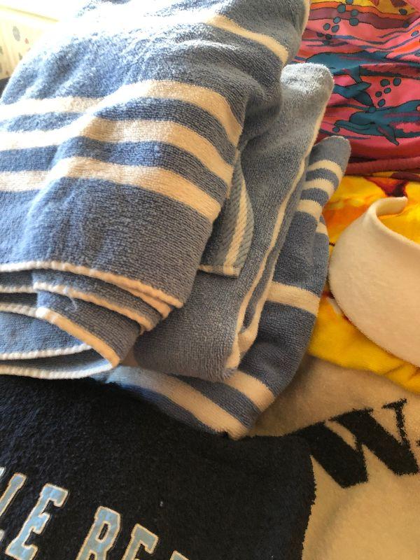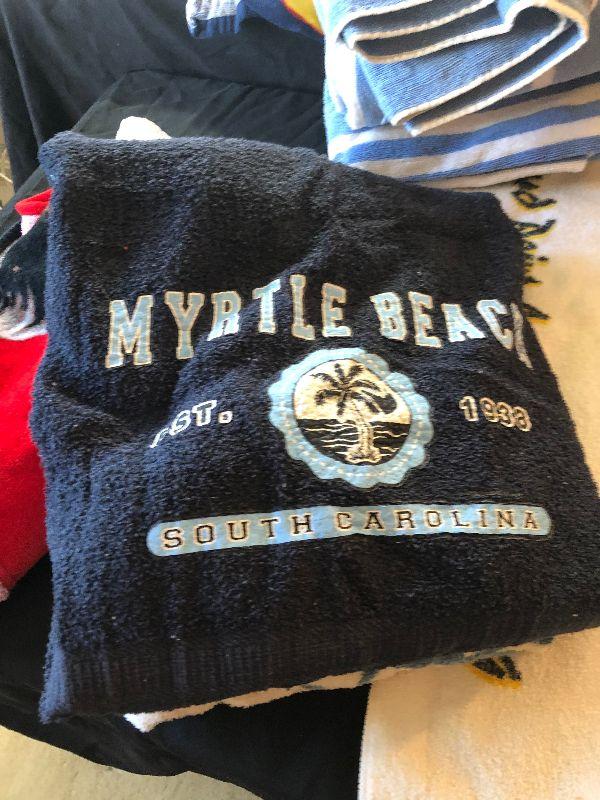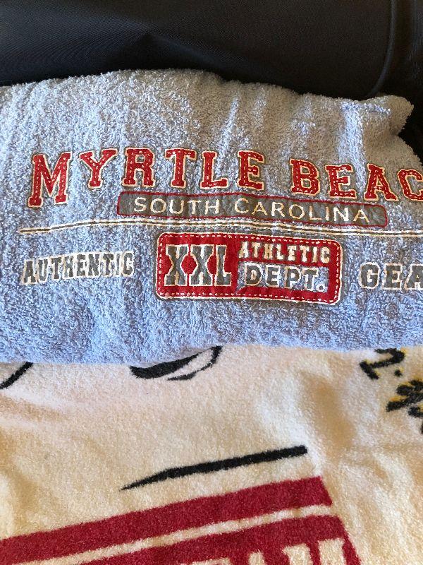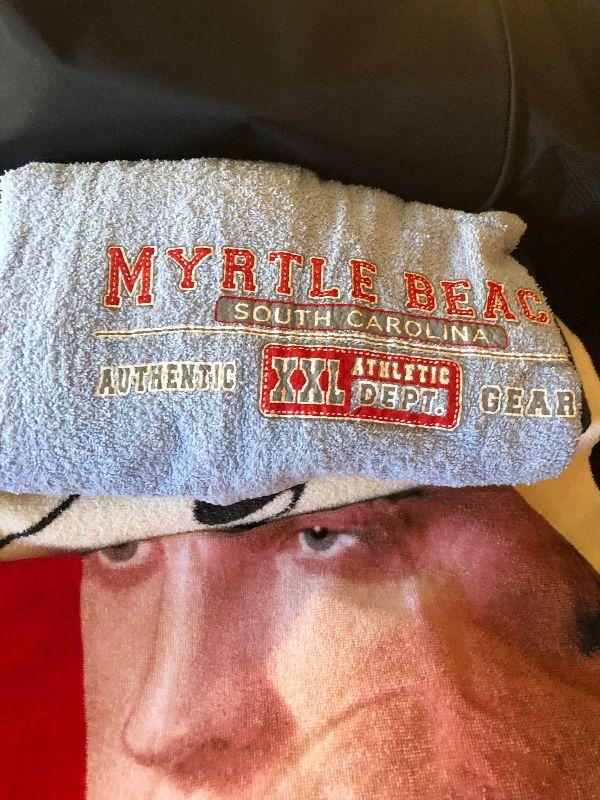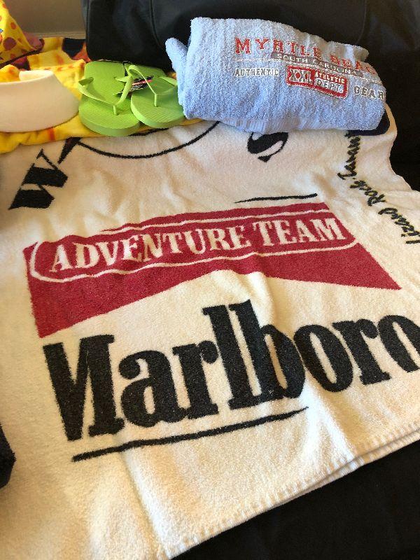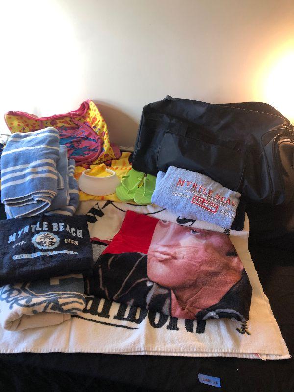 Duffel Bag Filled with Beach Towels including Marlboro, Elvis and Myrtle Beach, Ladies Visor and New Flip Flops