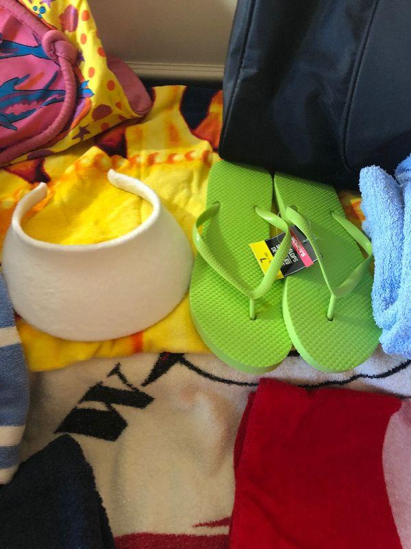 Lot 66 - Duffel Bag Filled with Beach Towels, Visor and New Flip Flops