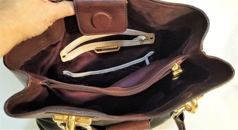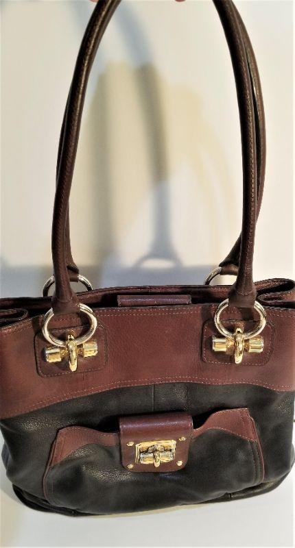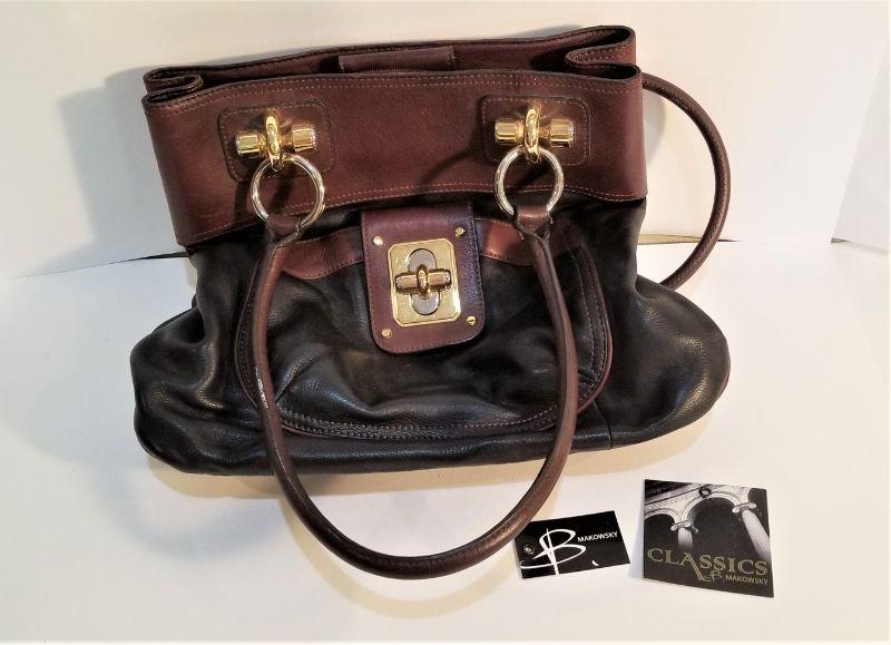 HEAVY - gently used Makowsky leather purse - a popular and expensive QVC item - measures 15" x 14" - 2ft tall when handle fully extended - carry as a handbag or use as a shoulder bag. Gold trim.