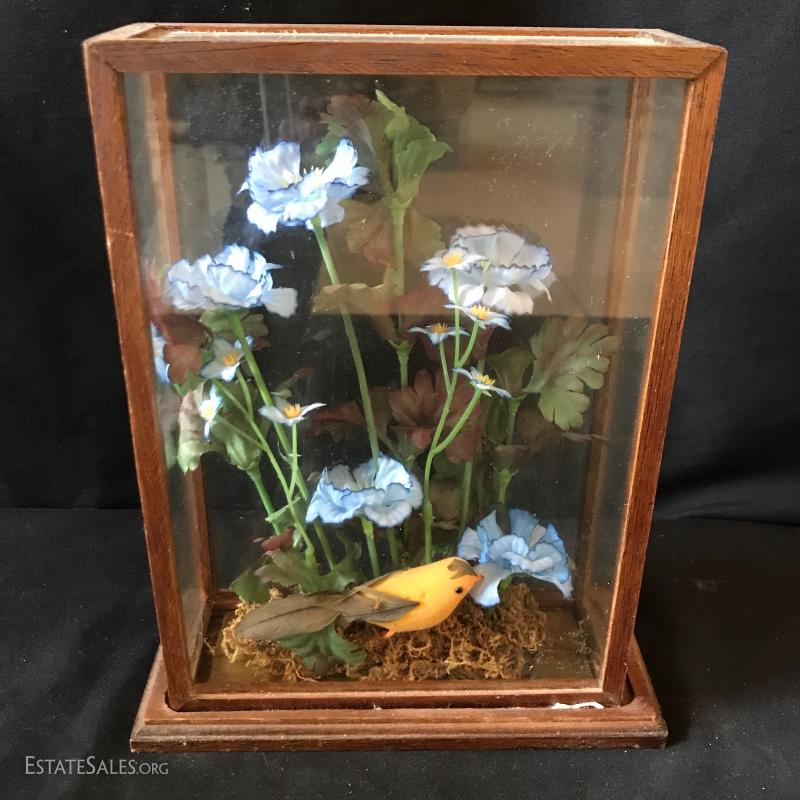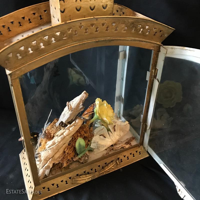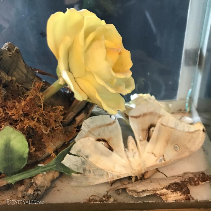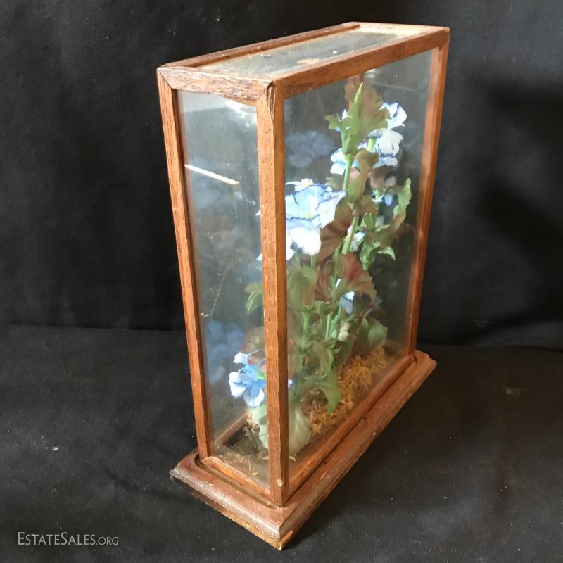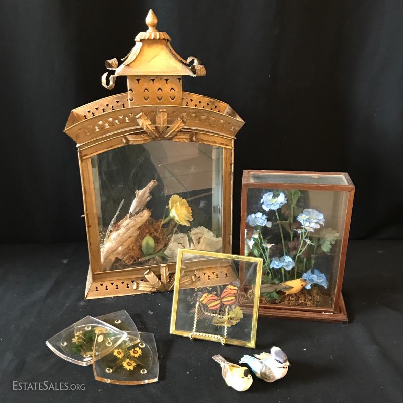 Two beautiful display boxes with flowers and butterflies inside. Make great unique decorative pieces. Larger one needs some rearranging inside. Has door that opens for easy access, 11"l x 5"w x 19"tall. Smaller box is 7.5"l x 2.5"w x 9" tall. No opening. Also includes 3 dried flower coasters, butterfly glass tile and two decorative birds.