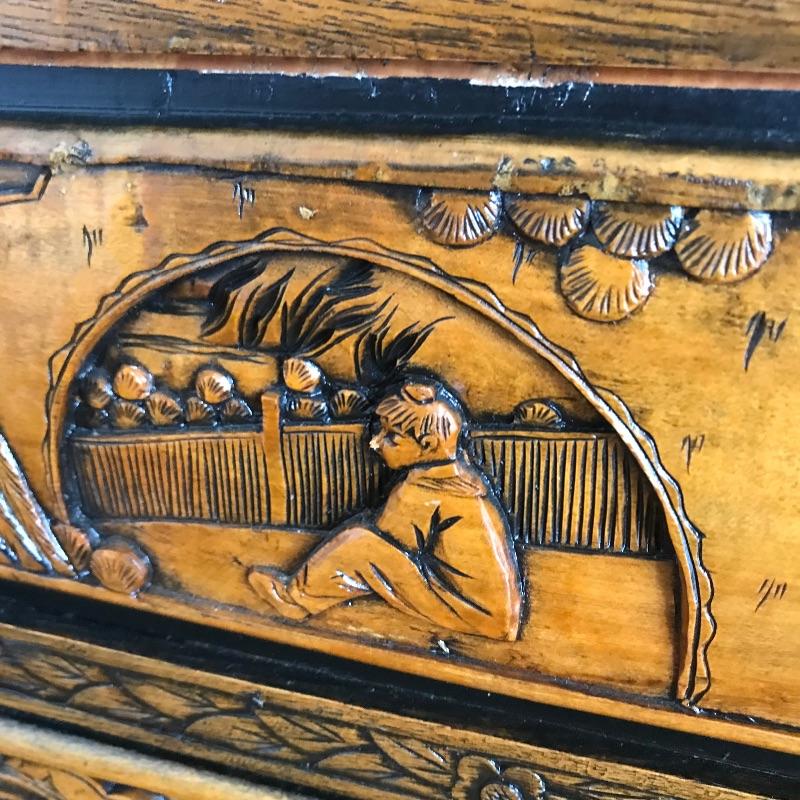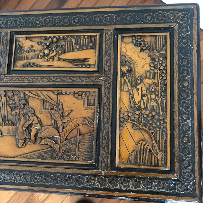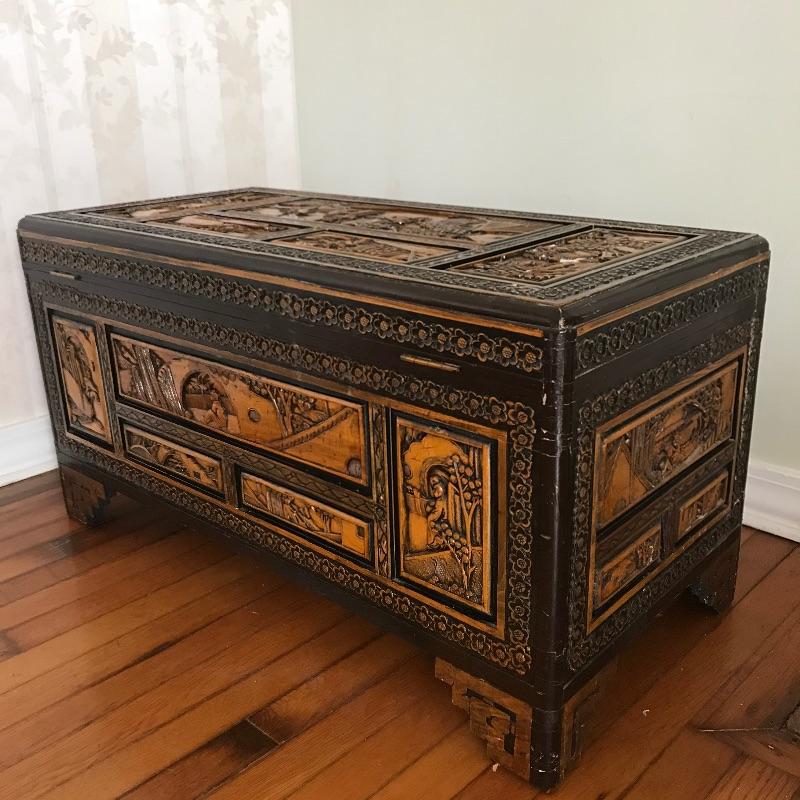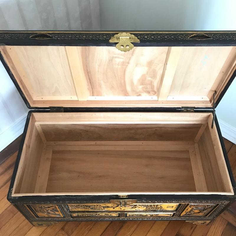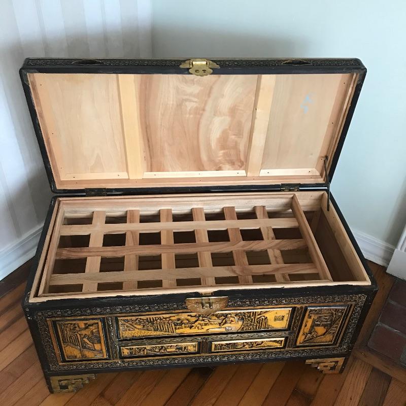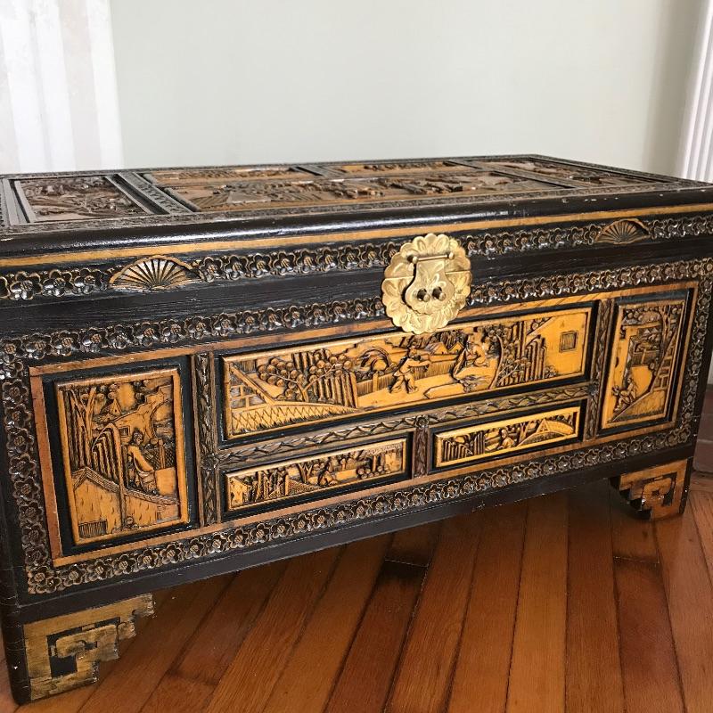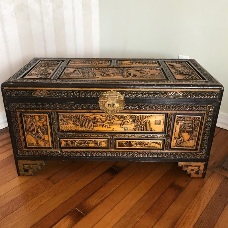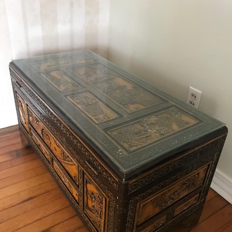 Awesome glass topped Asian style relief trunk. Piece has designs on five sides with multiple stunning scenes. Open the trunk with its brass hardware and fine a cedar-like wood interior in amazing condition with organizer tray. Trunk has some spots in need of a light detailing clean, but piece seems in extremely fine shape. Glass top is substantial weight and appears custom fit. Come to preview and check this beauty out for yourself. Piece measures approximately 35” x 17” x 18.25”. No shipping.