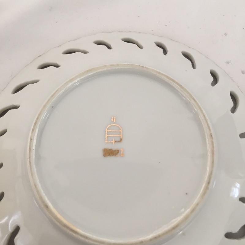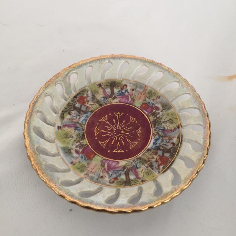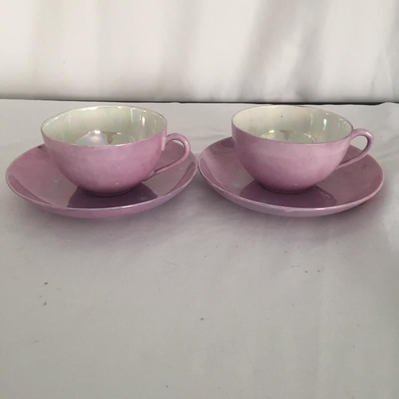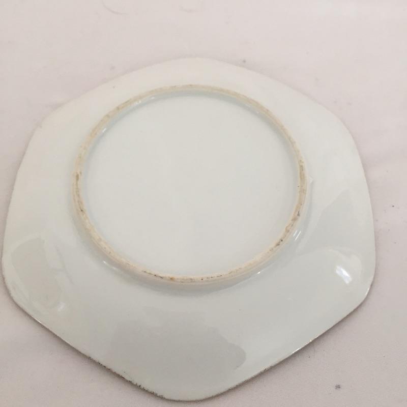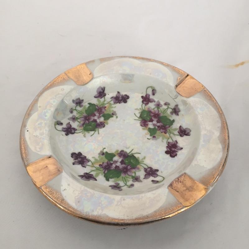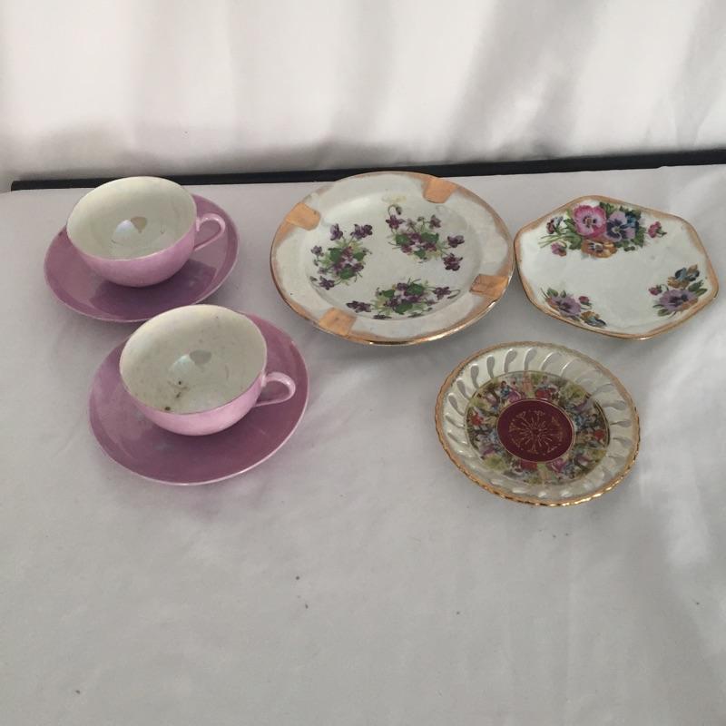 Delicate Japanese tea cups and saucers with a pair of small plates and an ashtray. Ashtray measures 7.5” D.