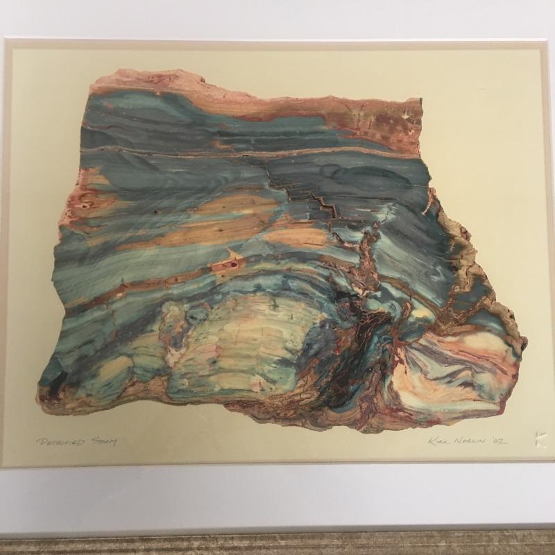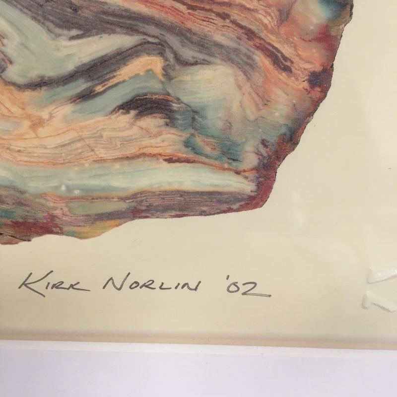 This Kirk Norlin artwork is titled “Petrified Storm” and is framed, matted and signed . Beautiful colors. Unknown medium. Frame measures 21.5” x 27.5”.