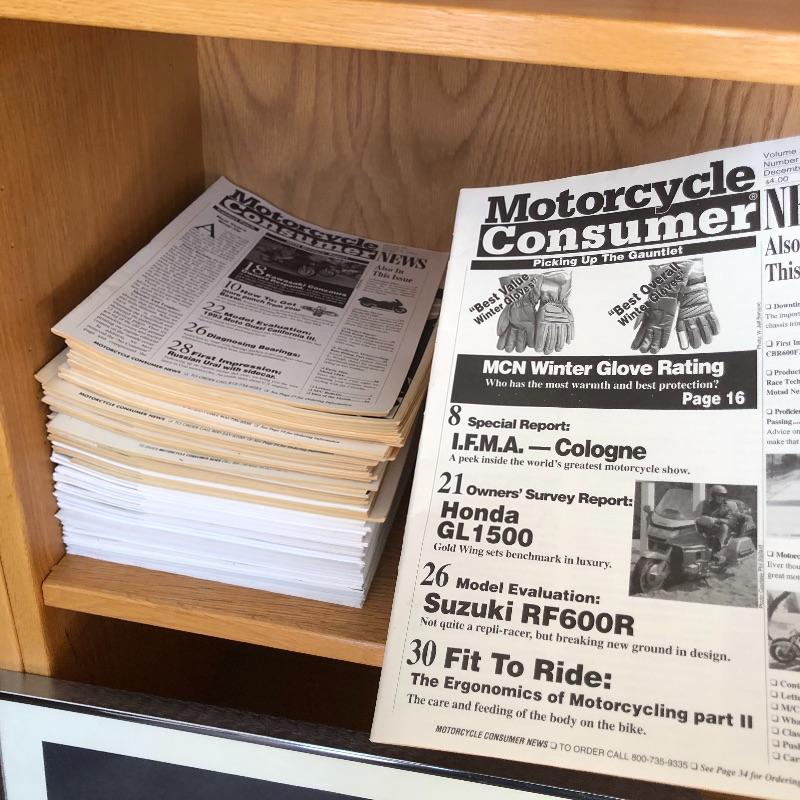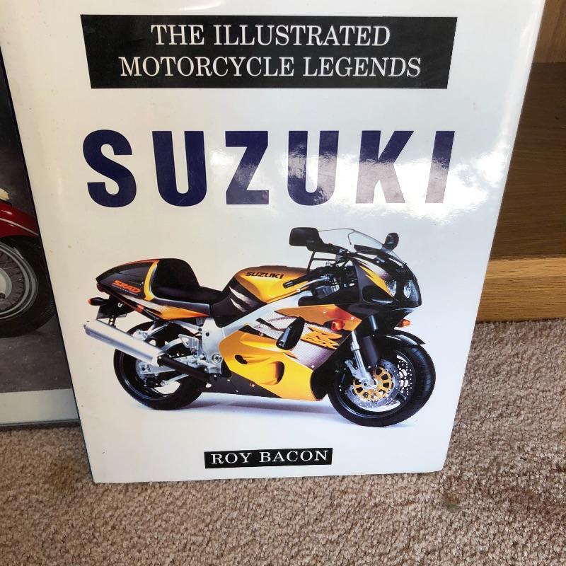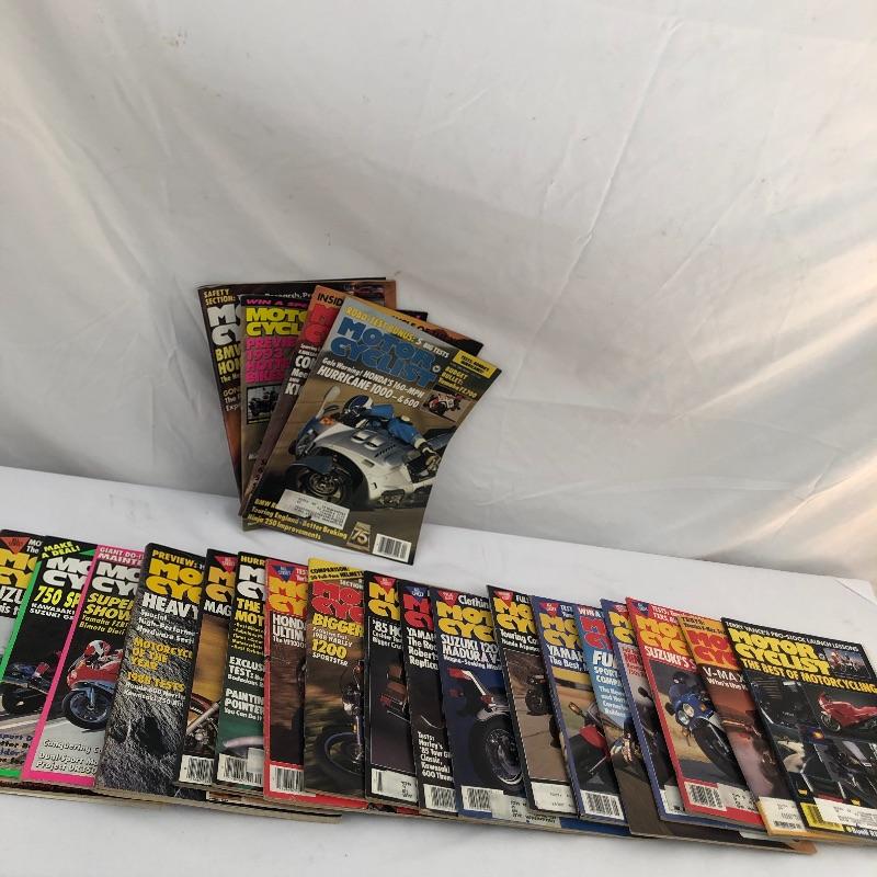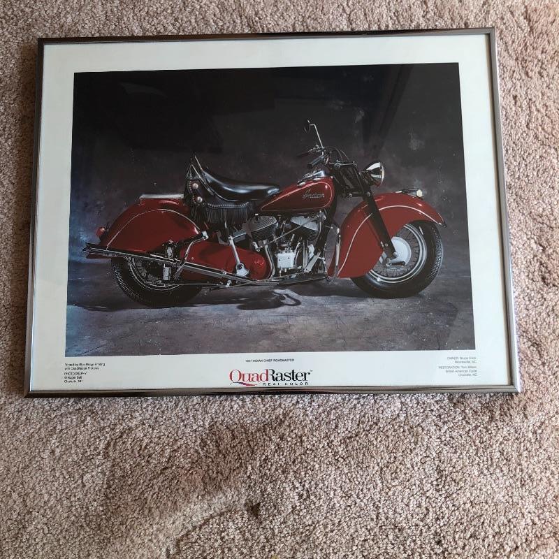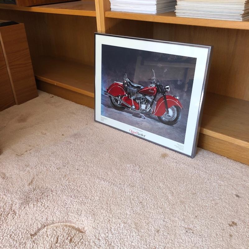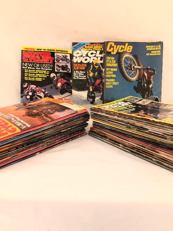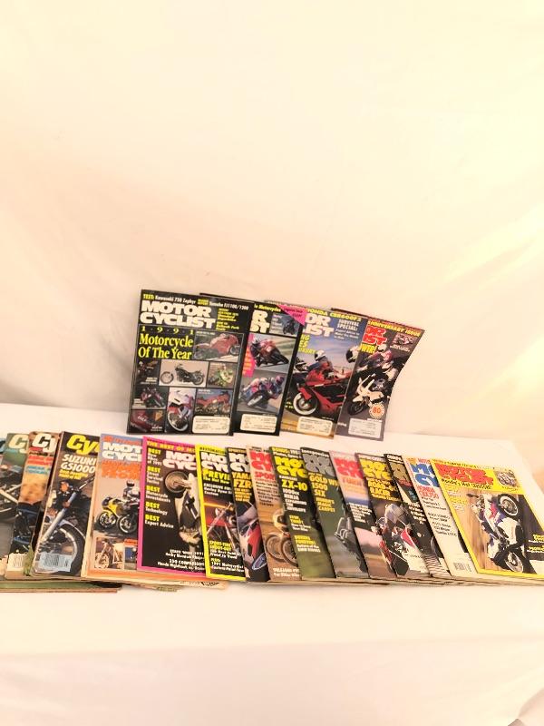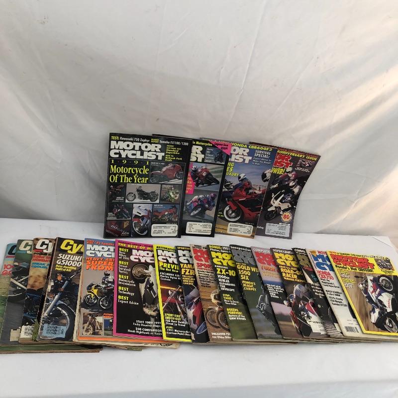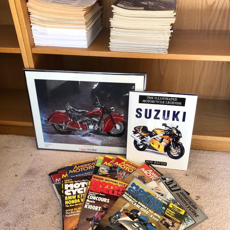 A hundred plus Motor Cyclist magazines here from the “˜80’s and 90’s plus a large stack of Motorcycle Consumer News magazines. Also included is a Suzuki book and a framed motorcycle poster, matted and in a silver metallic frame that measures 14” x 18”.