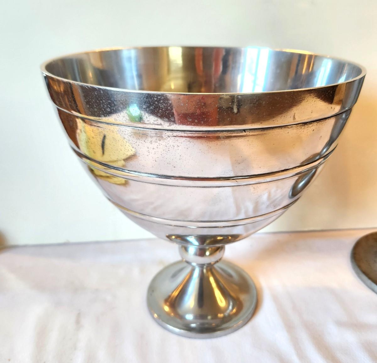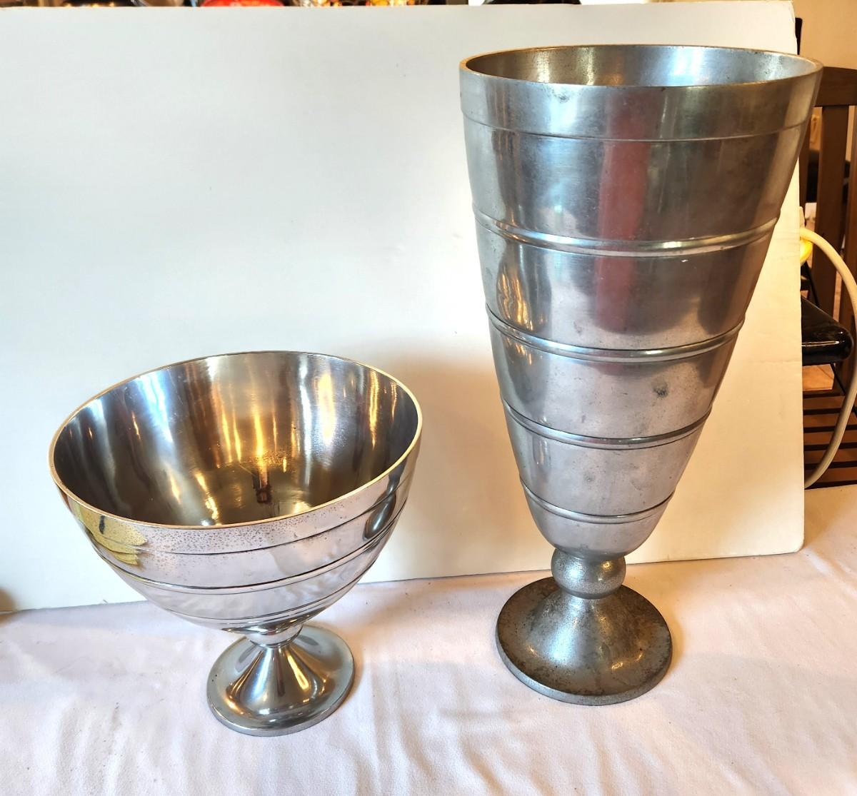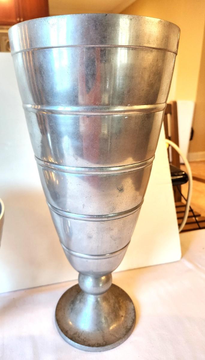 Lot of 2 contemporary pewter style vases - larger is 17.5" tall, smaller vase/bowl is 9" tall. Both in good condition.