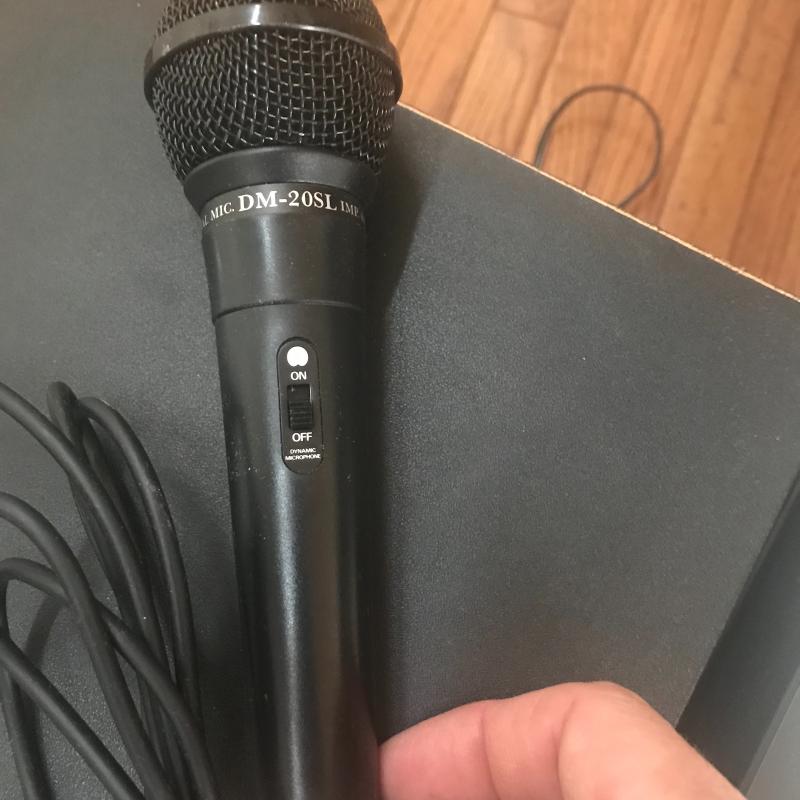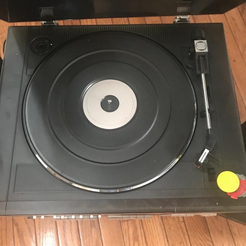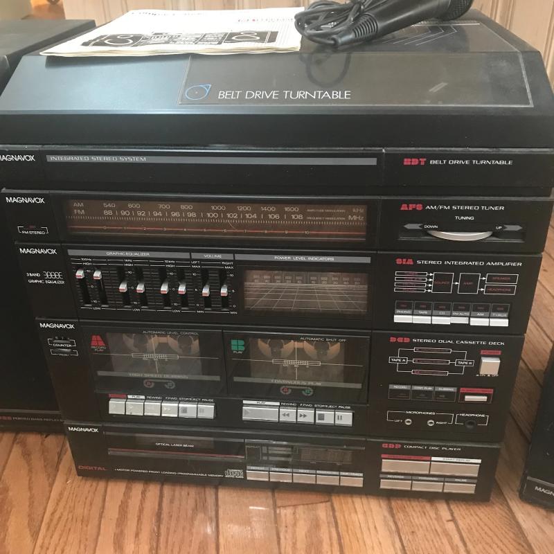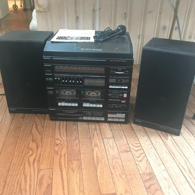 Stereo is one unit with two speakers. All components seem to function except CD player. Uni- Directional microphone included in Lot. Unit measures 16.5” x14.5” x16.5”. Local pick up only.