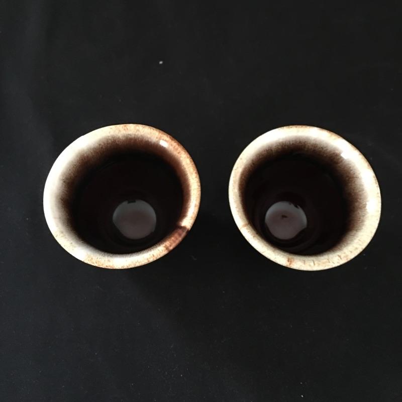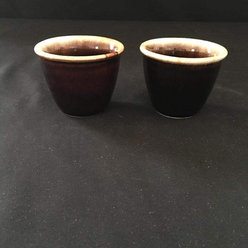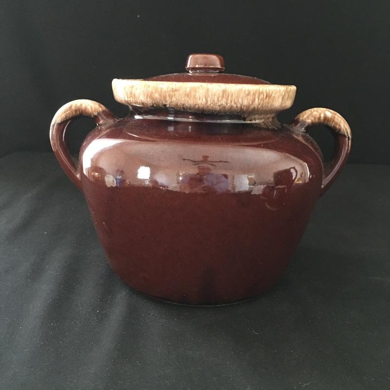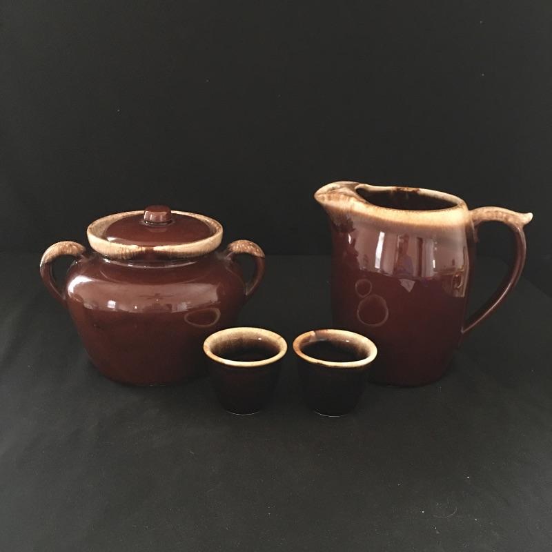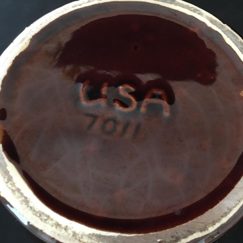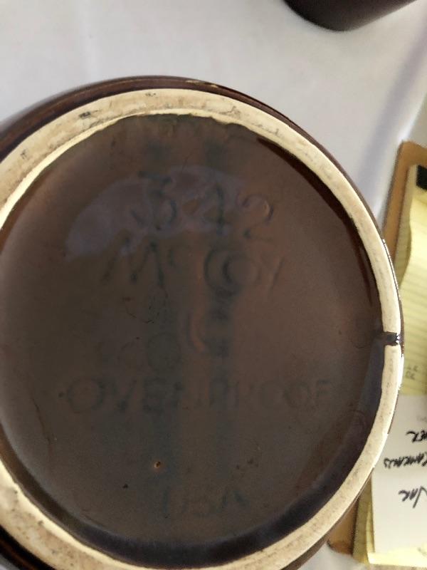 Country living at its finest! Collection of high quality brown pottery includes Signed McCoy cookie jar marked 342, what appears to be a unsigned McCoy style pitcher marked USA 7011 and two rankings marked USA. Pitcher measures 8” tall.