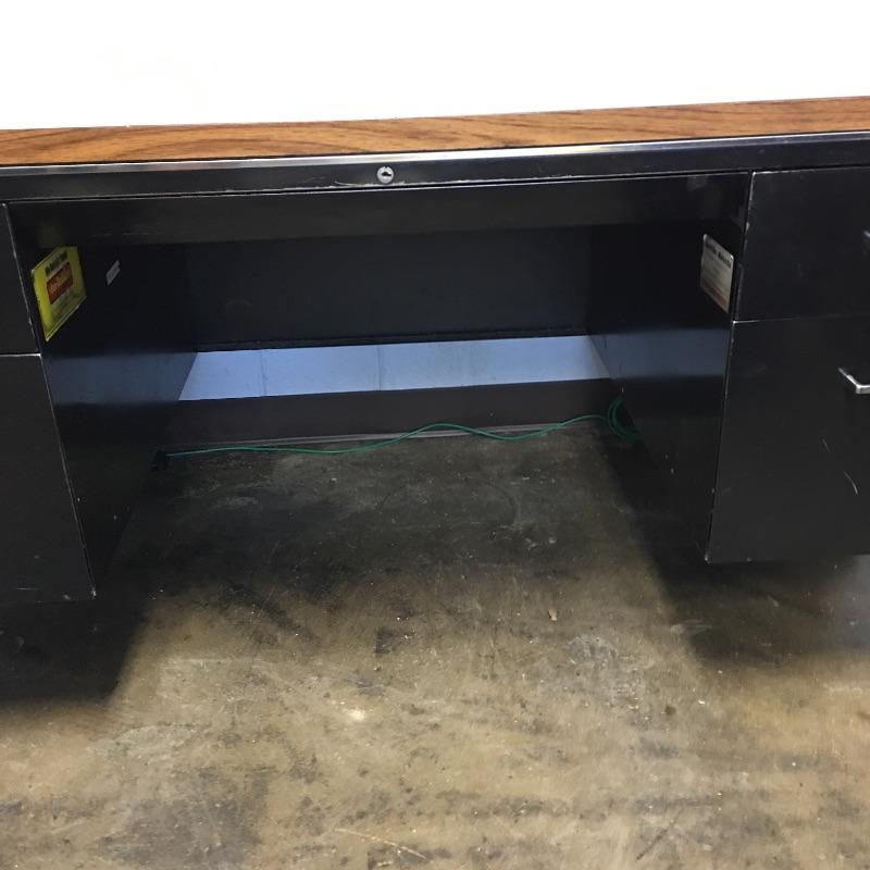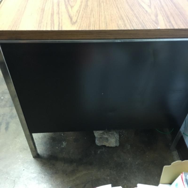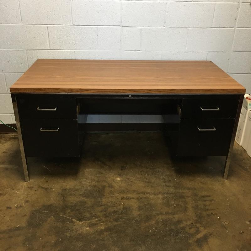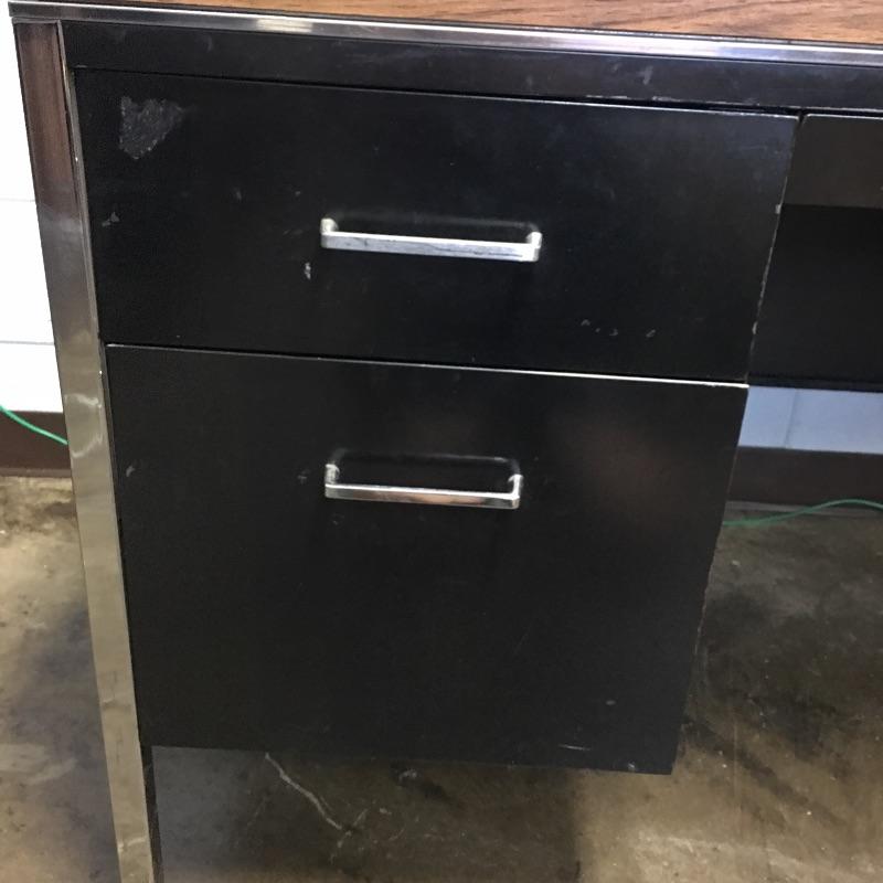 Metal desk with a Formica top and five drawers. Nice retro metal desk with the bottom two drawers that can be used as filing cabinets. One corner of desk has a piece of Formica chipped, see pictures. Desk measures 30” x 60” x 29”. Bring help item is substantial.