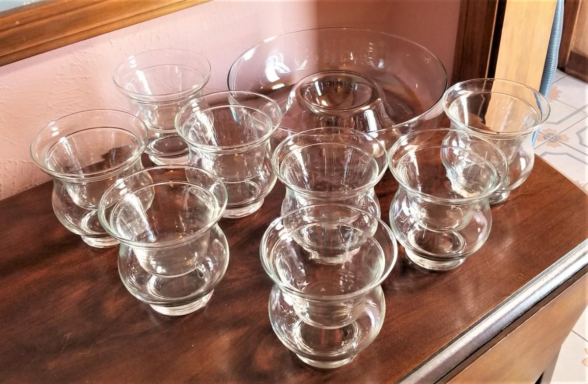 You get all you see here - 8 Shrimp cocktail dishes with liners along with chip/dip or shrimp mold dish. Bowl is 10.5" across, individual serving dishes are each 4.5" tall. All in good condition.
