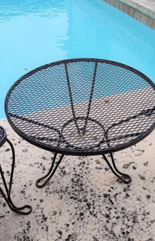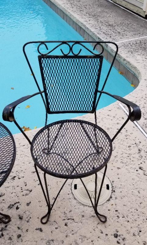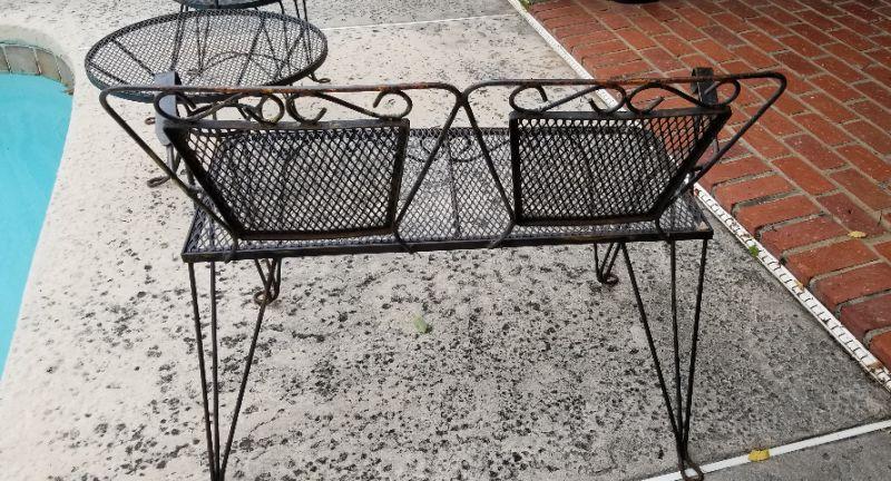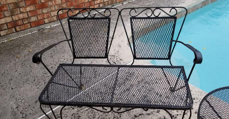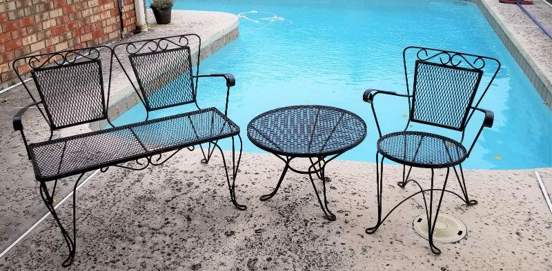 Settee, table, and armchair - nice vintage patio set in good condition. Settee is 38" across, 15.5" deep, 31" tall. Table is 23" across and 16" tall. Chair is 22 inches across at the arms, 19" deep, and 20.5" tall.