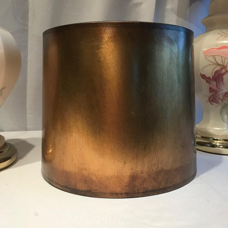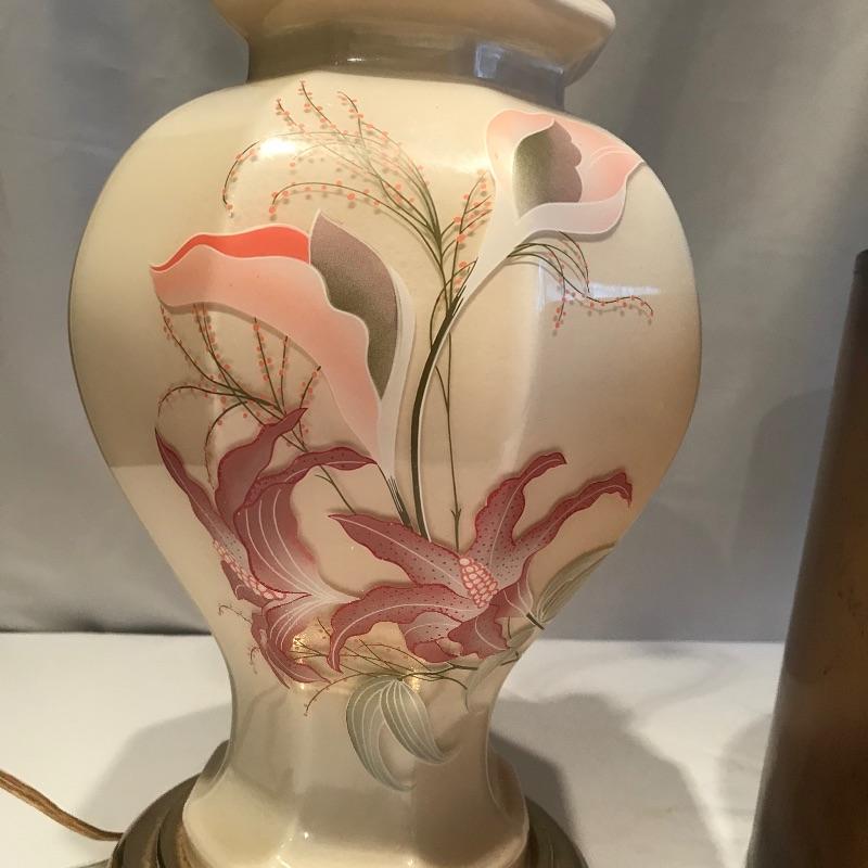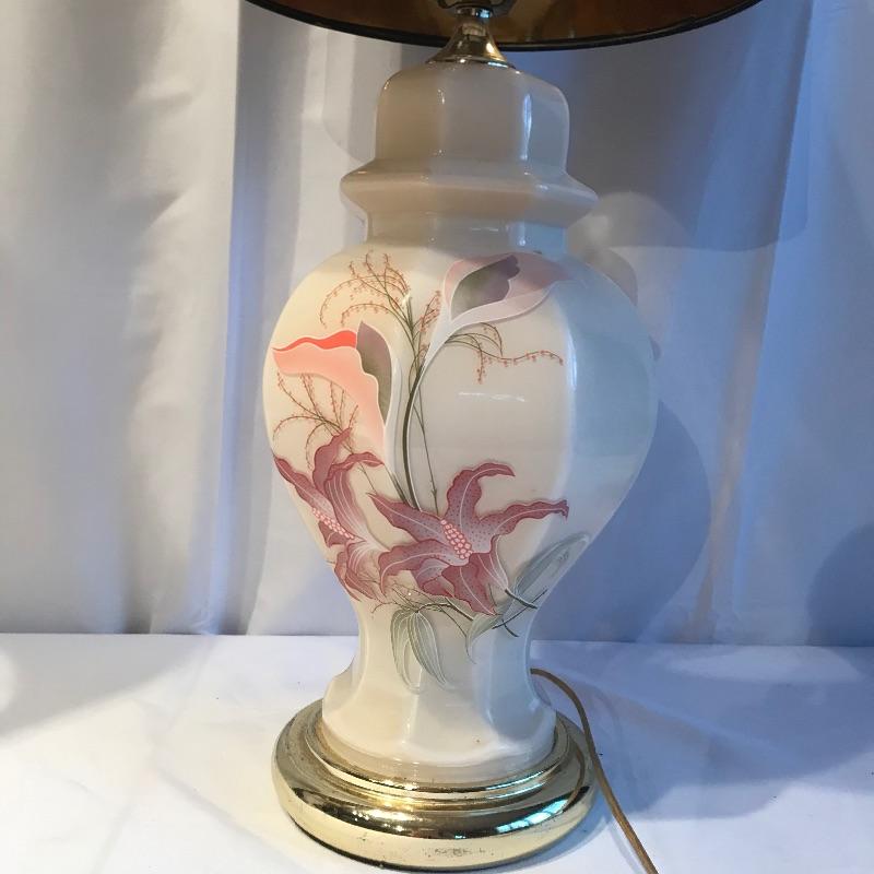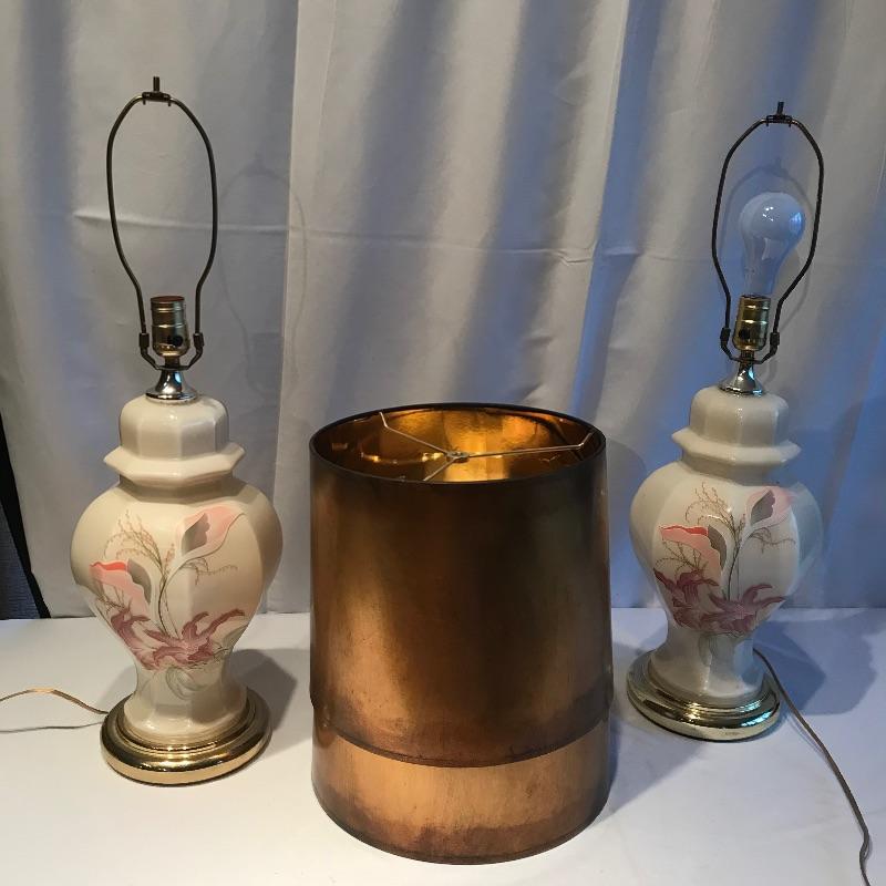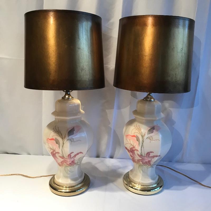 Two stunning ivory glass lamps with matching lily designs. Both work when tested and have been paired with unique copper colored paper shades. The 26” lamps have designs appear identical, leading us to believe they are not hand painted. Both lamps are in need of top finials. Bring some bold yet delicate colors into your home. Local pick up only.