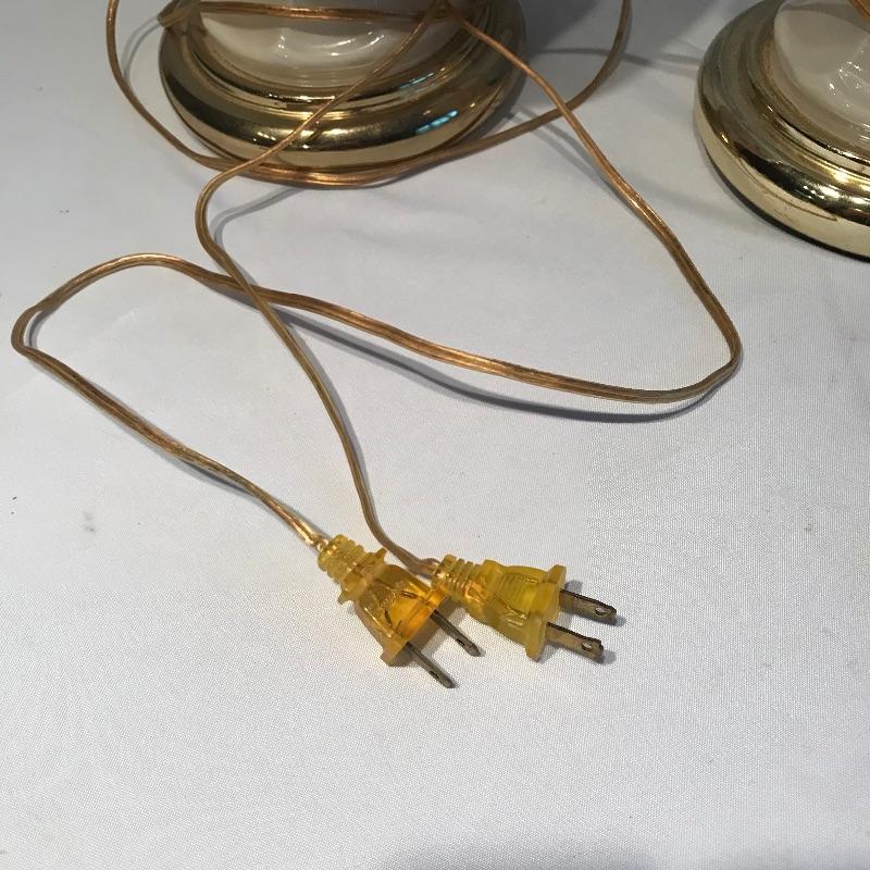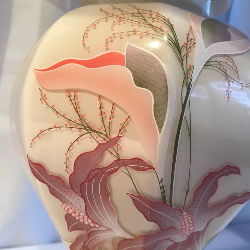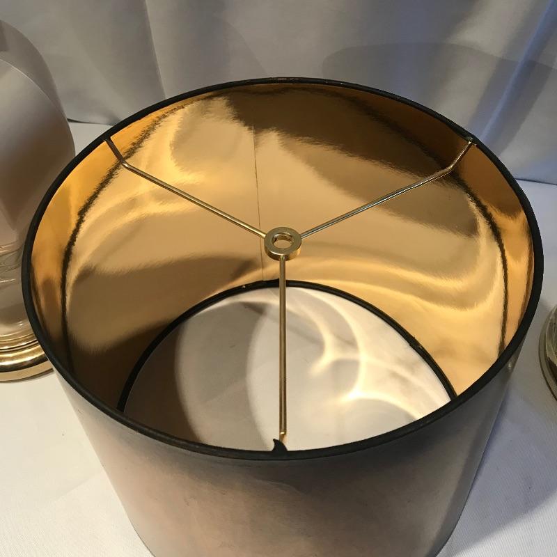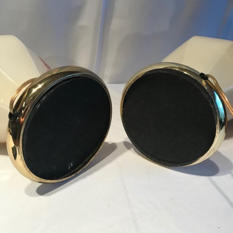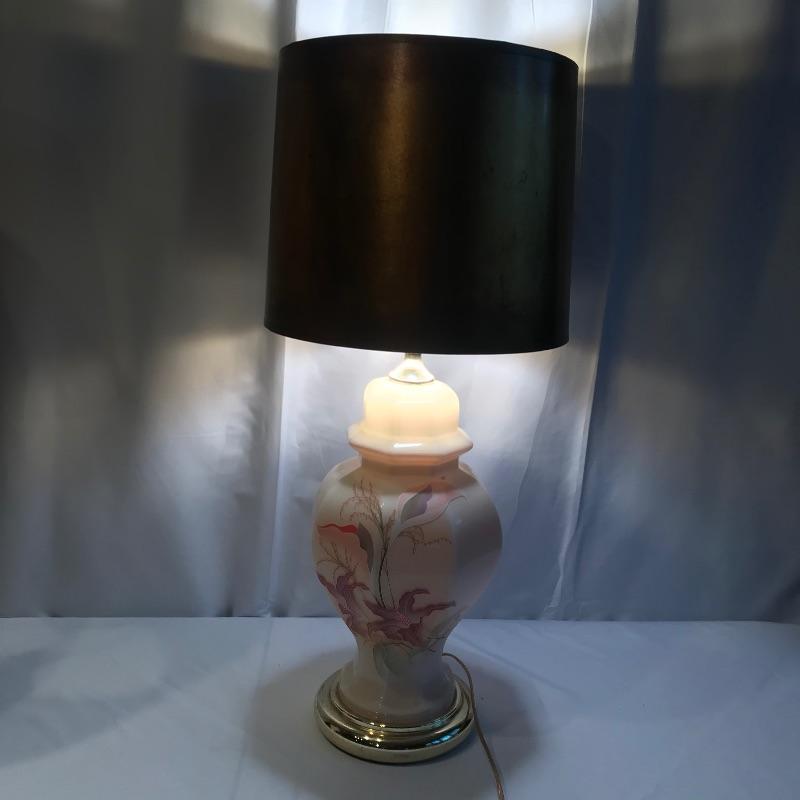 Two stunning ivory glass lamps with matching lily designs. Both work when tested and have been paired with unique copper colored paper shades. The 26” lamps have designs appear identical, leading us to believe they are not hand painted. Both lamps are in need of top finials. Bring some bold yet delicate colors into your home. Local pick up only.