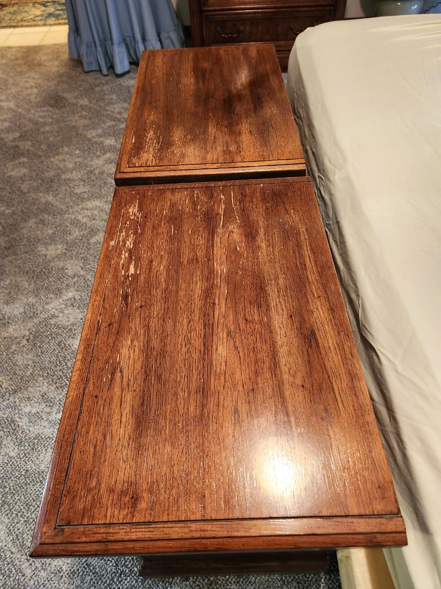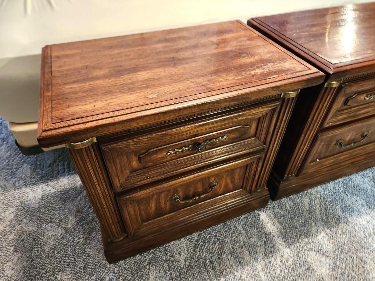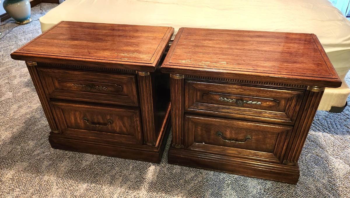 Pair of matching nightstands - oak finish - matches Lot 62. 2 drawers, some wear to tops.