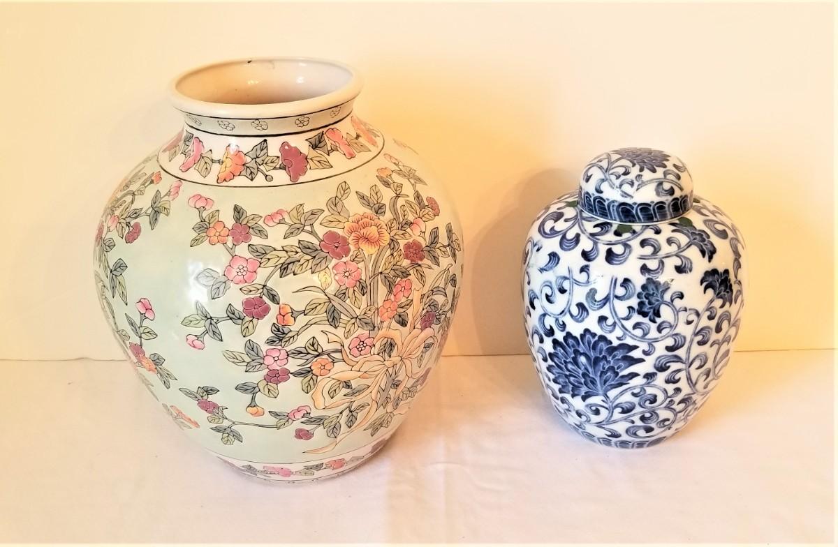 Asian style jar - larger is 11" tall - the blue/white ginger jar is Andrea - measures 8" tall with lid. Good condition.