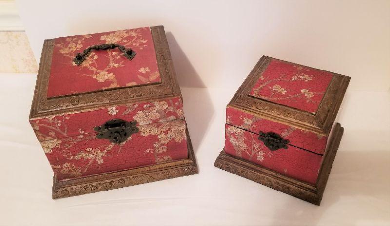 Pair of contemporary decorative boxes with Asian styling. The smaller box will fit inside the larger box. Larger box 7" tall, 8.5" wide, 8.75" deep. Gently used.