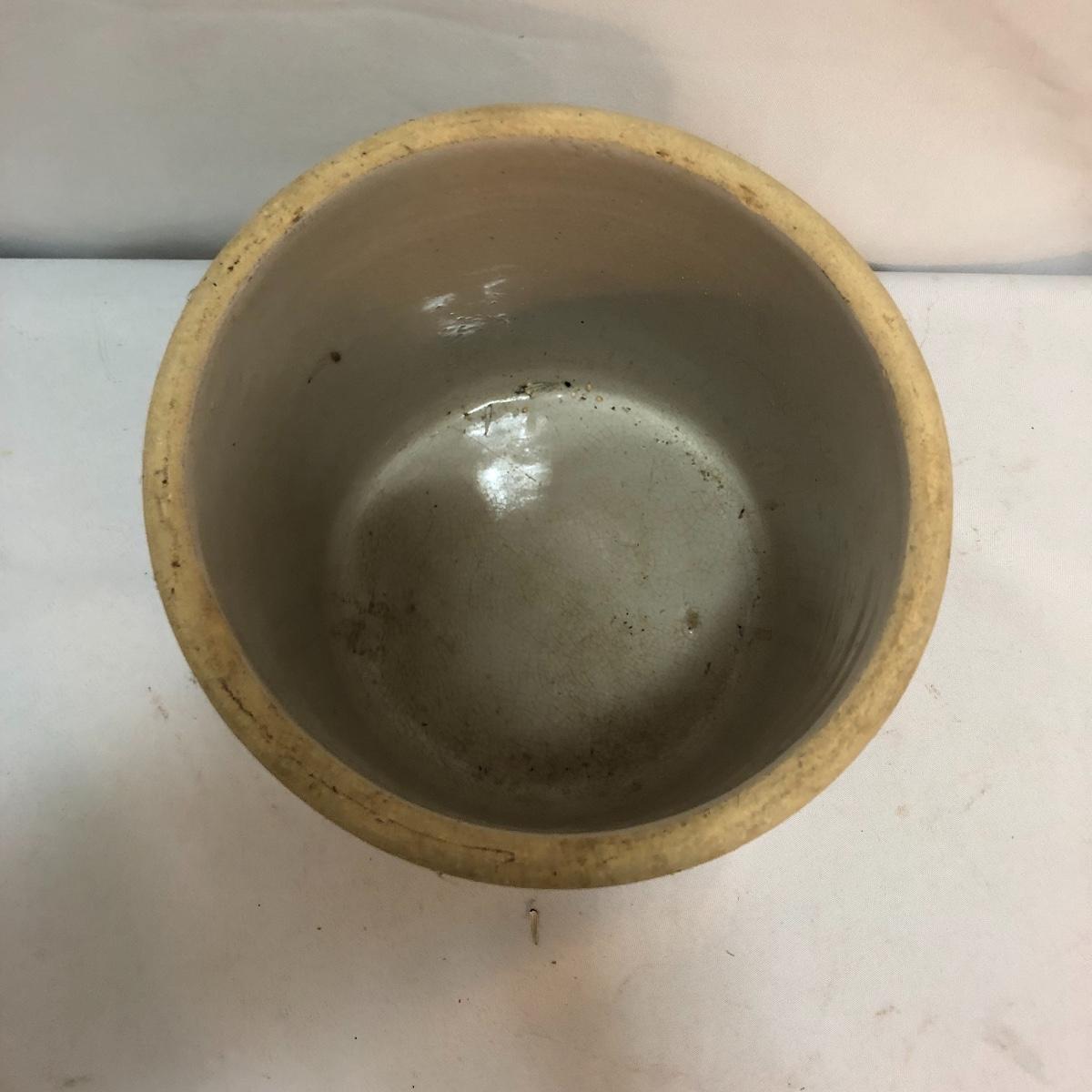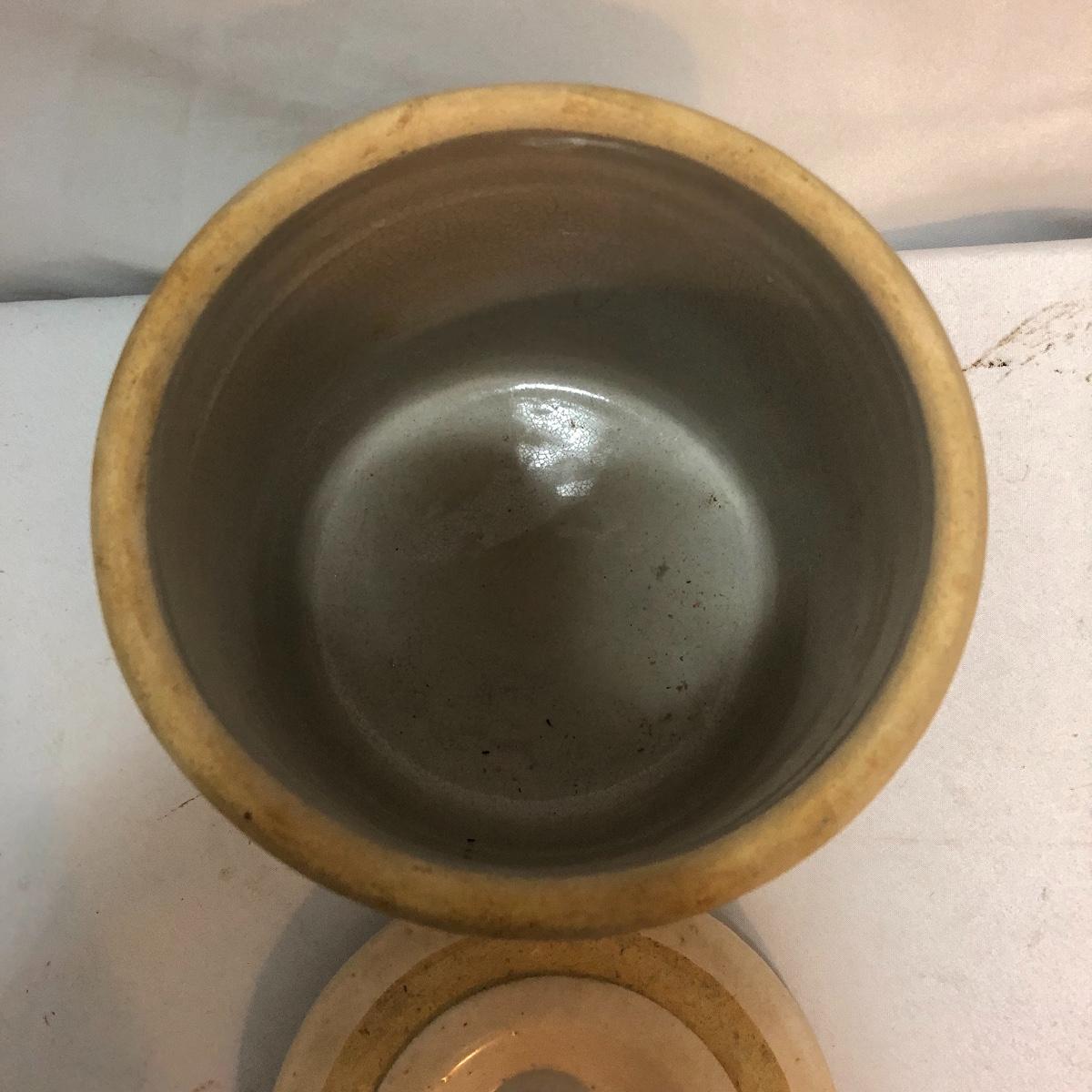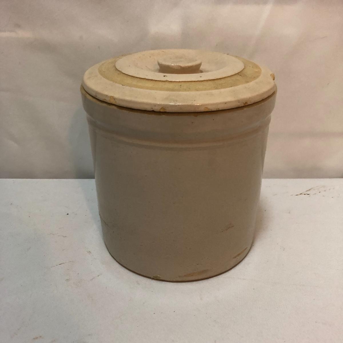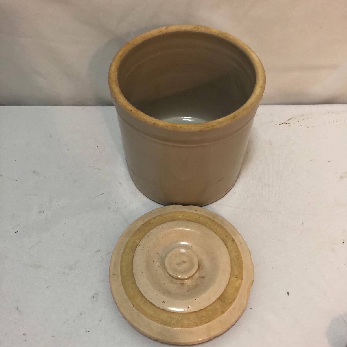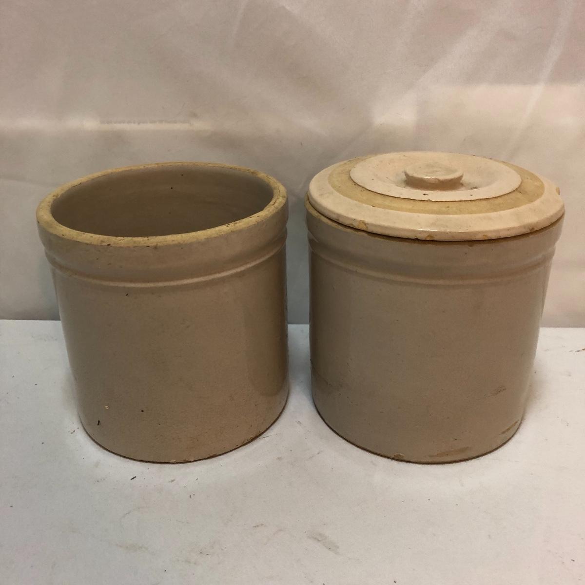 This pair of stoneware crocks include one lid. Lot includes two stoneware crocks with one lid. Both crocks and lid have some chips, see pictures. Crocks measure 7.5”D x 7.5” tall.