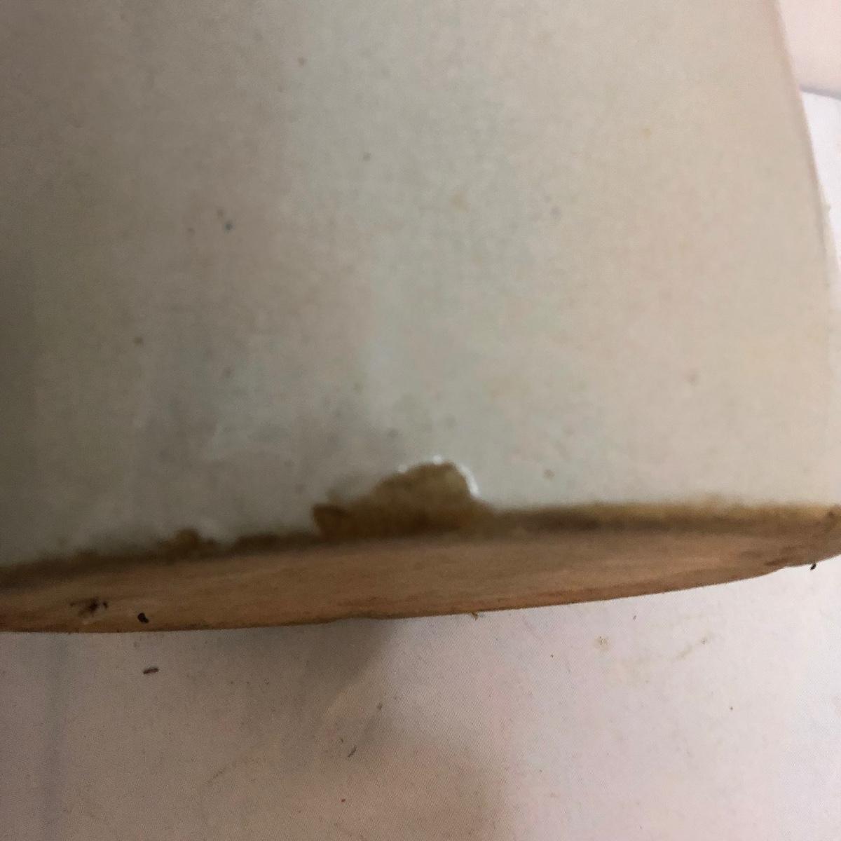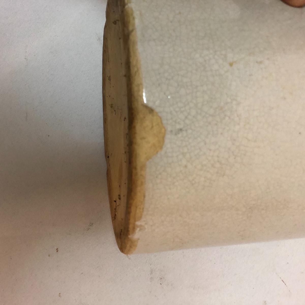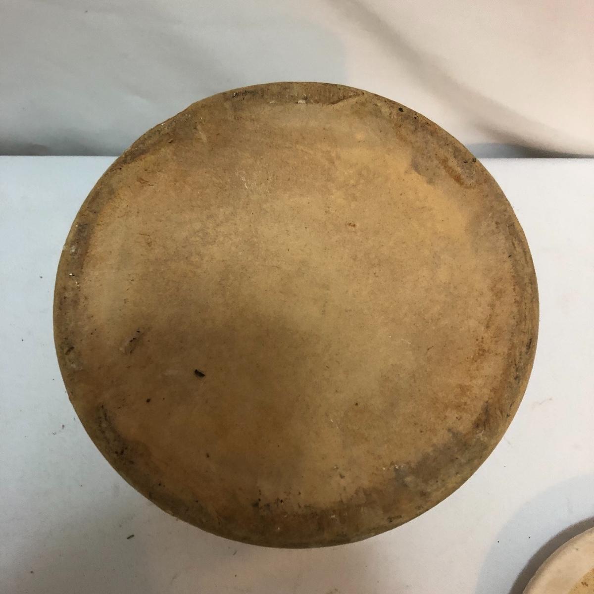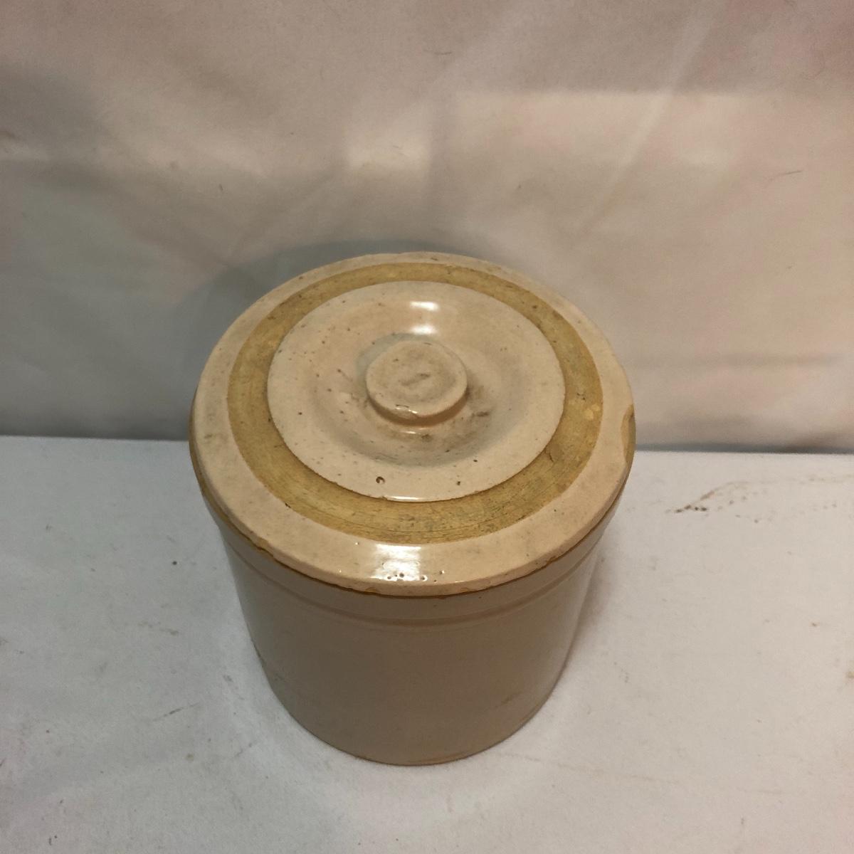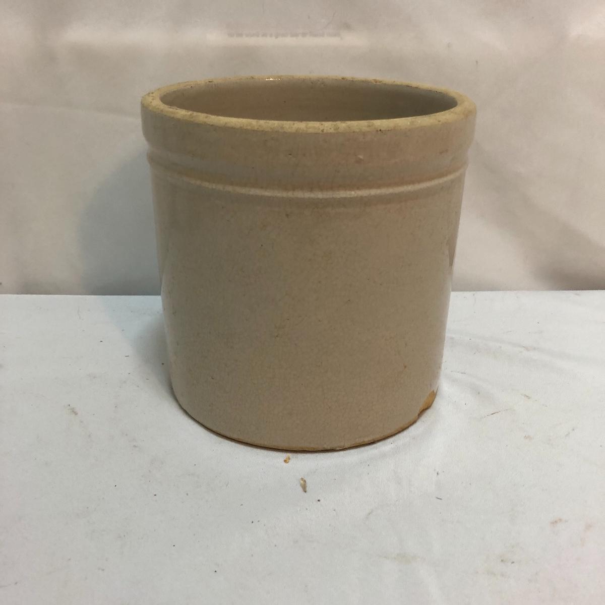 This pair of stoneware crocks include one lid. Lot includes two stoneware crocks with one lid. Both crocks and lid have some chips, see pictures. Crocks measure 7.5”D x 7.5” tall.