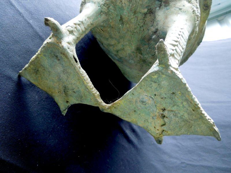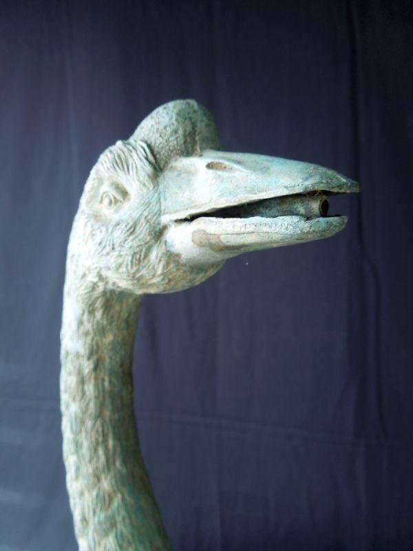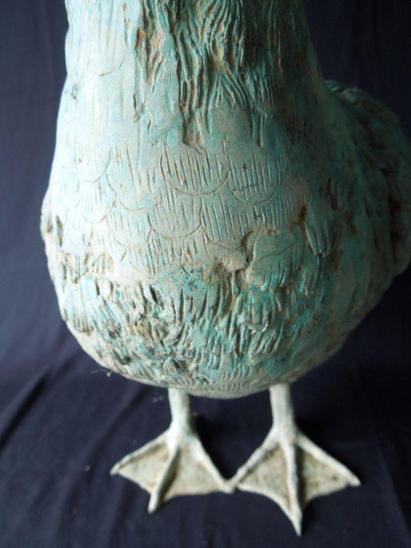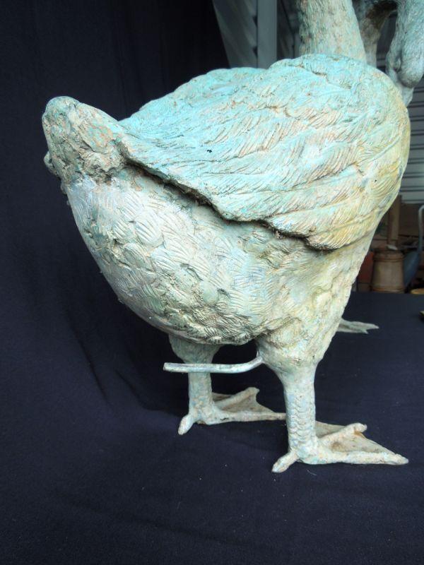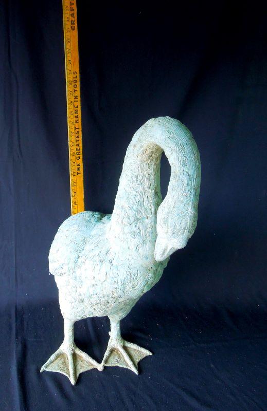 Upright goose has tubes on leg and in mouth for hose attachement. Not tested. 27" H and 22" H. No damage noted. Metal composition with painted verdigris finish. Well balanced for display.