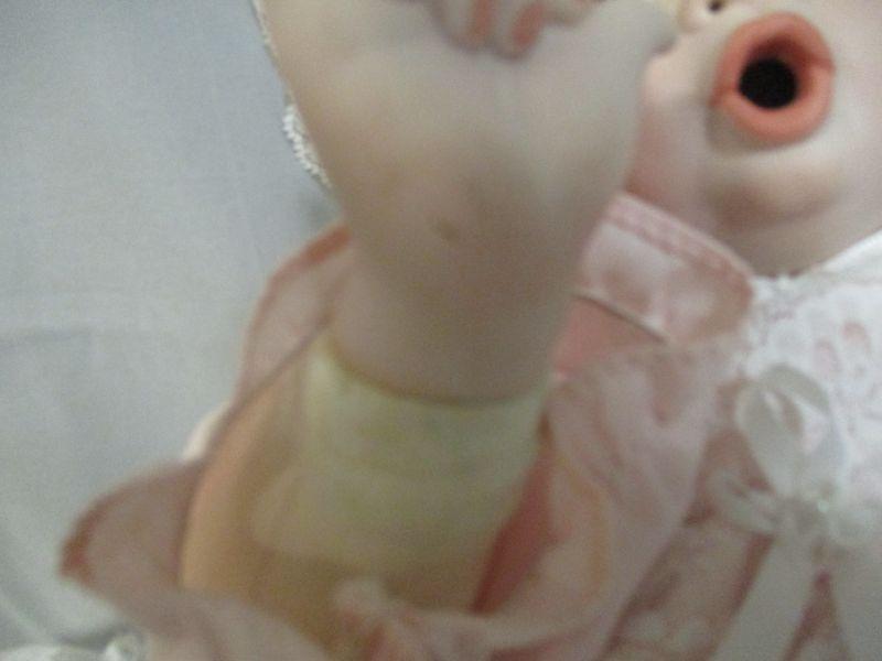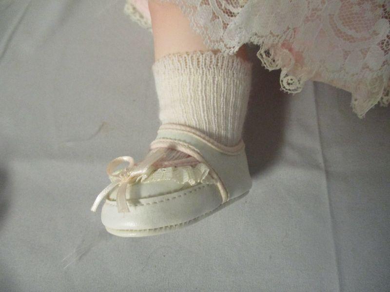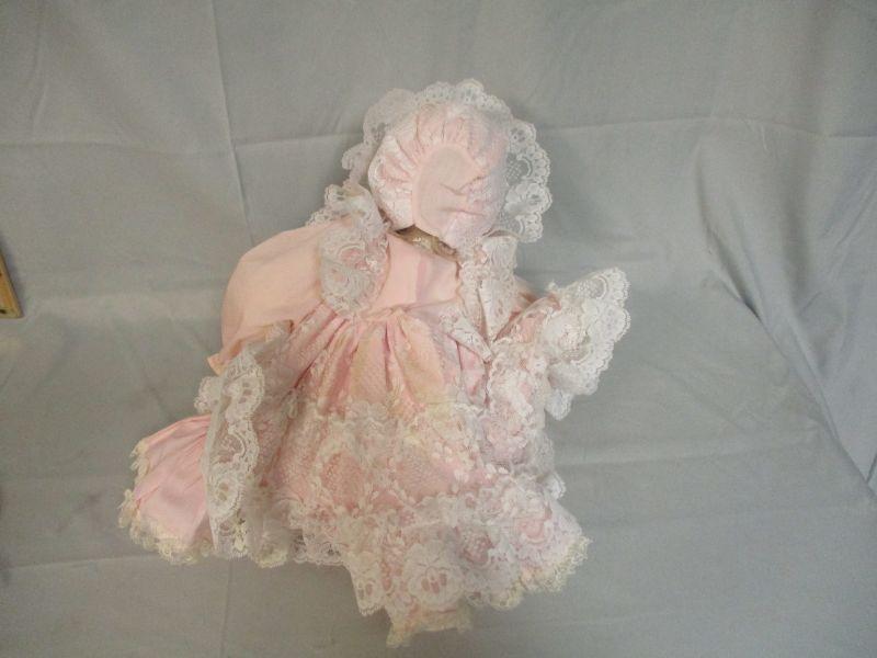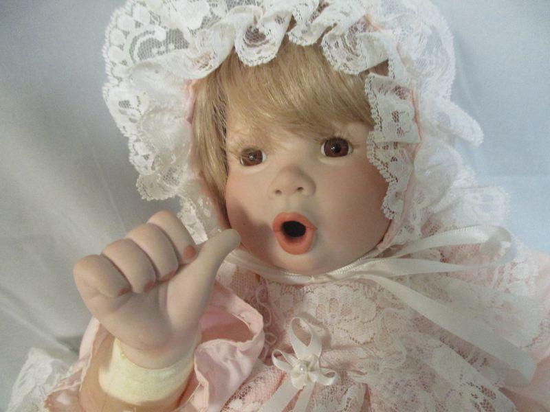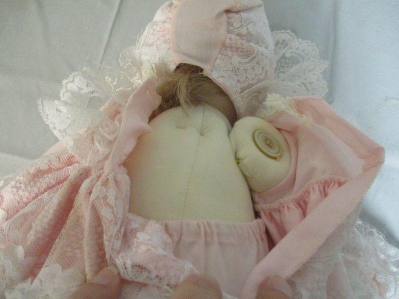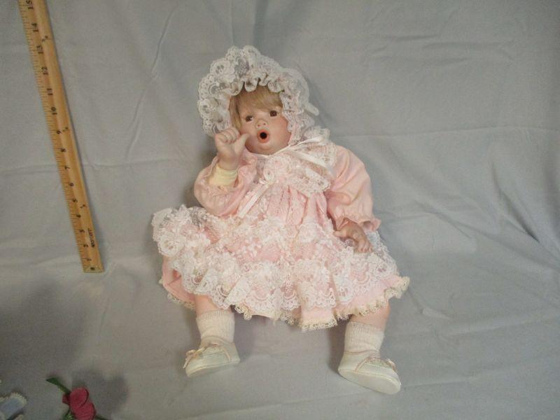 This baby doll is about the size of real baby. She is porcelain except for her torso and is about 19" long.