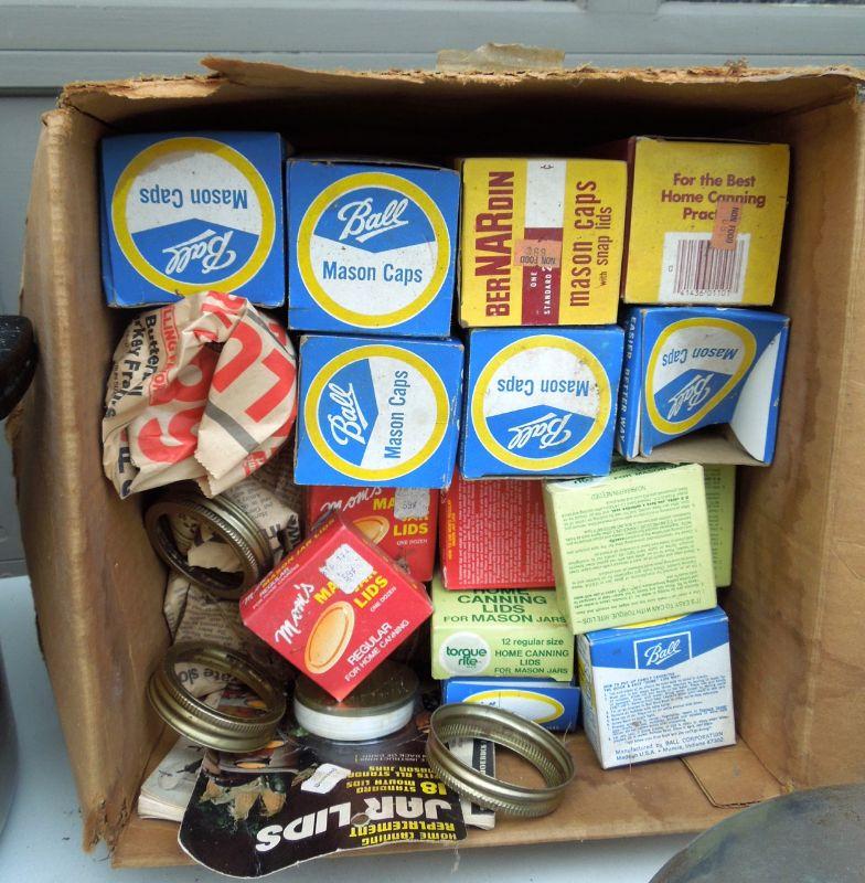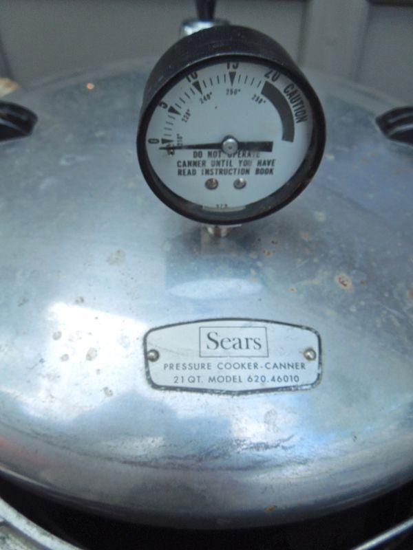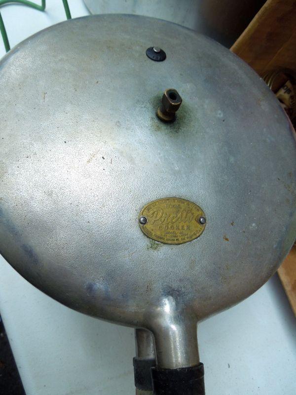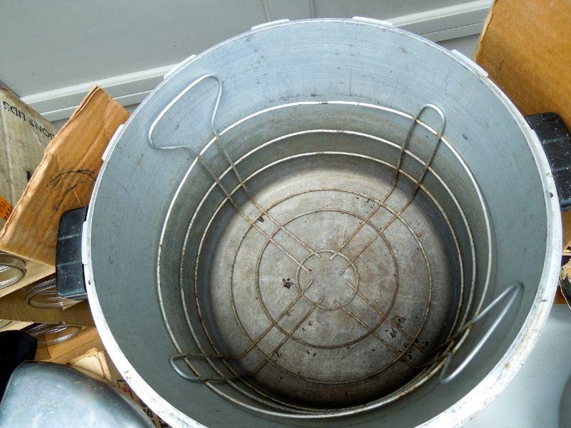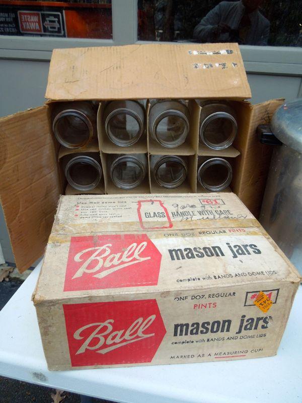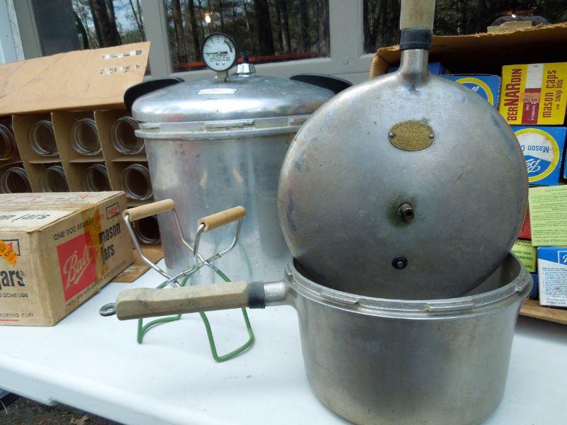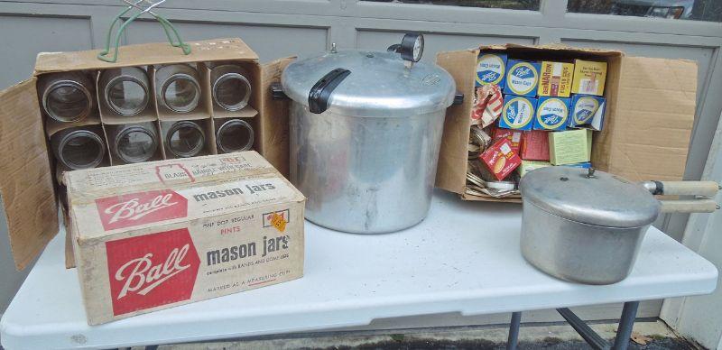 Large pressure cooker for canning with lift rack and lifting tongs. All parts included. Extra smaller vintage wood handled pressure cooker also included. 5 boxes of vintge ball pint jars, 5 boxes quart jars and 2 boxes of 1776 commemorative pint jars. Also large box of rims, ids and seals. Jars are in musty boxes and need cleaning.