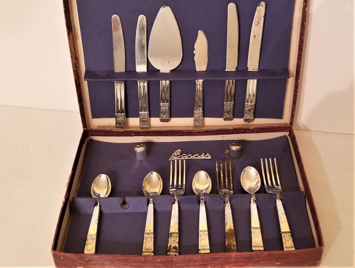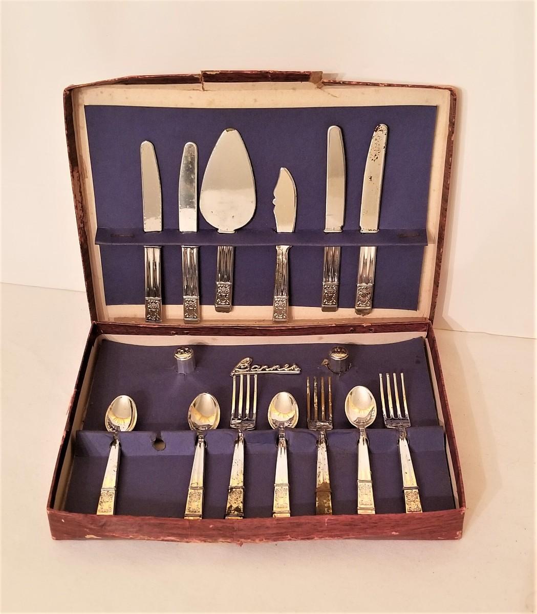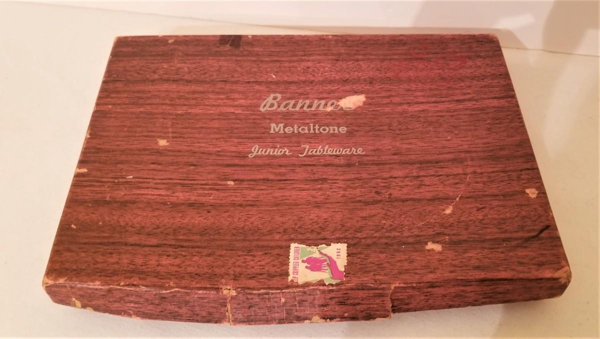 From the 50's or 60's....set of child's play flatware set in original box. Service for 4 with 2 serving pieces and salt/pepper. One 1 fork is missing. For scale, the average piece is 4" long. Pieces are plastic with silver flashing. Name on the box is "Banner Metaltone Junior Tableware."