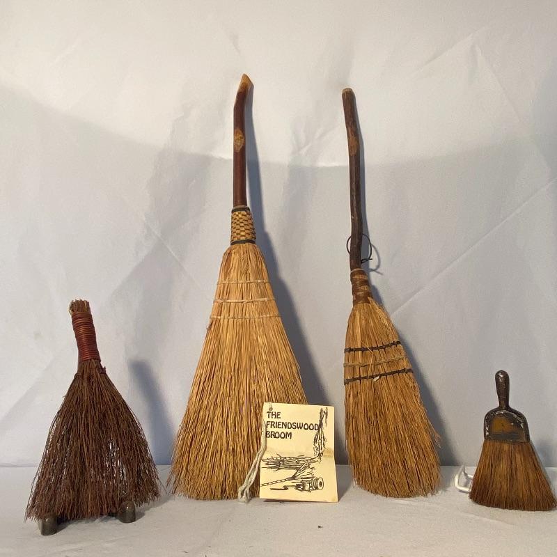 Enjoy traditional handcrafted brooms. This lot includes the Friendswood Broom along with three additional hand-held brooms. The large Friendswood Broom measurements are 30” long. Smallest broom measures to be 9” long. Shipping available!