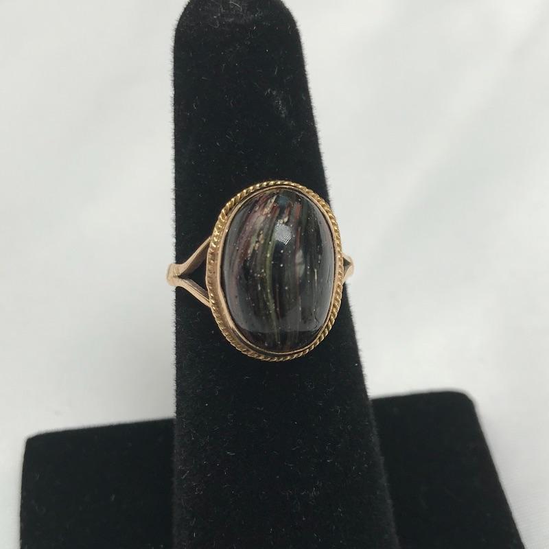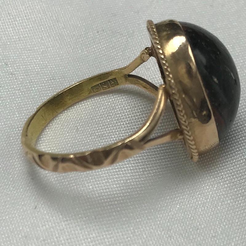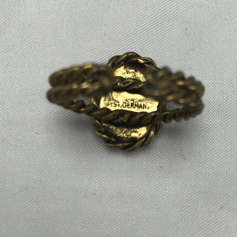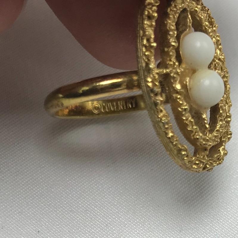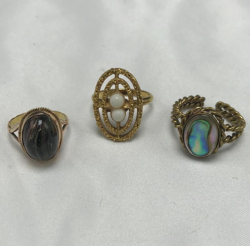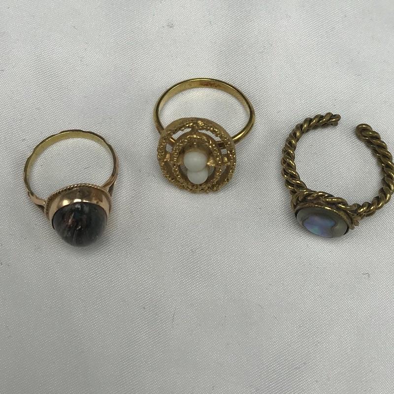 Three statement pieces of gold fashion rings. The dark oval stone ring is size 6.5 and marked with symbols, see photos. The ring marked “Coventry” is size 7 and the final rope ring marked “West Germany” is size 8.