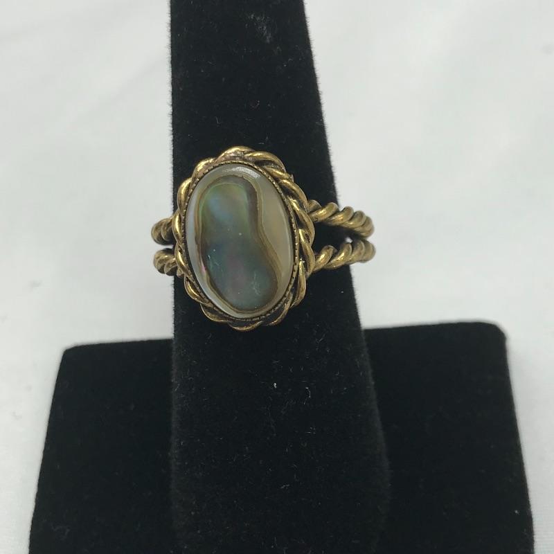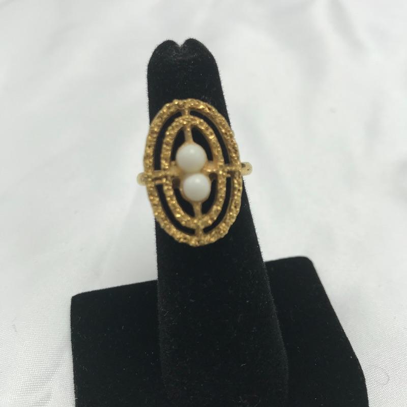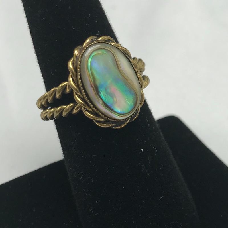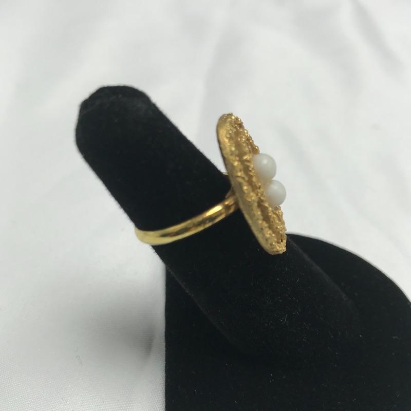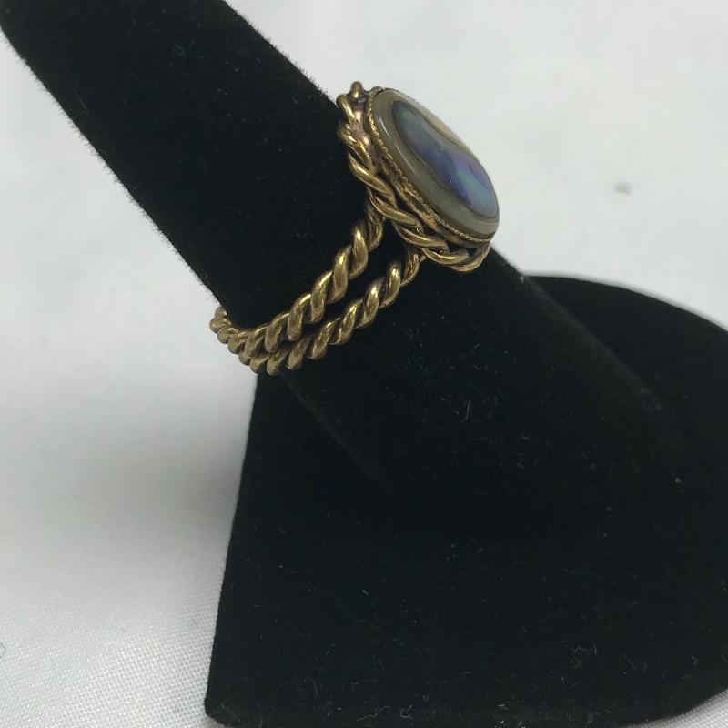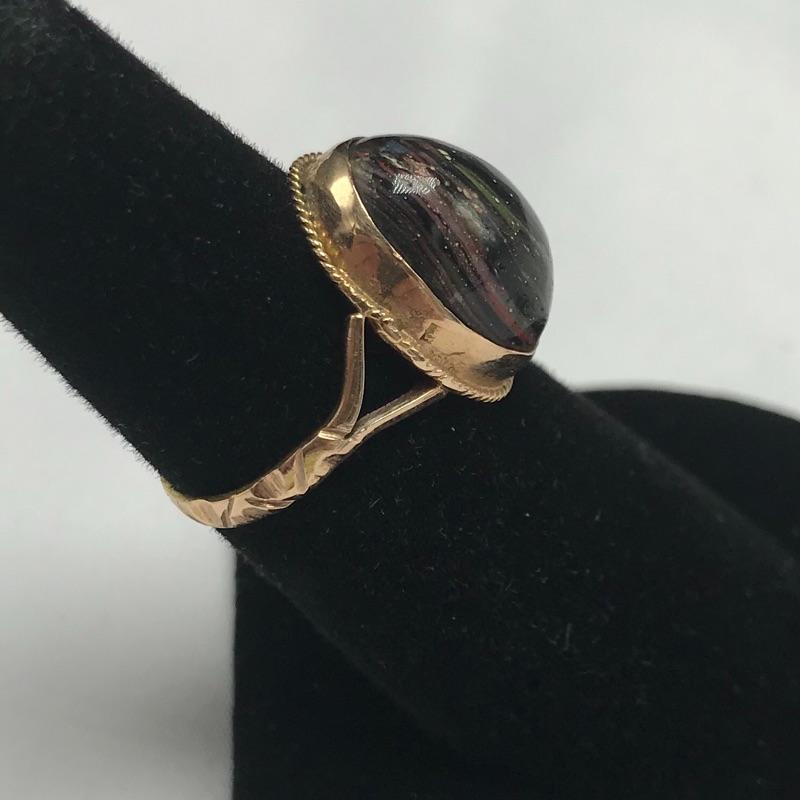 Three statement pieces of gold fashion rings. The dark oval stone ring is size 6.5 and marked with symbols, see photos. The ring marked “Coventry” is size 7 and the final rope ring marked “West Germany” is size 8.