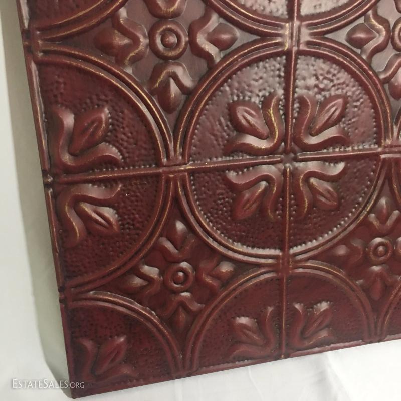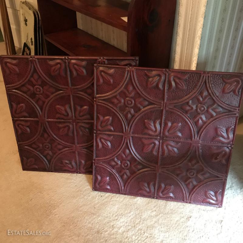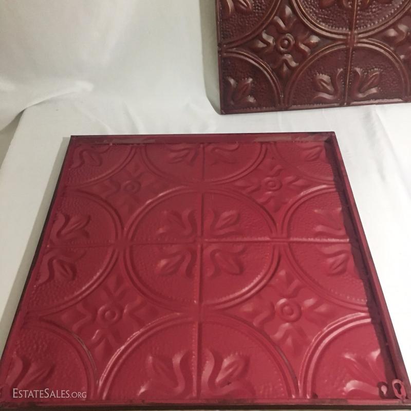 Two red tin wall art pieces. 24" squares.
