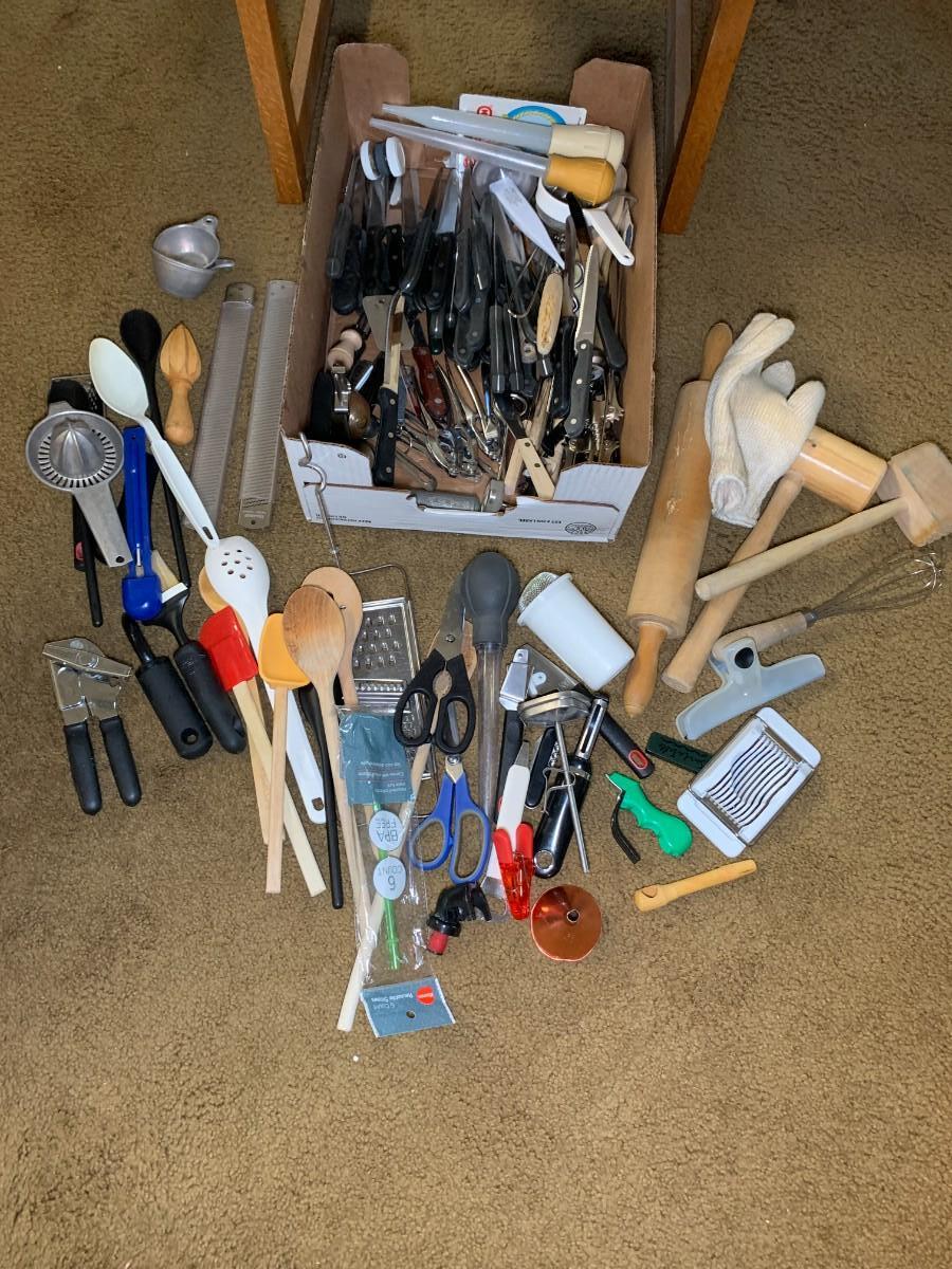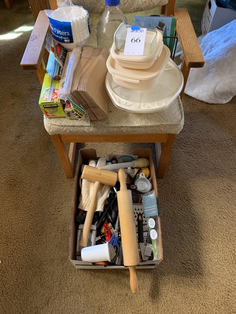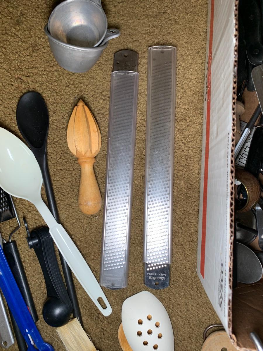 Food storage containers, including paper and plastic bags. Rolling pin, wood mallet. Glass jar with lid. 2 Micrograter blades (handle not seen). Assorted steak knives, wine openers, crab crackers. More as shown.