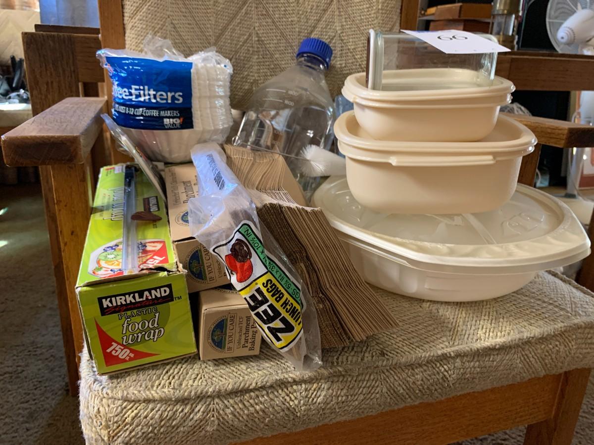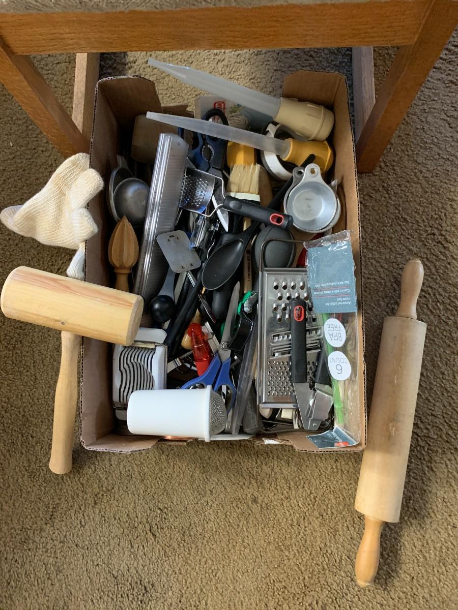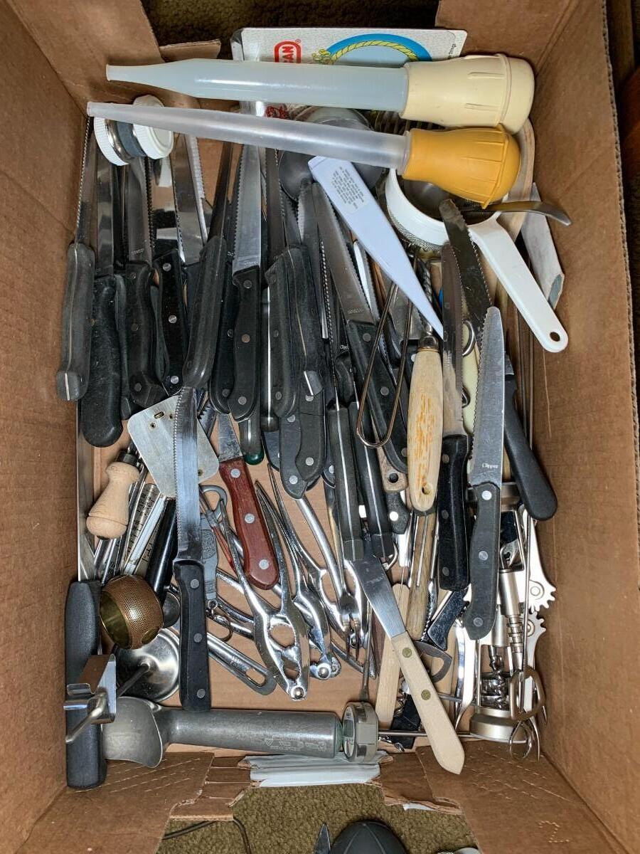 Food storage containers, including paper and plastic bags. Rolling pin, wood mallet. Glass jar with lid. 2 Micrograter blades (handle not seen). Assorted steak knives, wine openers, crab crackers. More as shown.