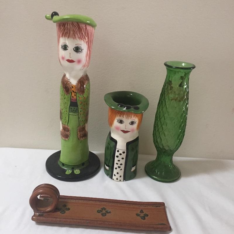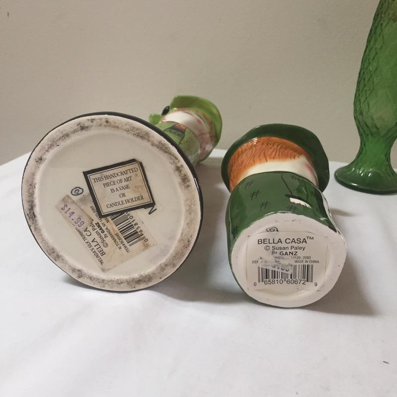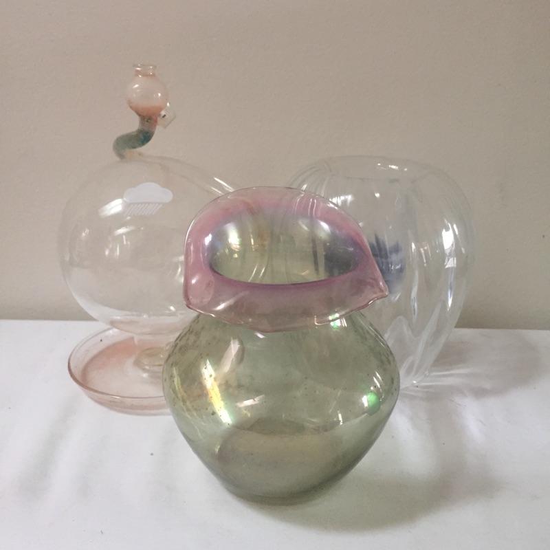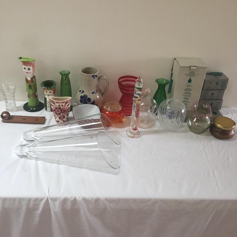 Fun eclectic mix. Includes a pair of glass hanging vases , Galileo thermometer, vases , candles and holder and more. Hanging vases measure 15” tall. Some pieces are signed. Brighten up your house with this great assortment of vases , candles and more.